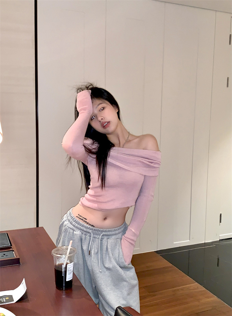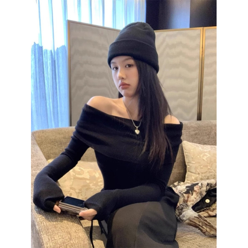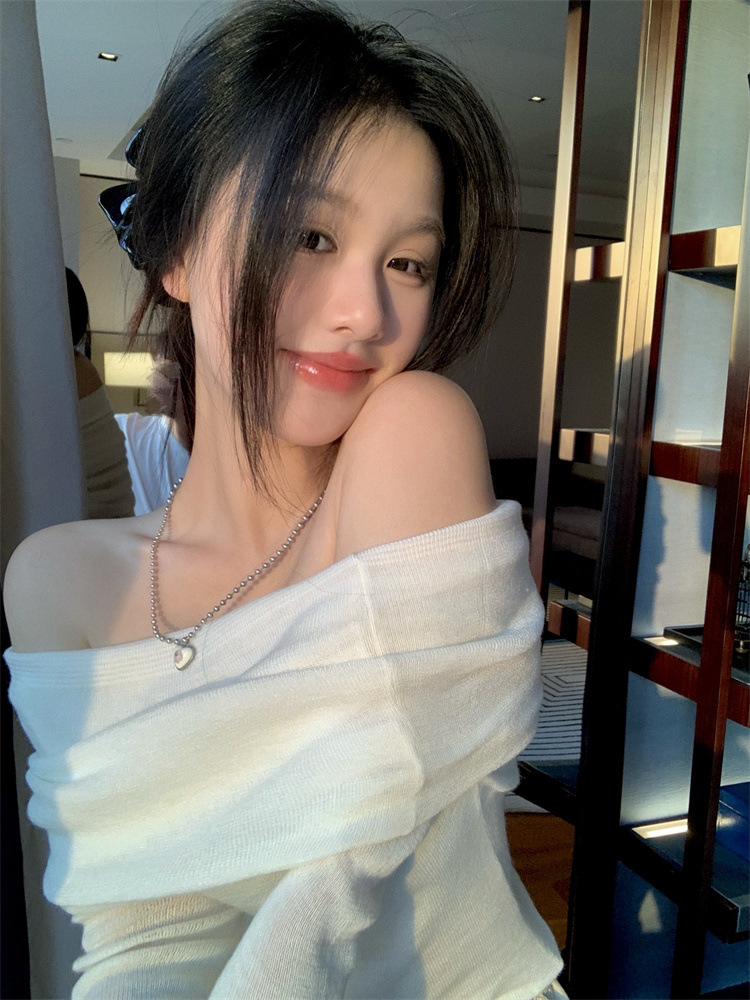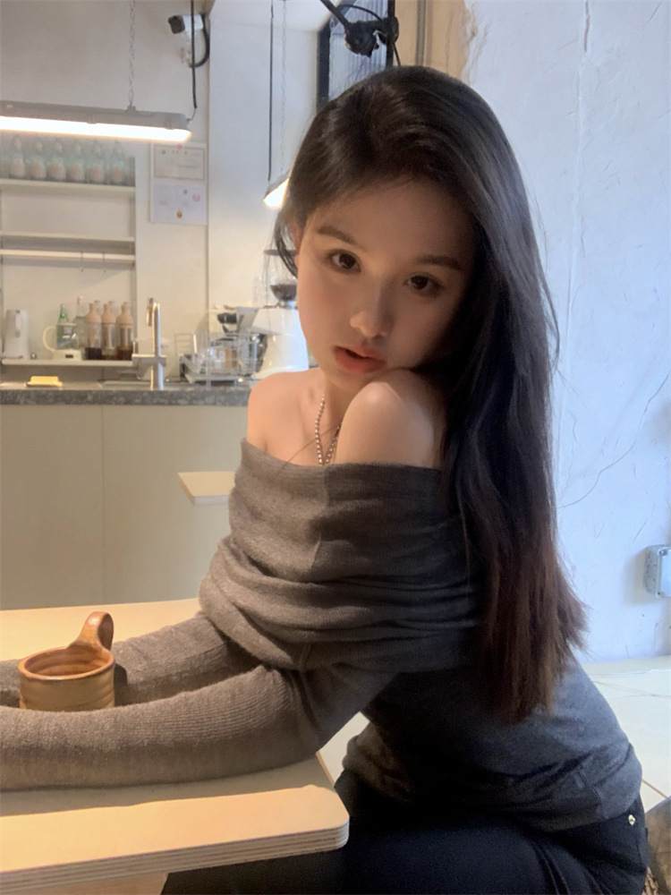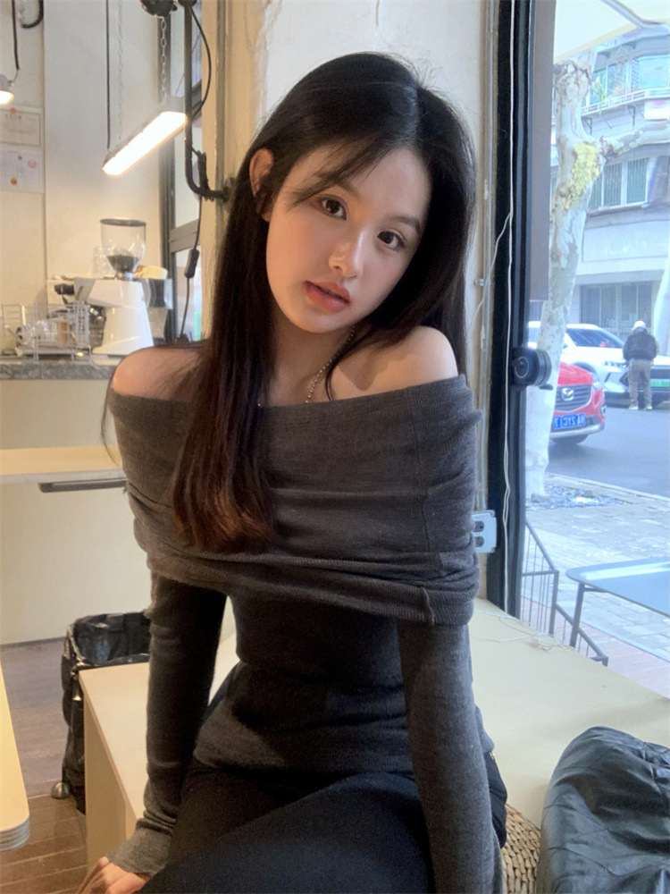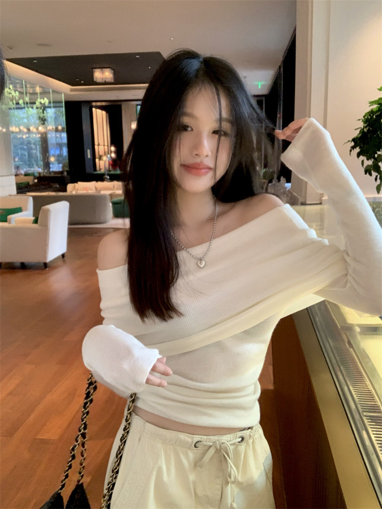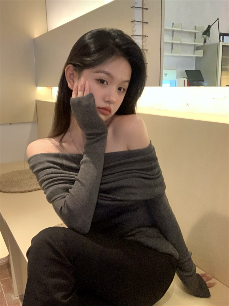 프랑스 세련된 우아한 부드러운 오프 숄더 니트웨어 여성용 스프링 슬림 핏 슬리밍 하이 엔드 플리츠 오프 숄더 탑스토어 가기
