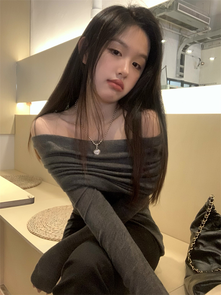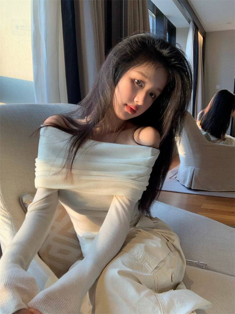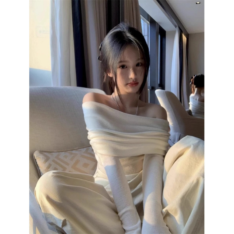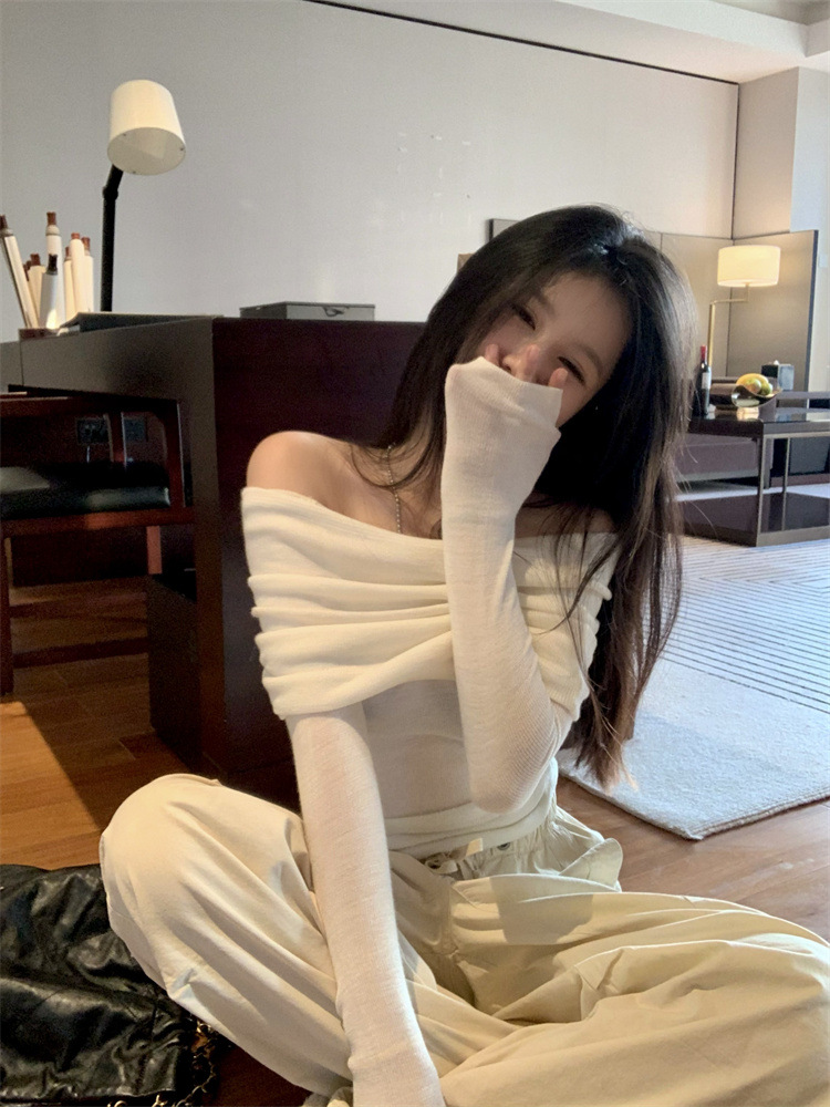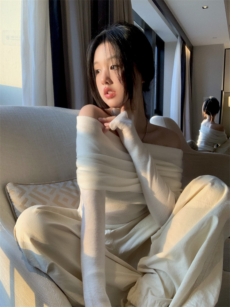 프랑스 세련된 우아한 부드러운 오프 숄더 니트웨어 여성용 스프링 슬림 핏 슬리밍 하이 엔드 플리츠 오프 숄더 탑