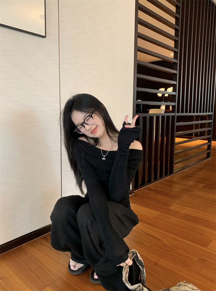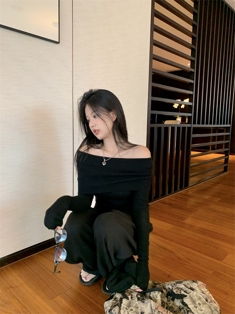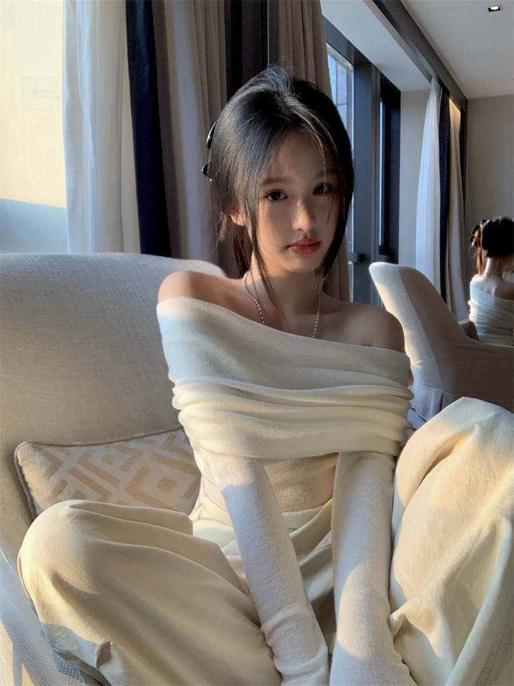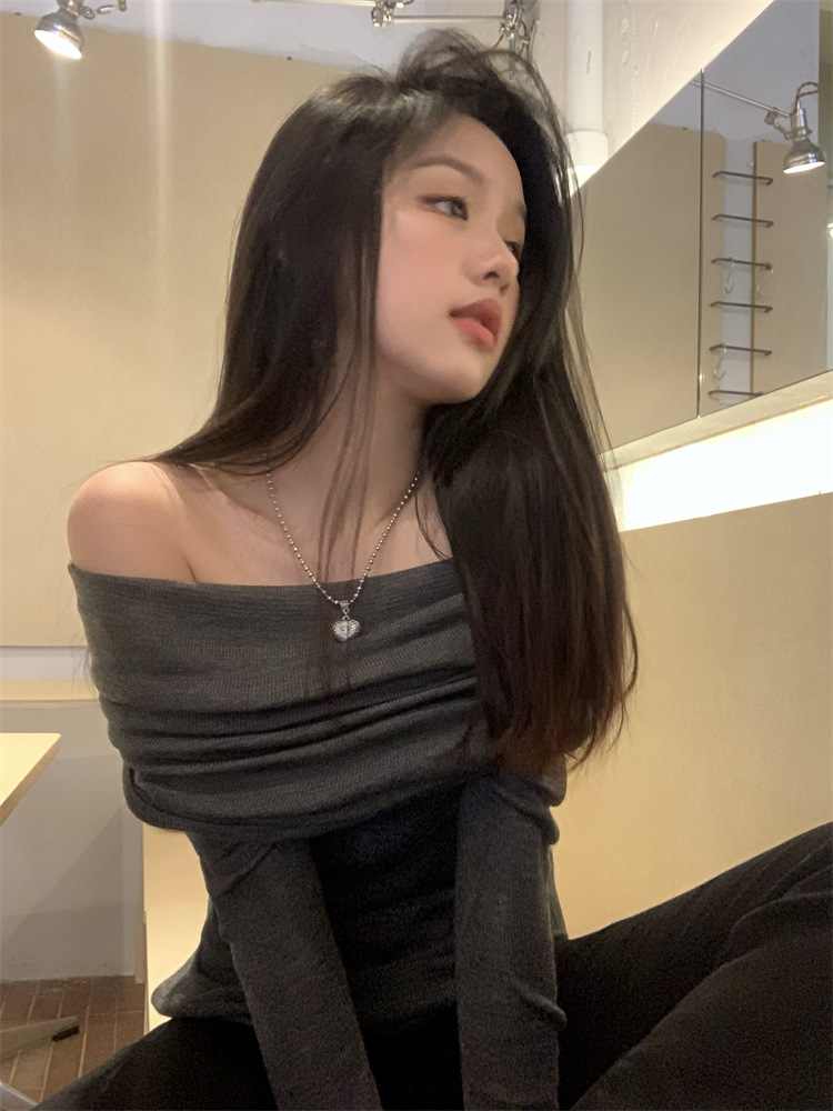 프랑스 세련된 우아한 부드러운 오프 숄더 니트웨어 여성용 스프링 슬림 핏 슬리밍 하이 엔드 플리츠 오프 숄더 탑