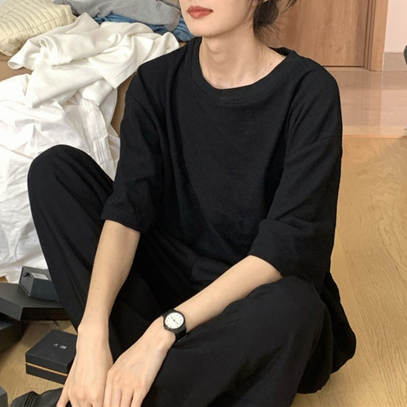 와플 반팔 라운드 넥 백 백 백 칼라 여름 탑 소녀 커플 티셔츠 게으른 스타일 느슨한 올 매치 여성 의류