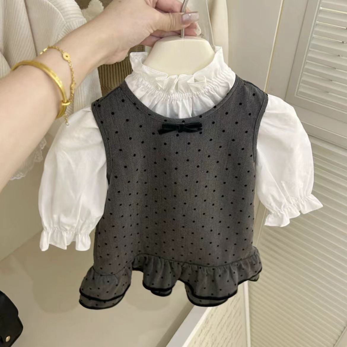 여자 봄 세트 새로운 2025 한류 도트 조끼 인형 셔츠 투피스 여성용 아기 치마 세트