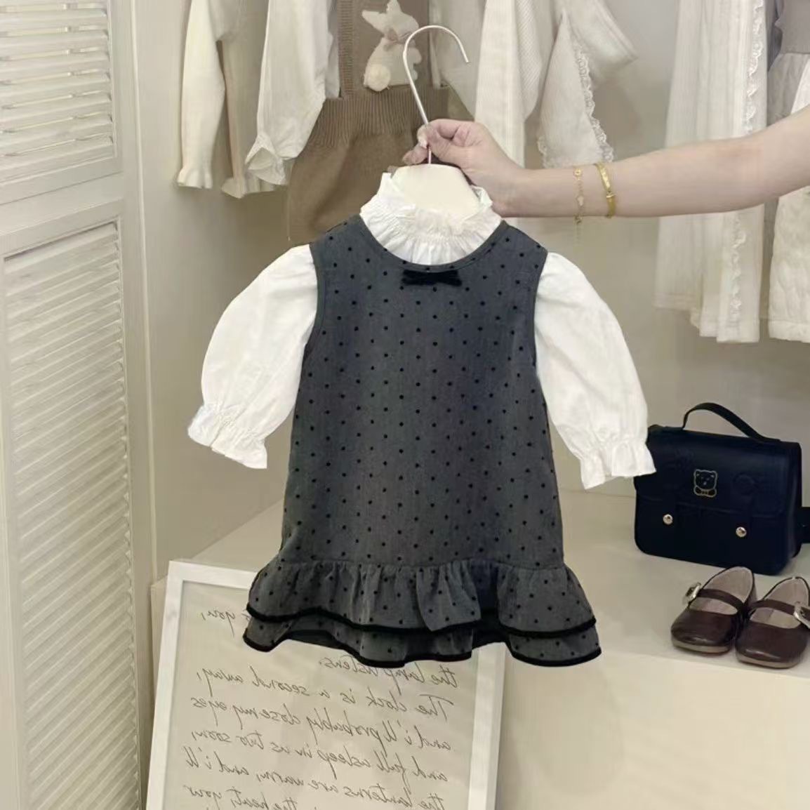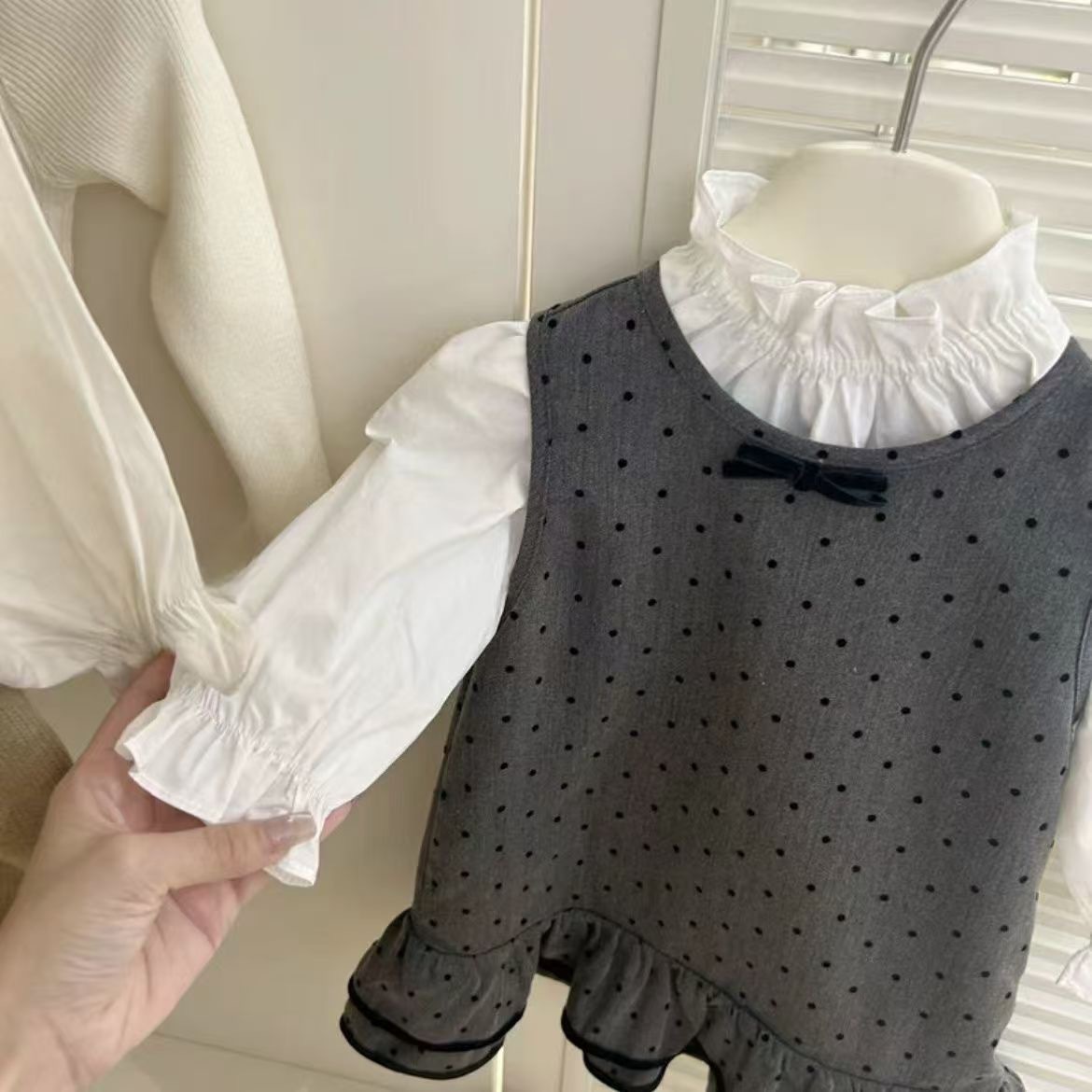 여자 봄 세트 새로운 2025 한류 도트 조끼 인형 셔츠 투피스 여성용 아기 치마 세트스토어 가기
