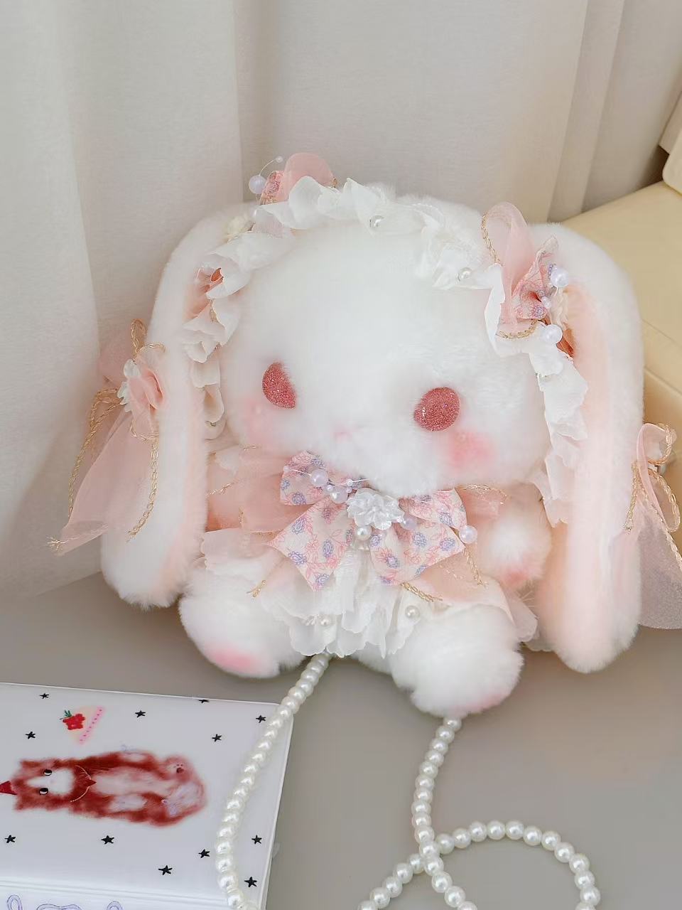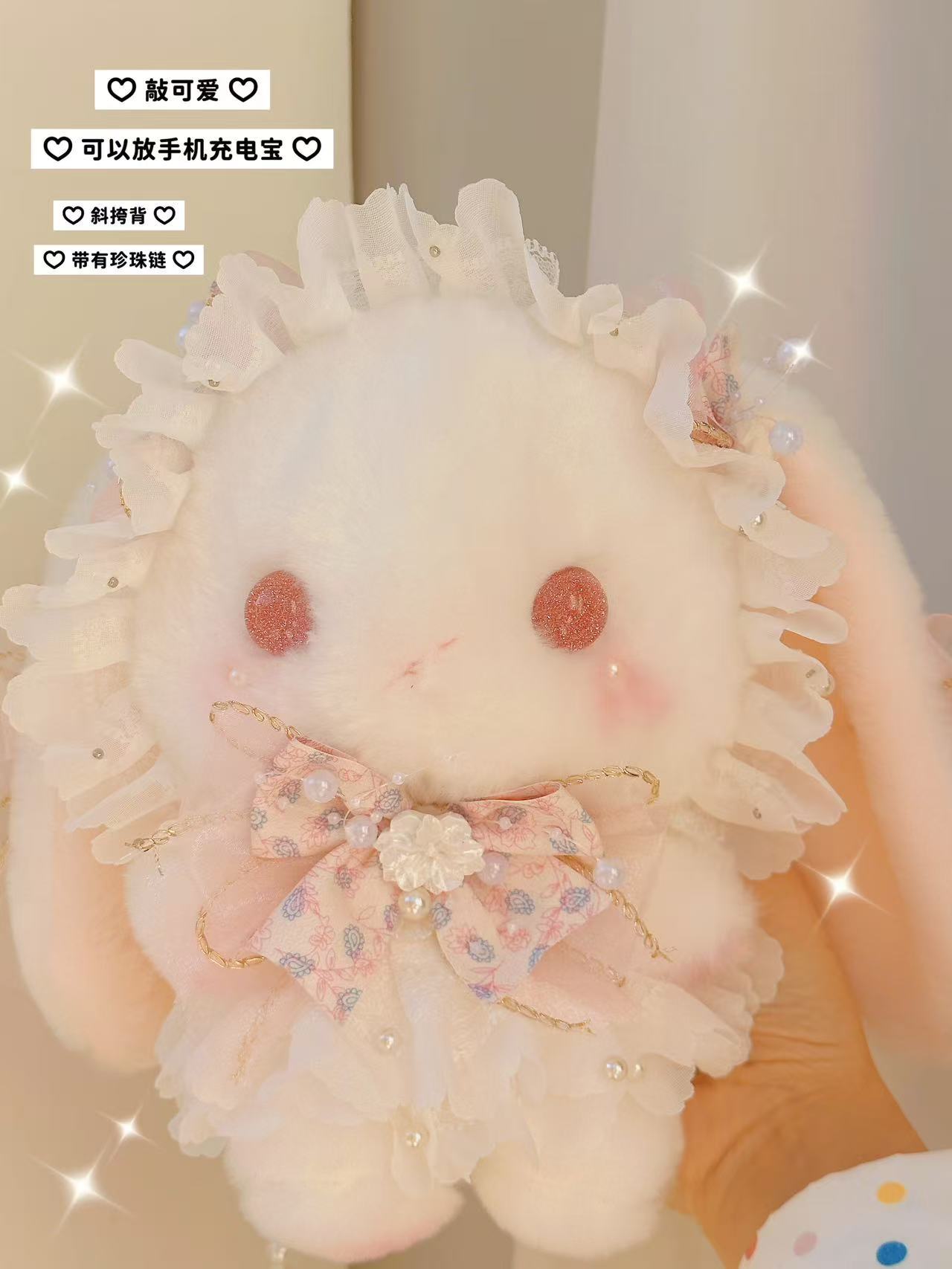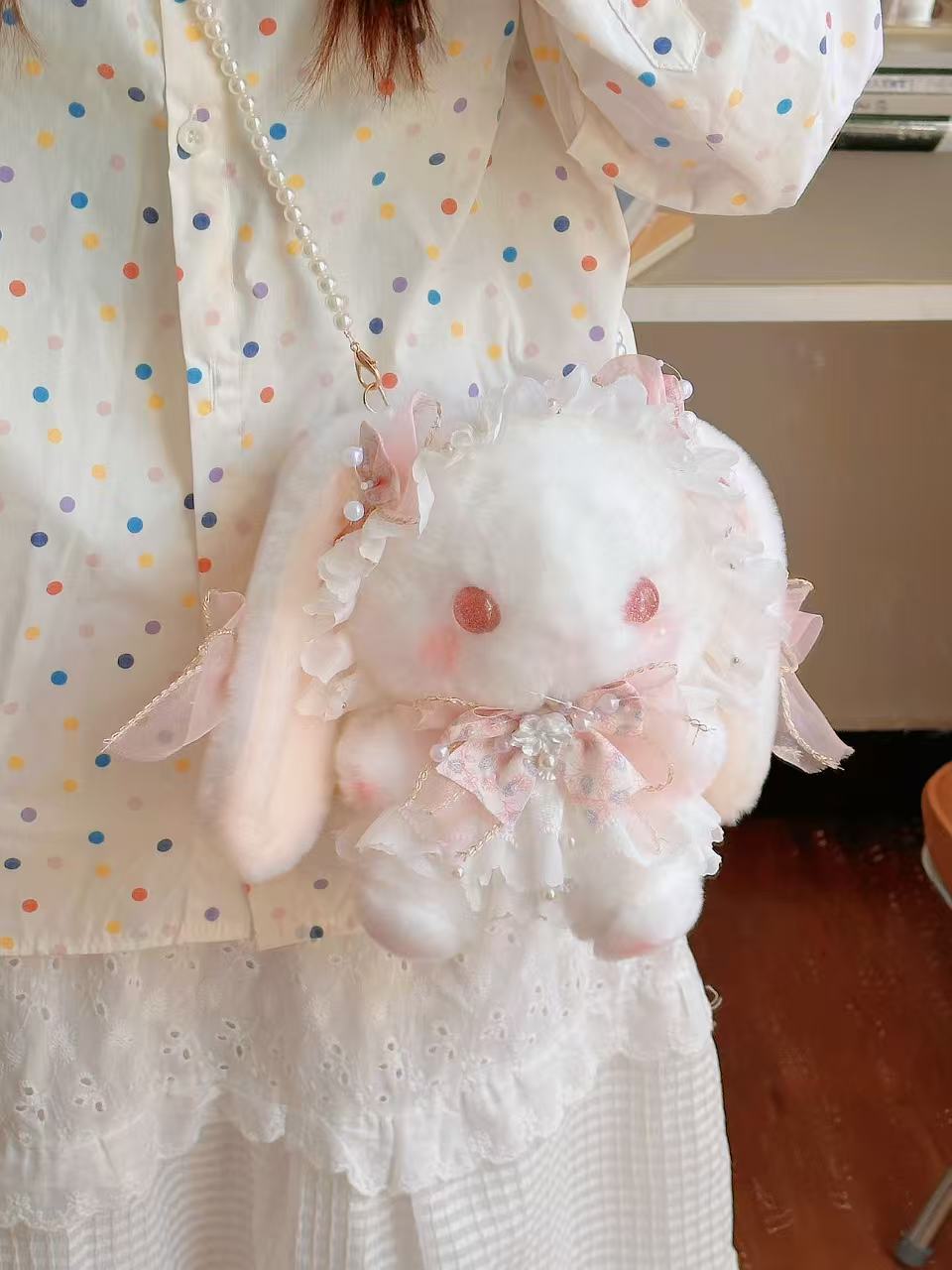 모리 소녀 스타일 진주 체인 만화 로리타 토끼 인형 가방 서양식 작은 꽃 봉제 크로스 바디 가방 귀여운