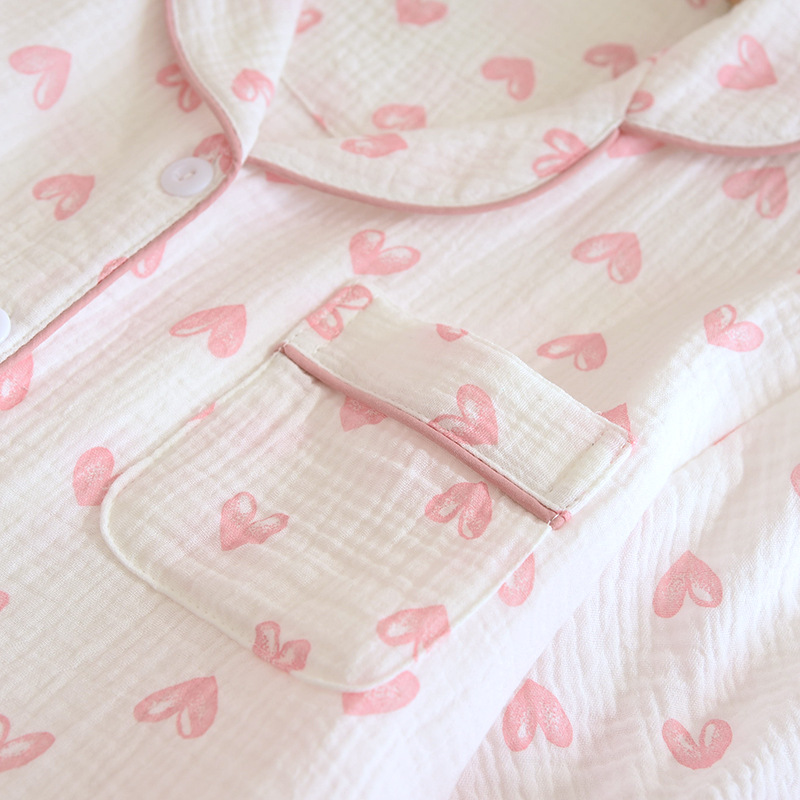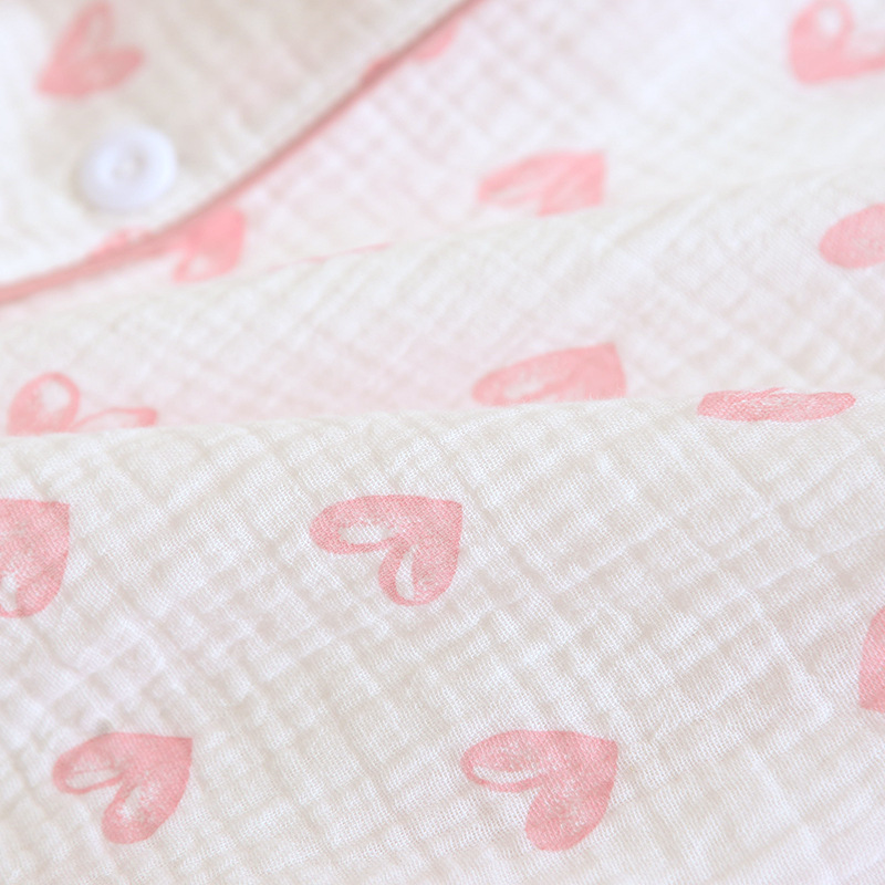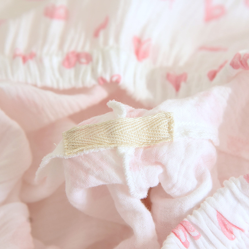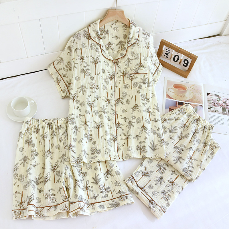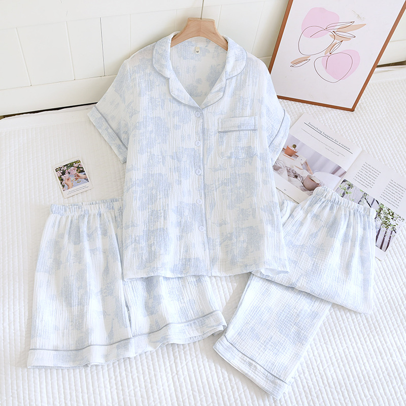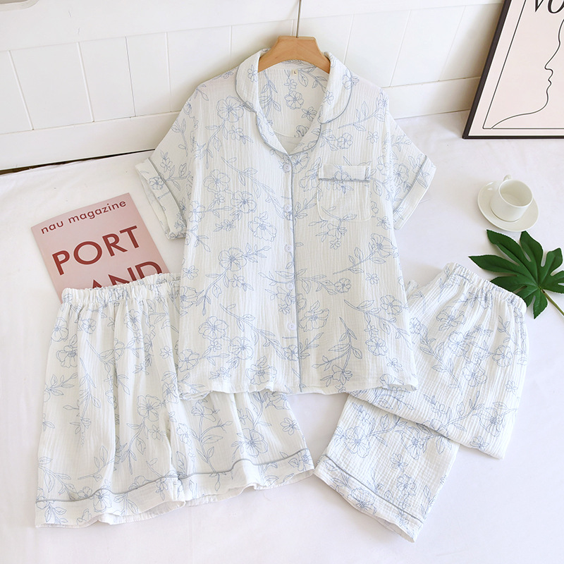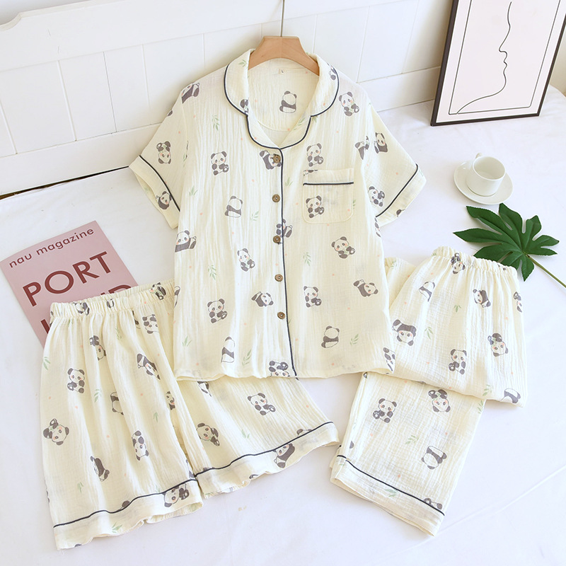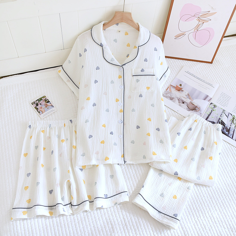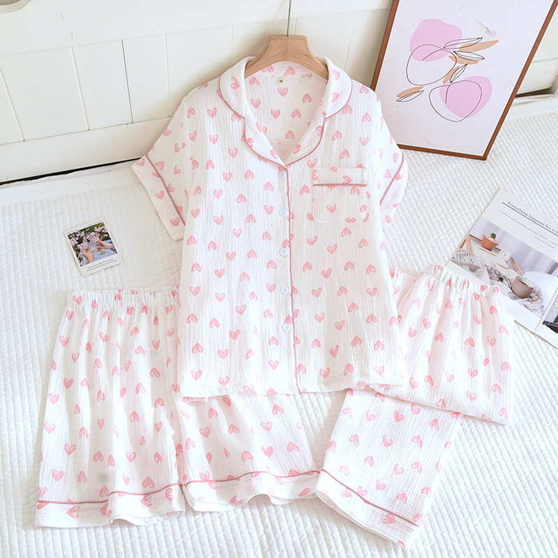 다양한 스타일 봄과 여름 코튼 크레이프 파자마 달콤한 3 조각 반팔 바지 봄과 가을 느슨한 캐주얼 세트