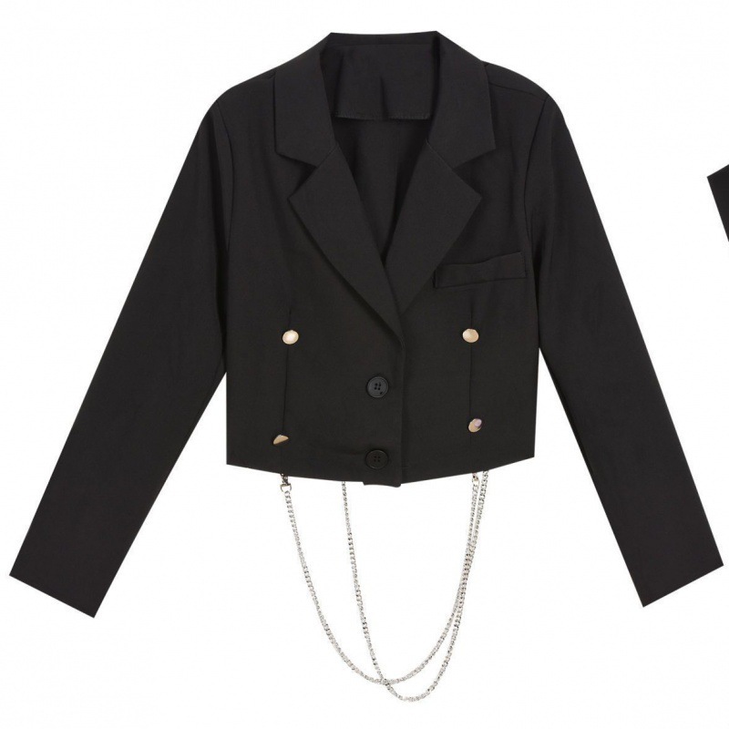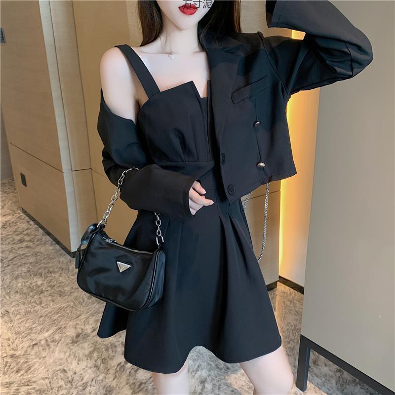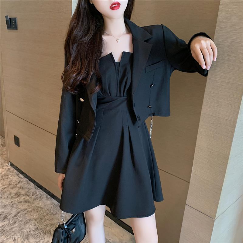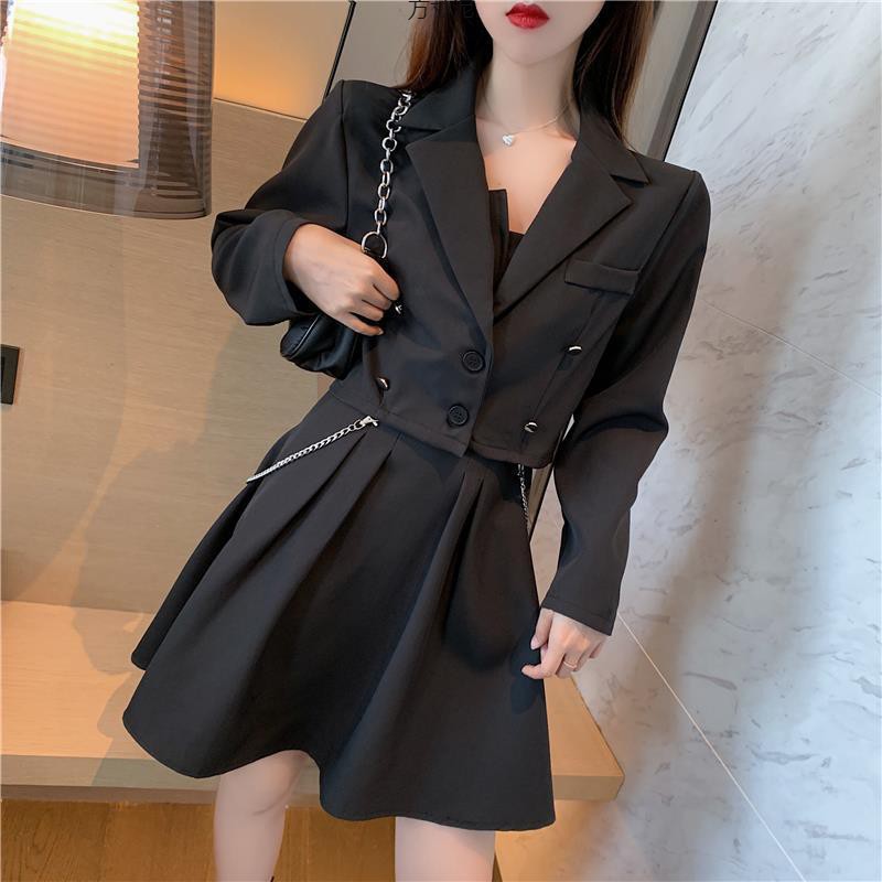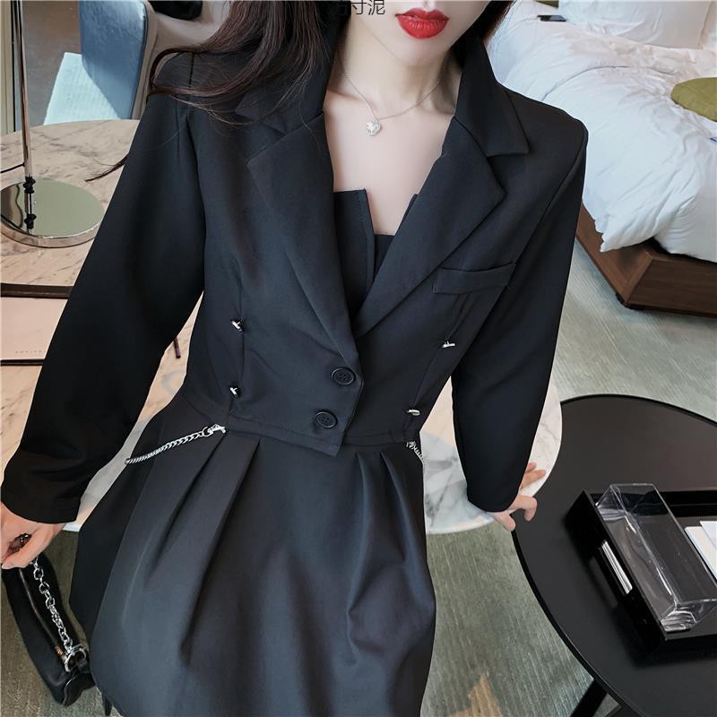 가을 2024 새로운 여성 체인 긴 소매 짧은 세트 자켓베이스 스트랩 튜브 탑 원피스 세트