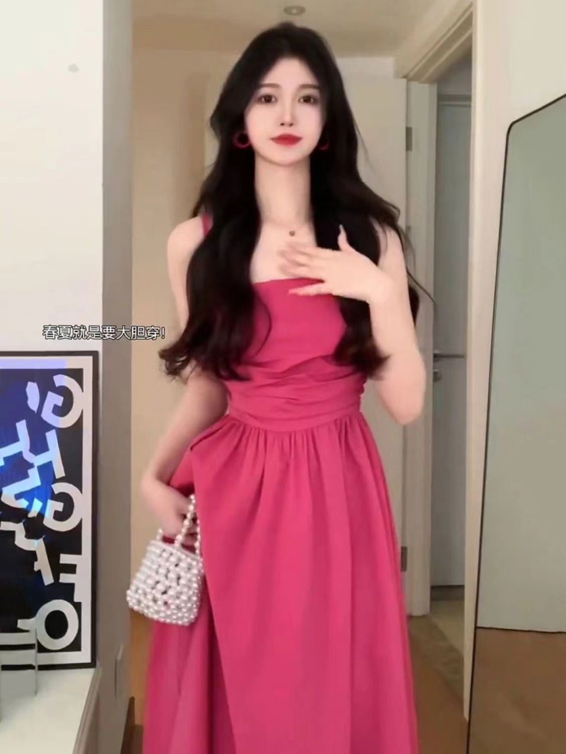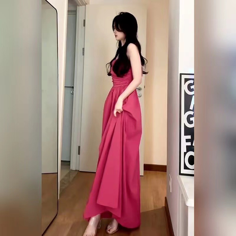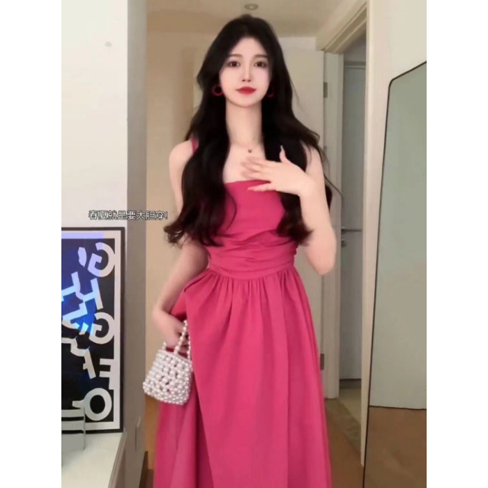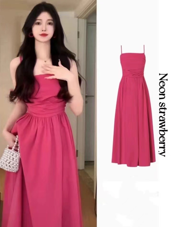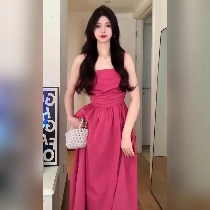2025 년 여름 새로운 허리 슬리밍 해변 휴가 긴 원피스 티 브레이크 프랑스 로즈 레드 슬링 원피스 어린이스토어 가기