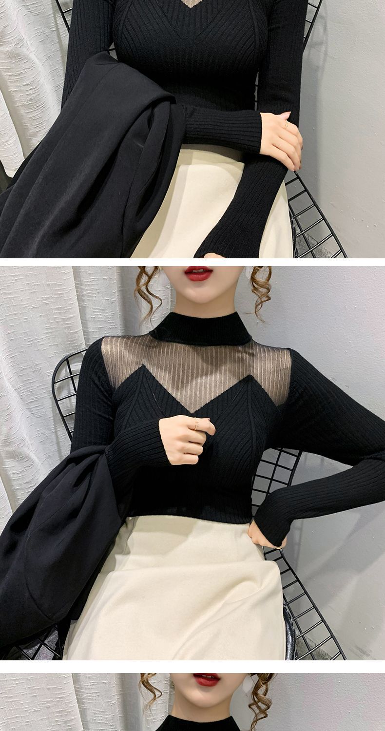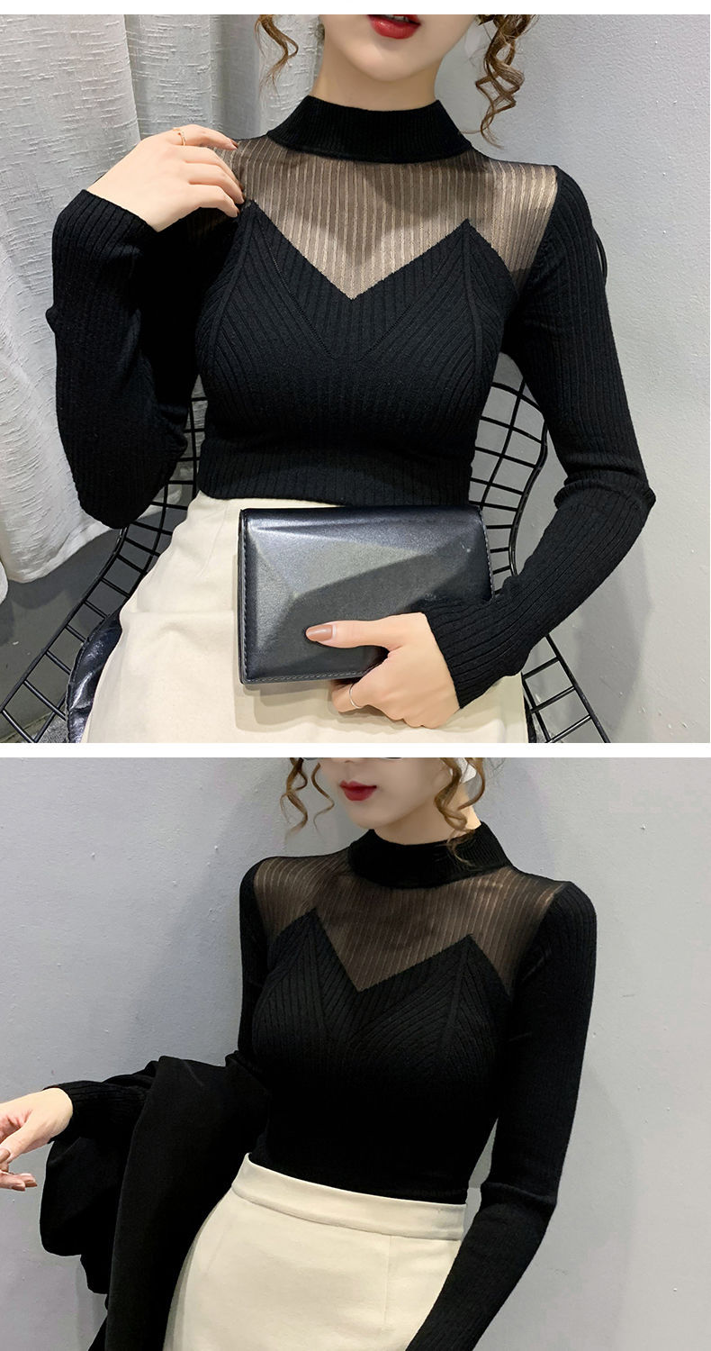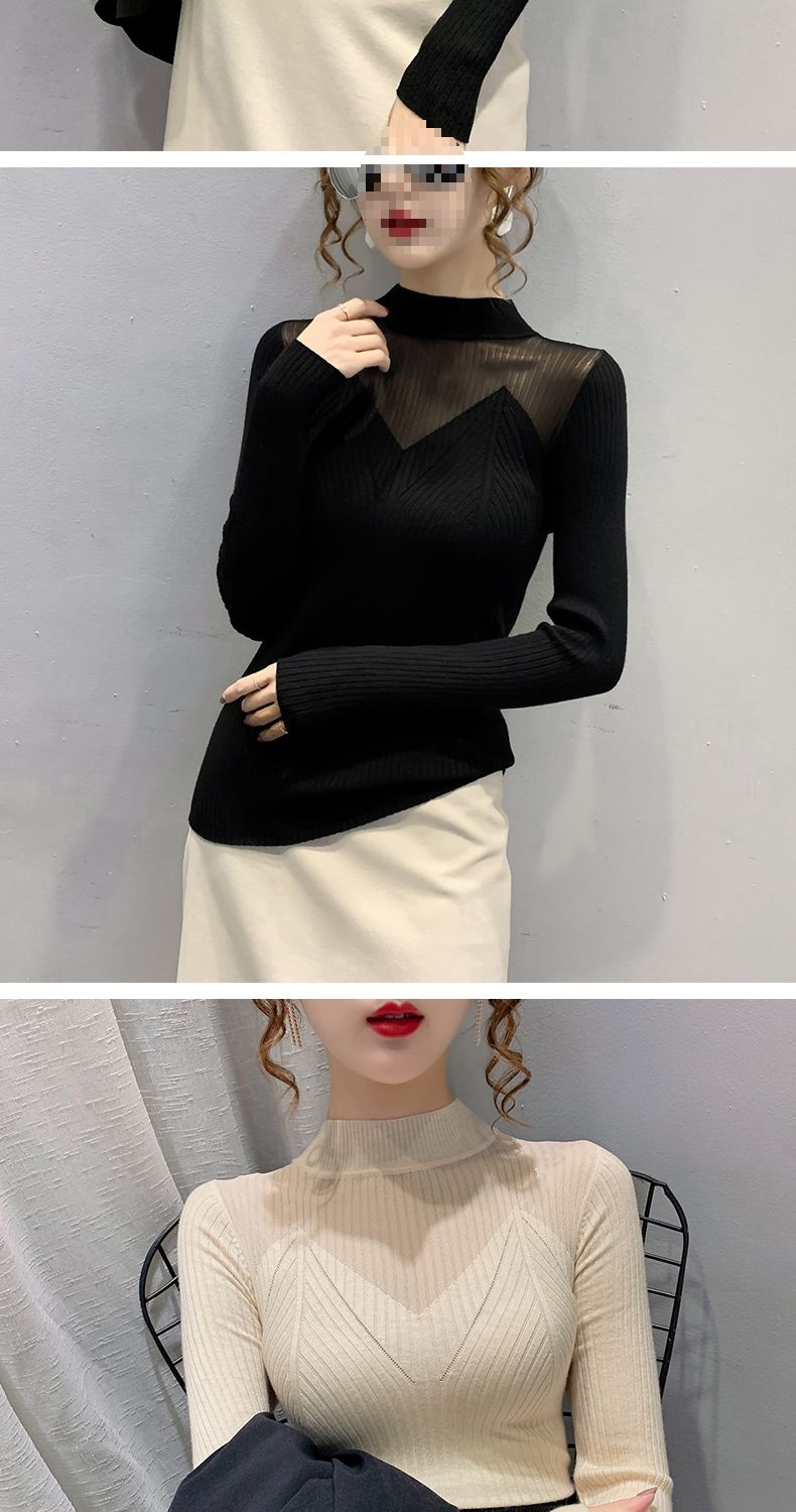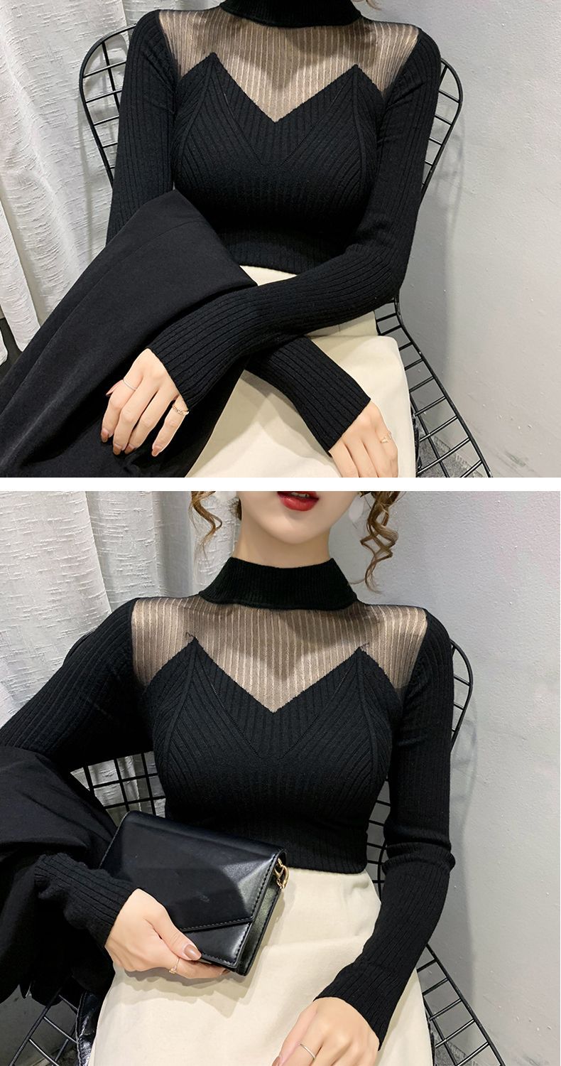 하프 터틀넥 메쉬 할로우 스웨터 여성의 가을 및 겨울 새로운 한국 스타일 조각 레이스 내부 니트 베이스 셔츠 여성용 탑