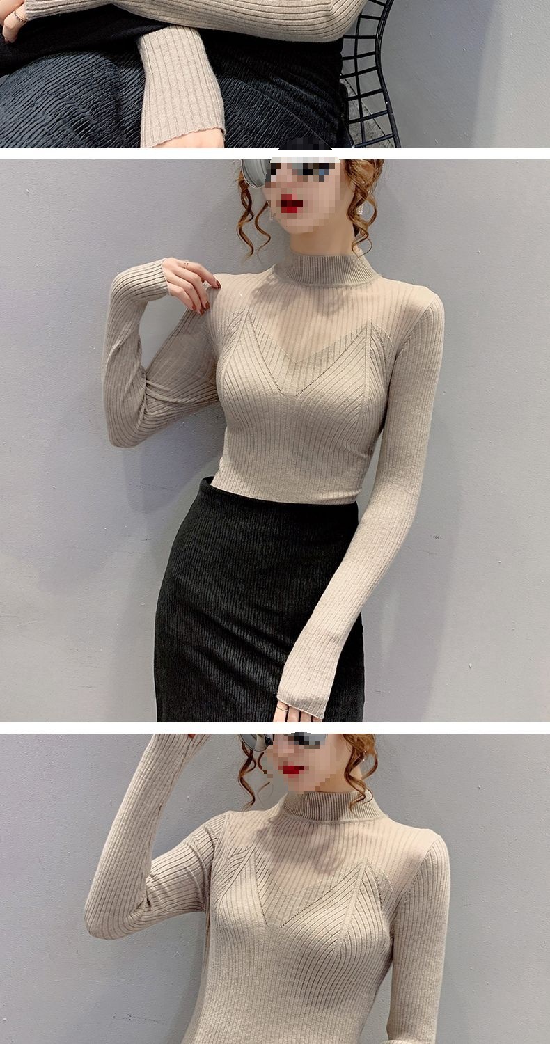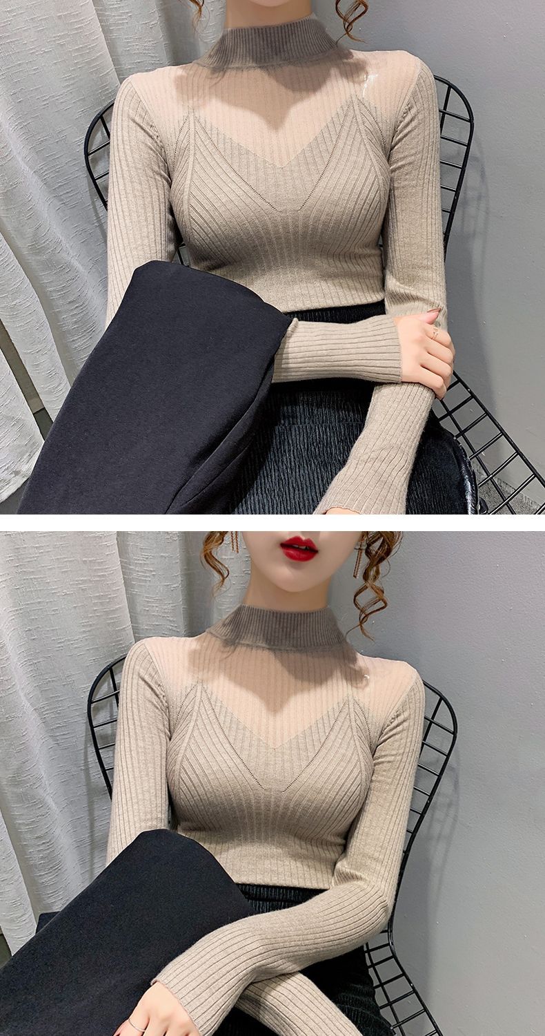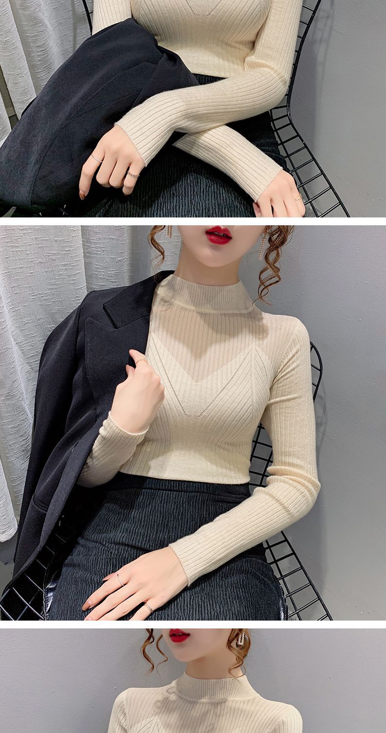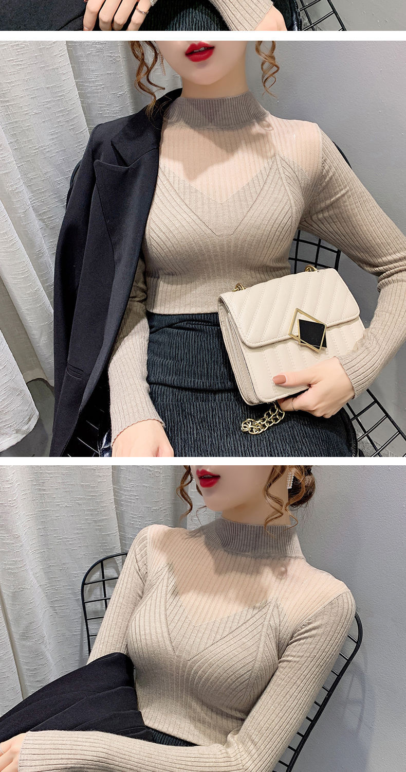 하프 터틀넥 메쉬 할로우 스웨터 여성의 가을 및 겨울 새로운 한국 스타일 조각 레이스 내부 니트 베이스 셔츠 여성용 탑