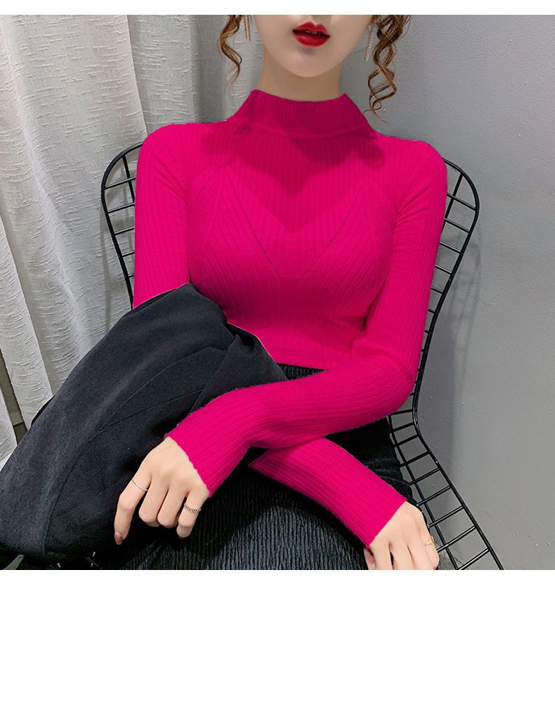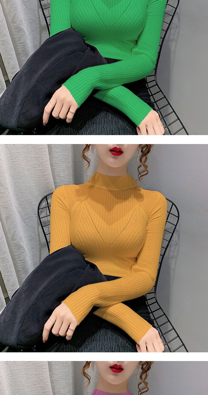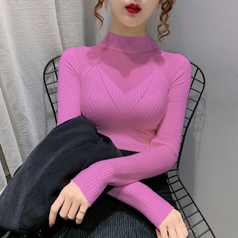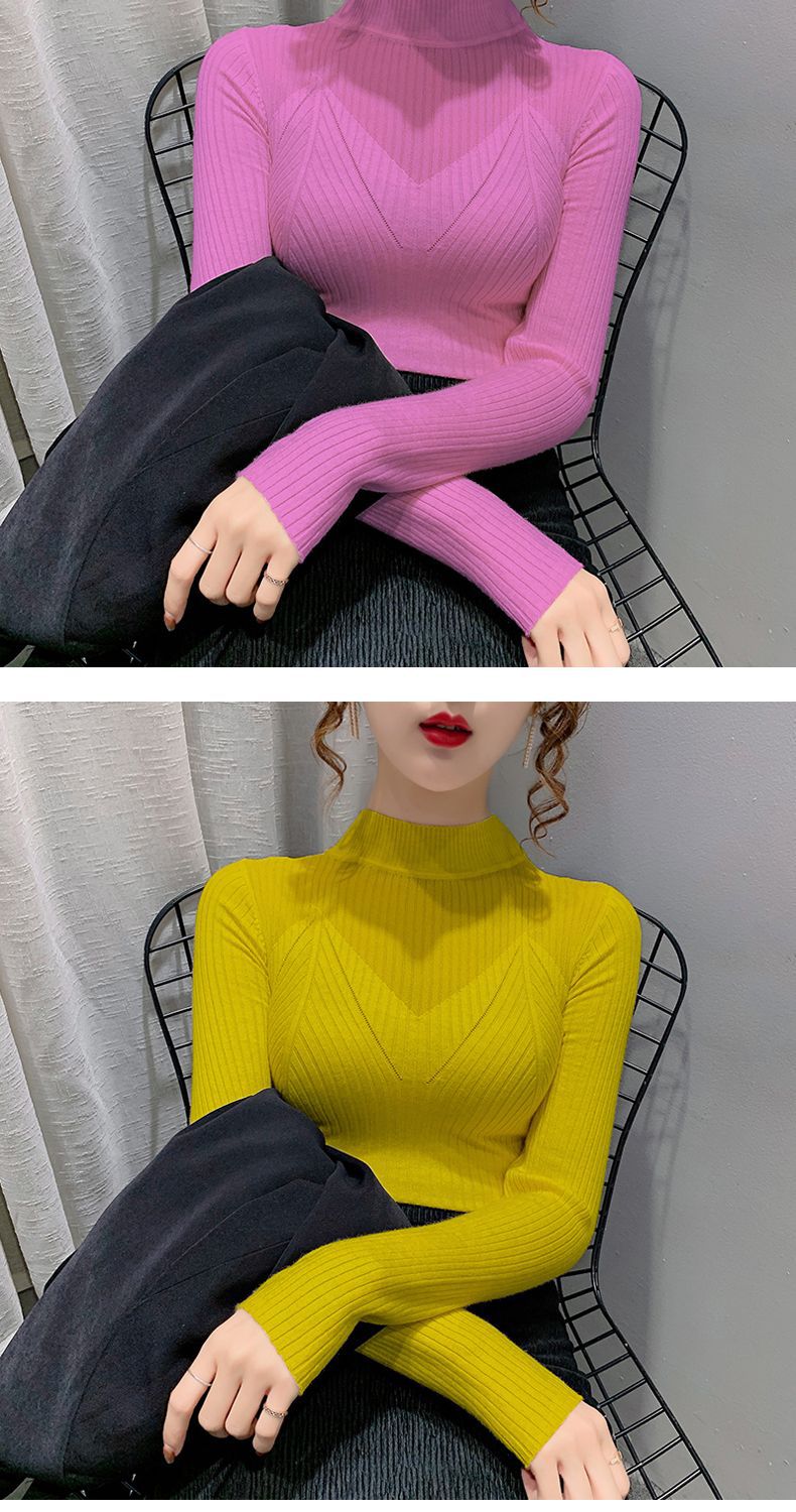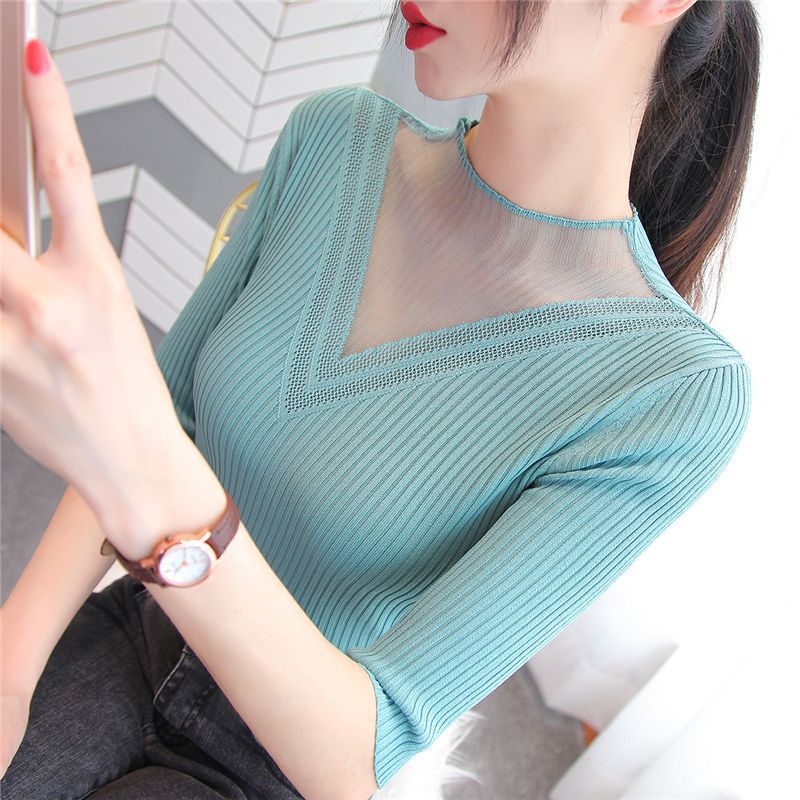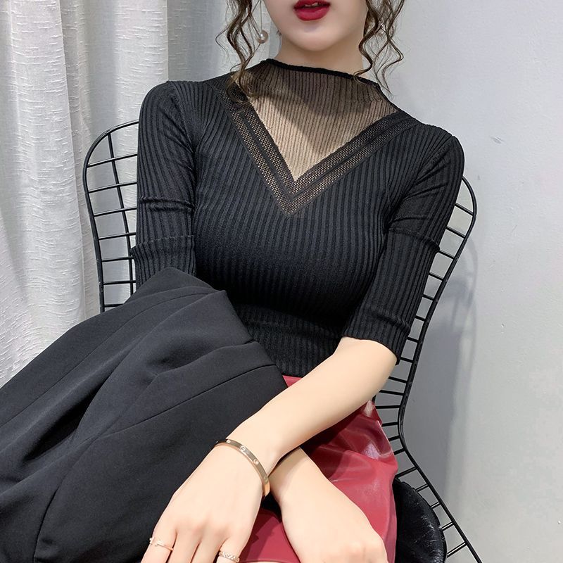하프 터틀넥 메쉬 할로우 스웨터 여성의 가을 및 겨울 새로운 한국 스타일 조각 레이스 내부 니트 베이스 셔츠 여성용 탑
