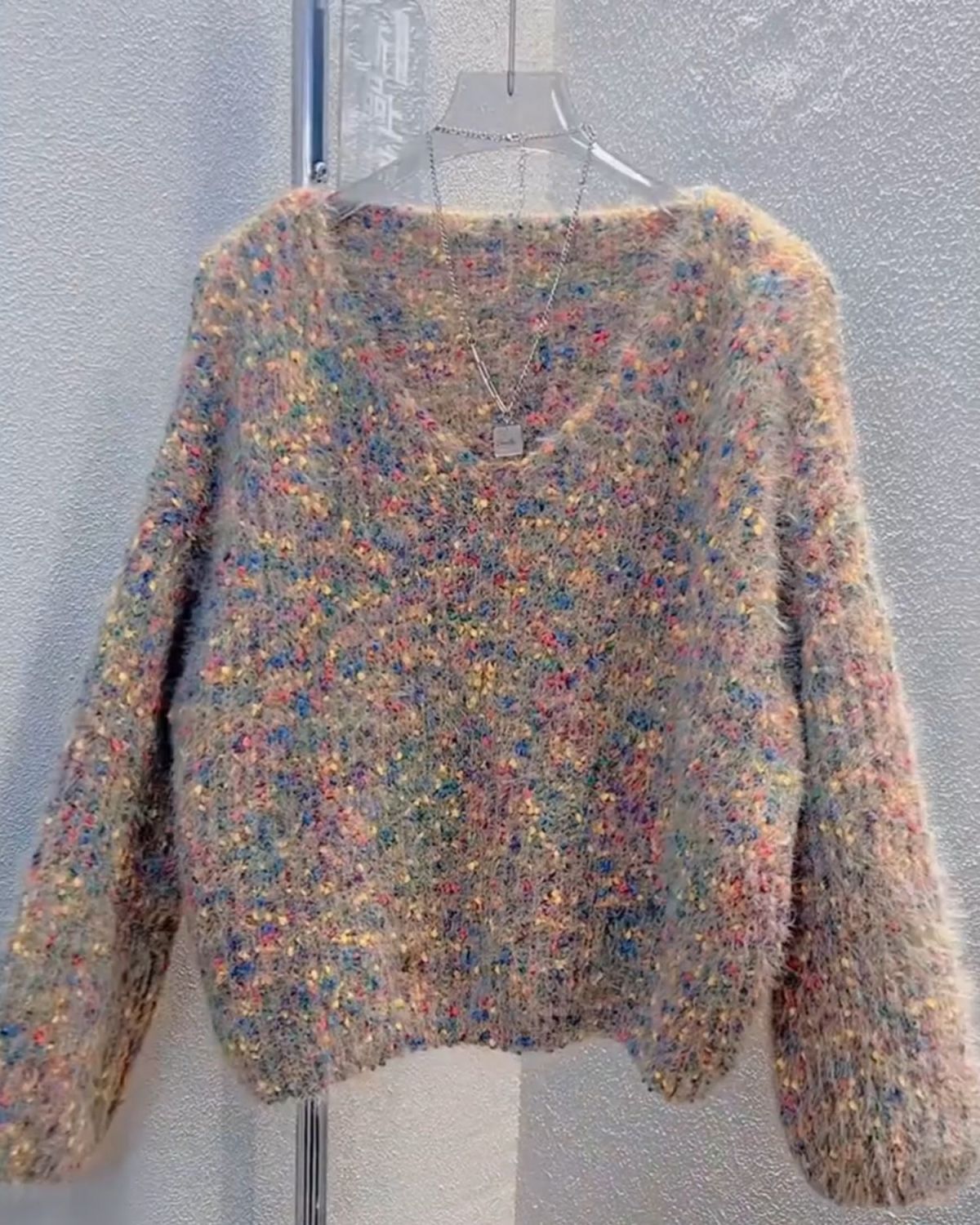 게으른 스타일 고급 컬러 도트 스웨터 여성의 봄과 가을 V-Neck 풀오버 짧은 두꺼운 탑 니트 스웨터