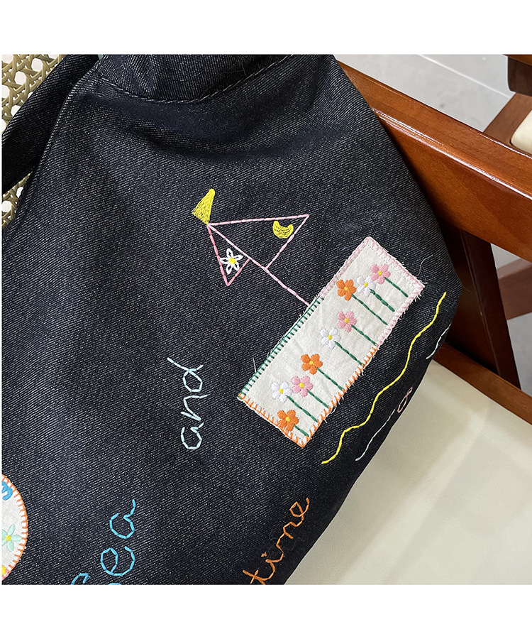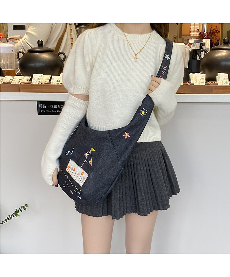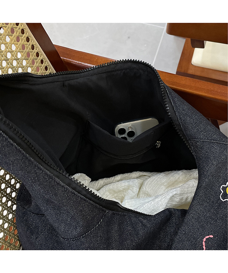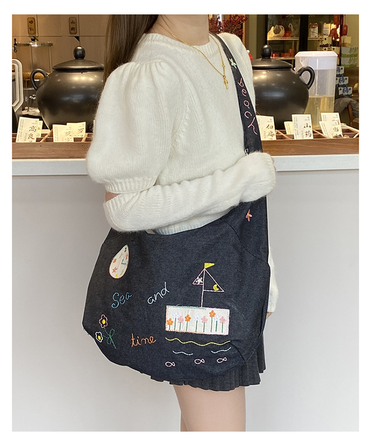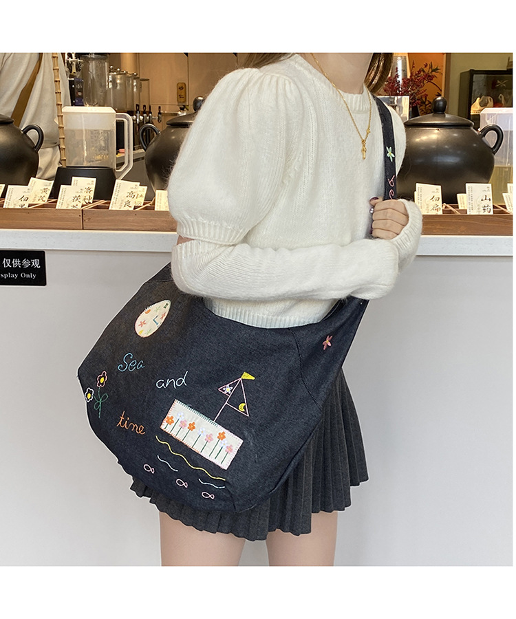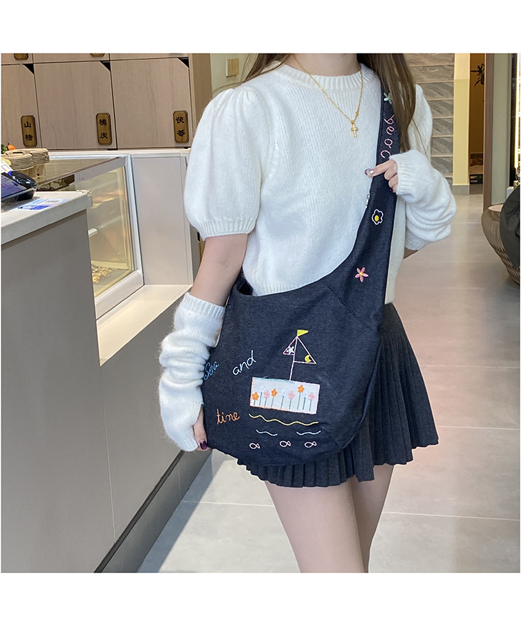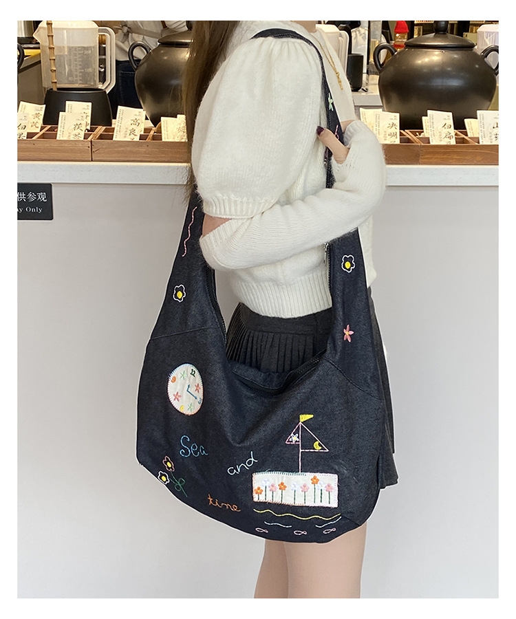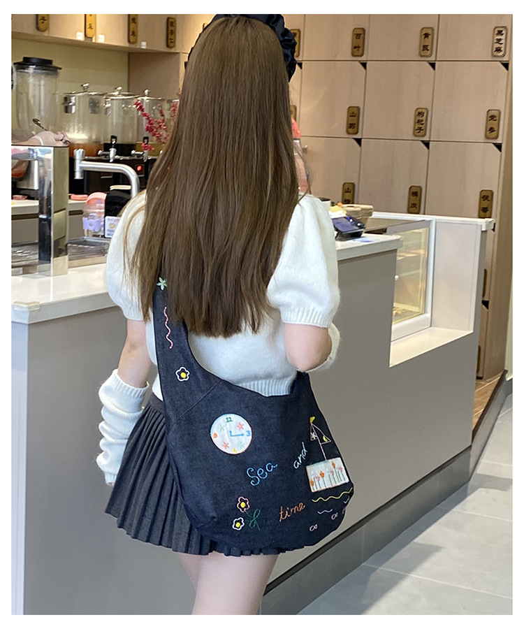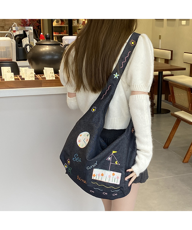 Ins 새로운 도착 작은 일러스트레이션 데님 크로스 바디 백 여성 올 매치 대용량 어깨 가방 학생들을위한 지퍼 입스토어 가기