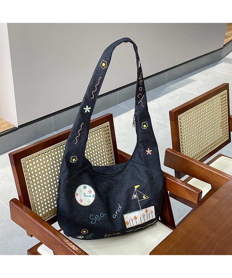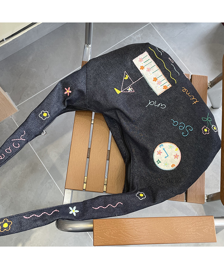 Ins 새로운 도착 작은 일러스트레이션 데님 크로스 바디 백 여성 올 매치 대용량 어깨 가방 학생들을위한 지퍼 입