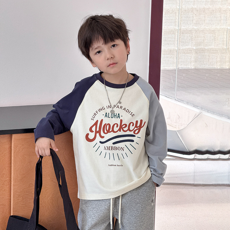 Elmo Beibei 아동용 면 편안한 배색 탑 소년 중대형 아동용 잘생긴 문자 라글란 긴팔 티셔츠 트렌디스토어 가기