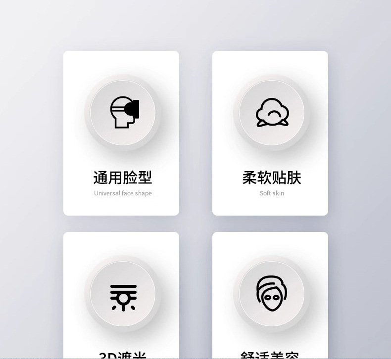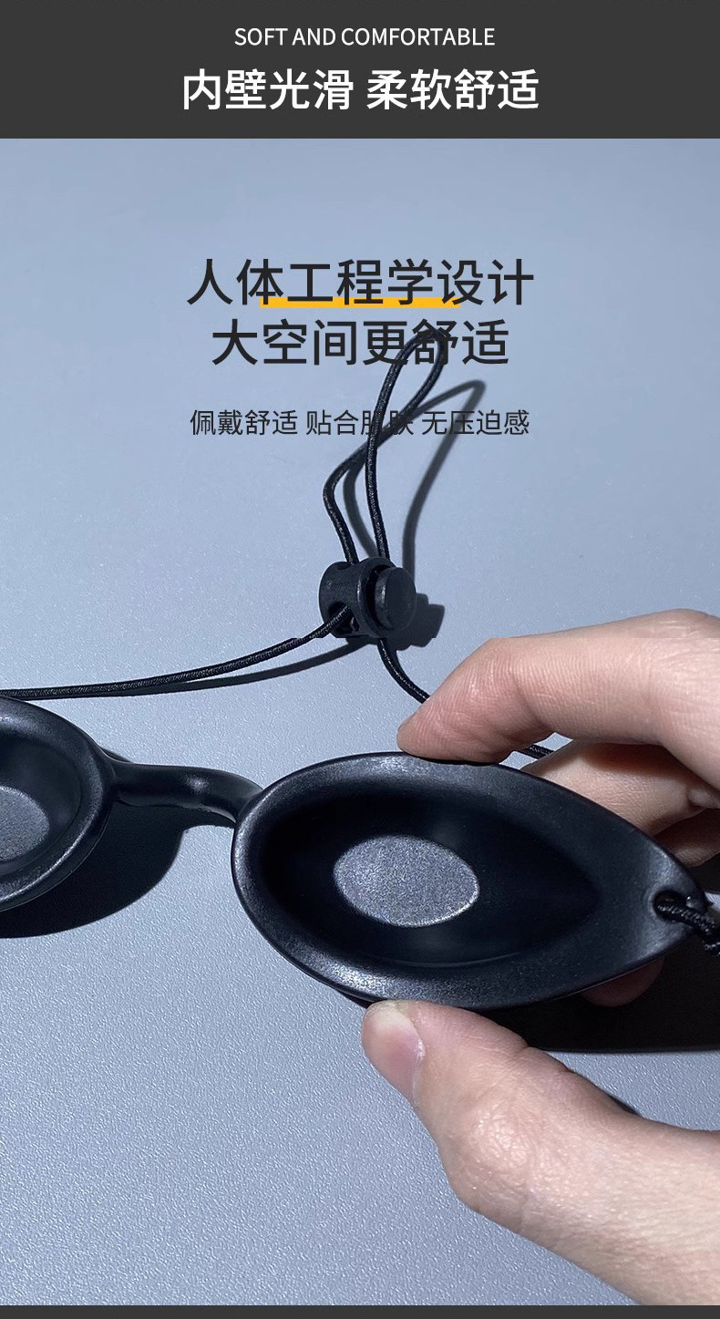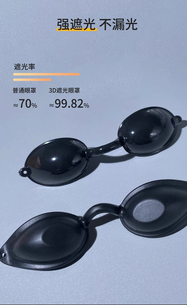 产品特点:应用人体工学设计,采用柔软材料制作。佩带长度可调,适合不同脸形。佩戴舒适,遮光性好。