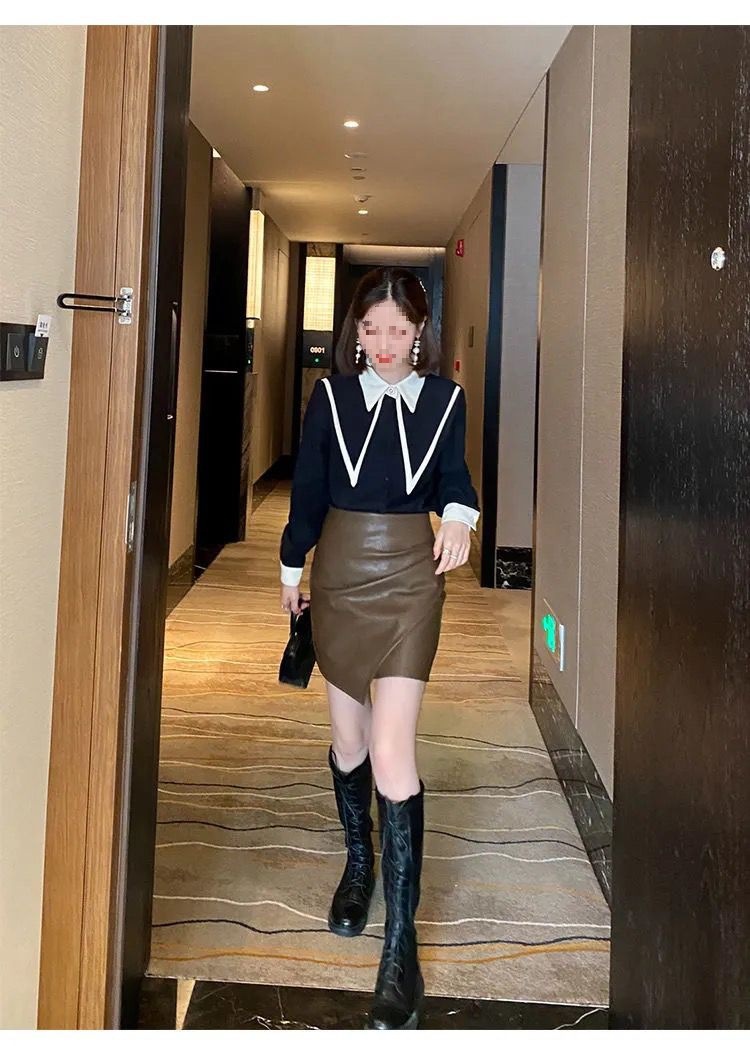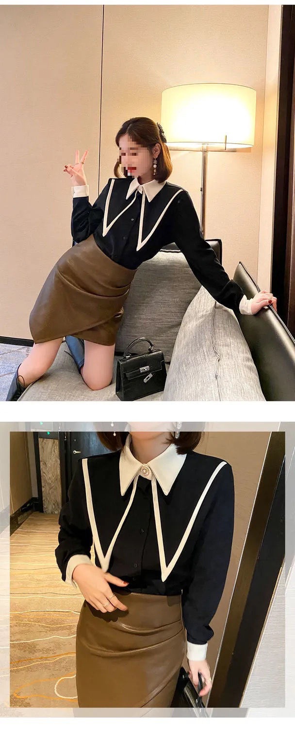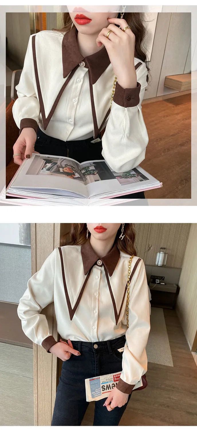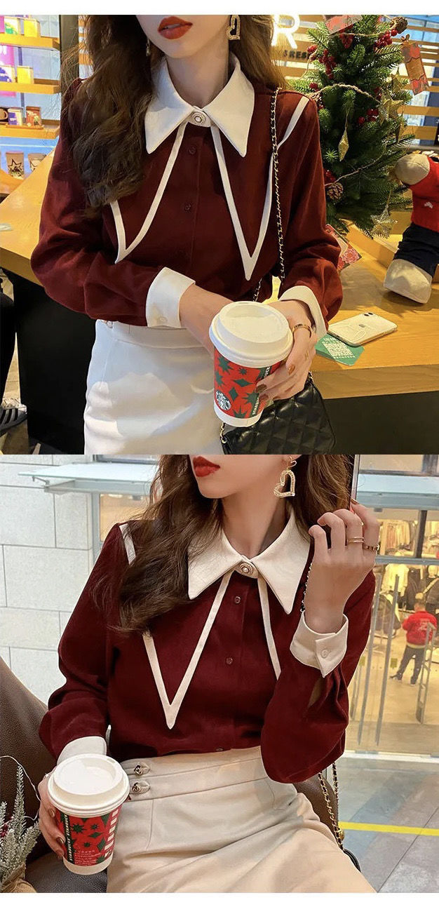 빈티지 얇은 셔츠 여자 올매치 붉은 봄과 가을 새로운 한국 스타일 느슨한 슬리밍 포인팅 칼라베이스 탑 셔츠