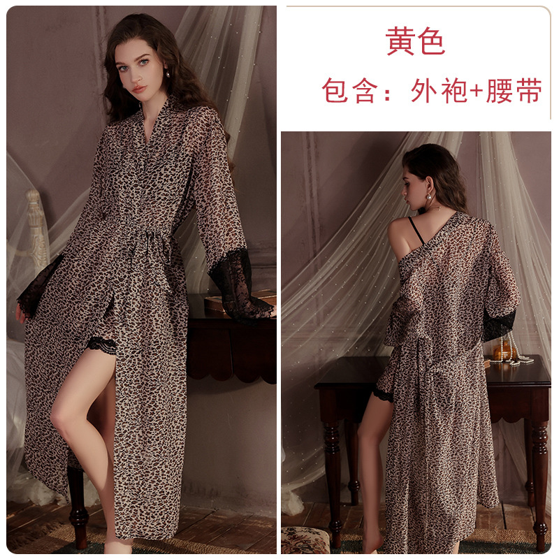 Guiruo 브랜드 속옷 달콤한 관점 쉬폰 레이스 섹시 레오파드 슬링 나이트 가운 홈 세트 5147