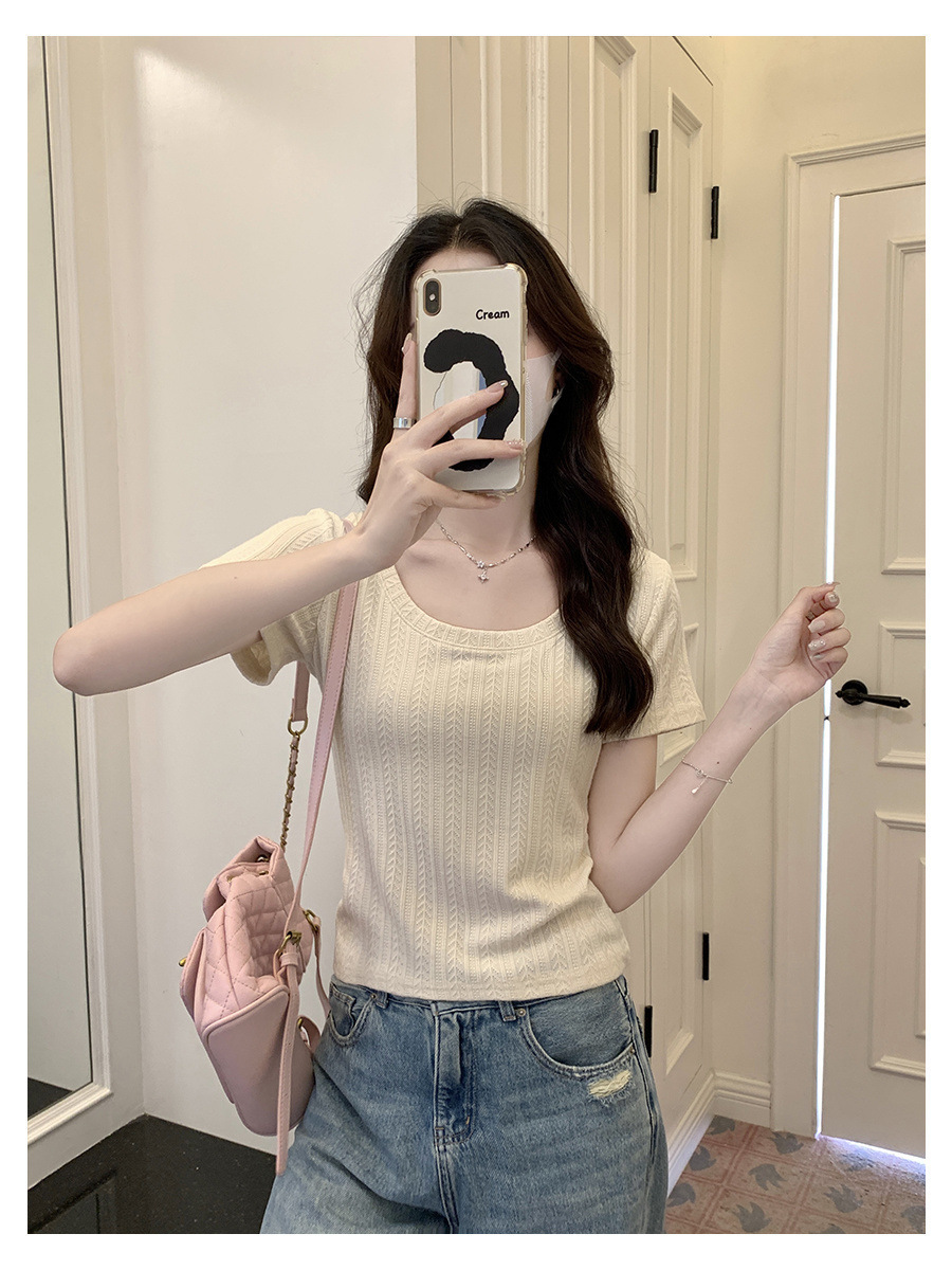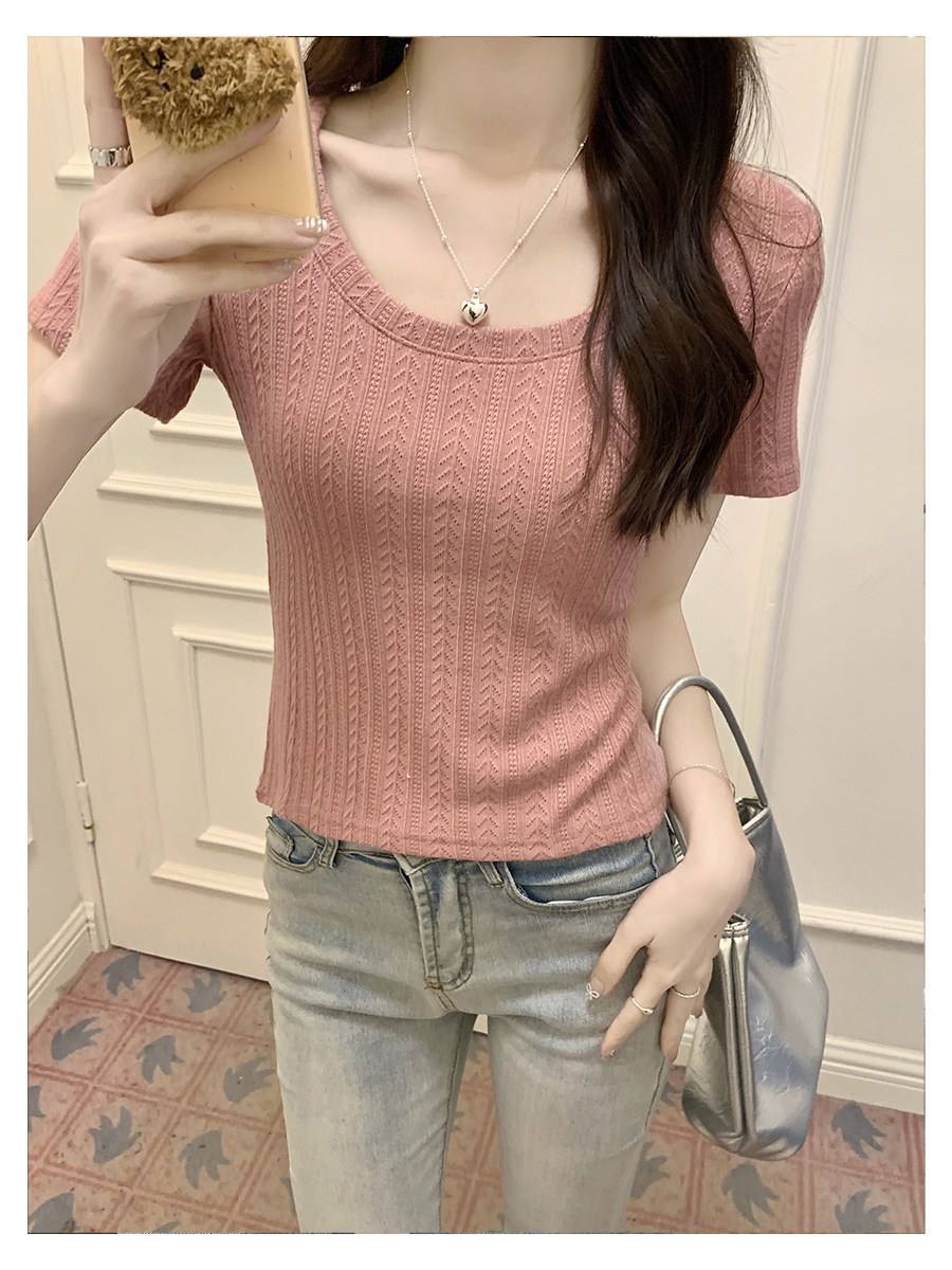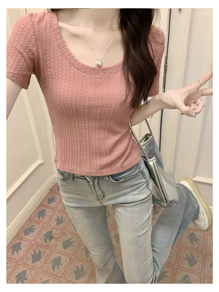 우아한 심플 2024 컬러 U 칼라 반팔 티셔츠 2024 봄 새로운 여성 올 매치 슬림 숄더 풀오버 탑