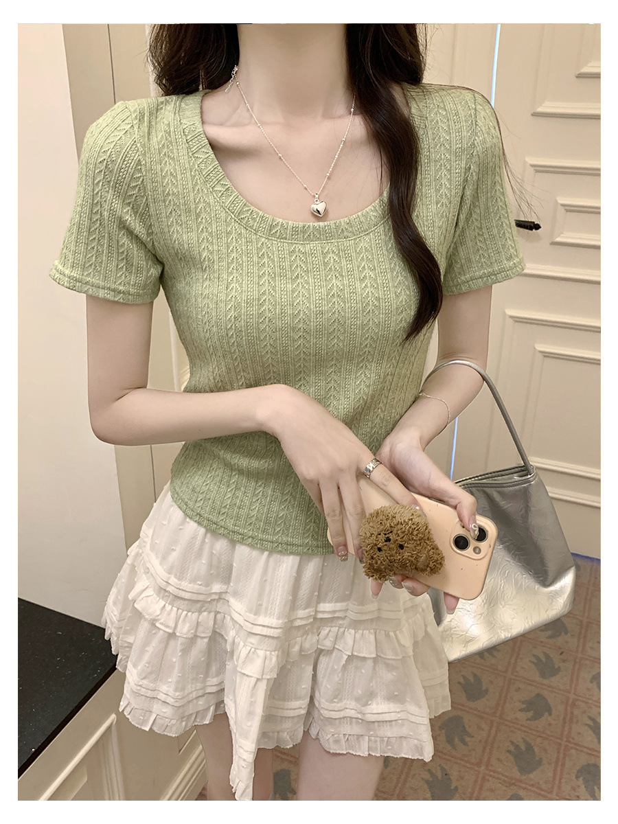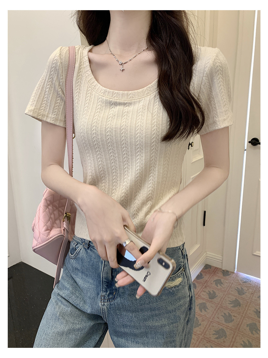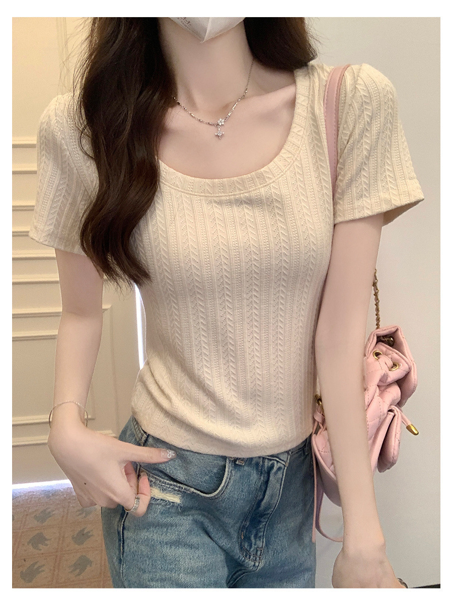 우아한 심플 2024 컬러 U 칼라 반팔 티셔츠 2024 봄 새로운 여성 올 매치 슬림 숄더 풀오버 탑