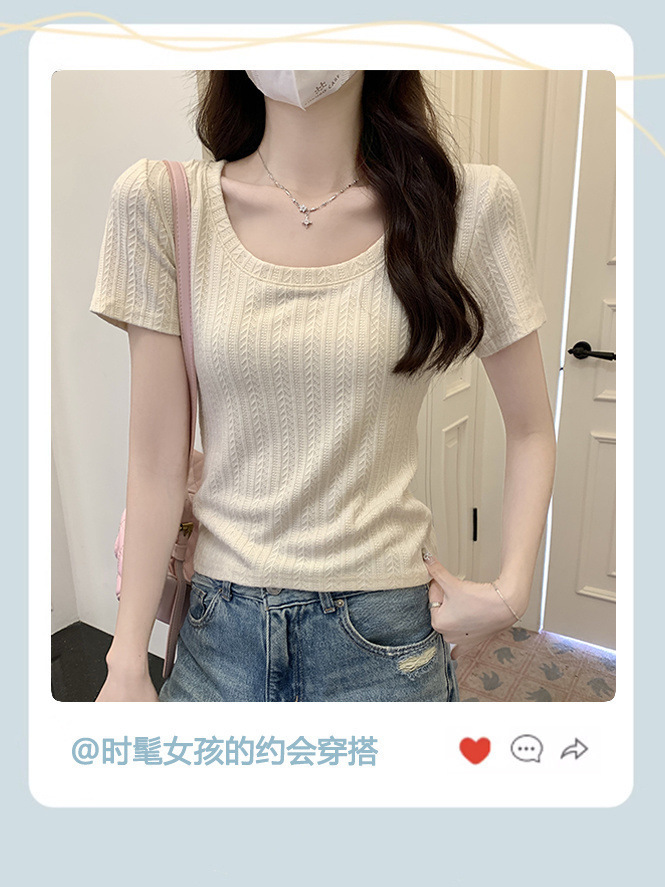 우아한 심플 2024 컬러 U 칼라 반팔 티셔츠 2024 봄 새로운 여성 올 매치 슬림 숄더 풀오버 탑스토어 가기