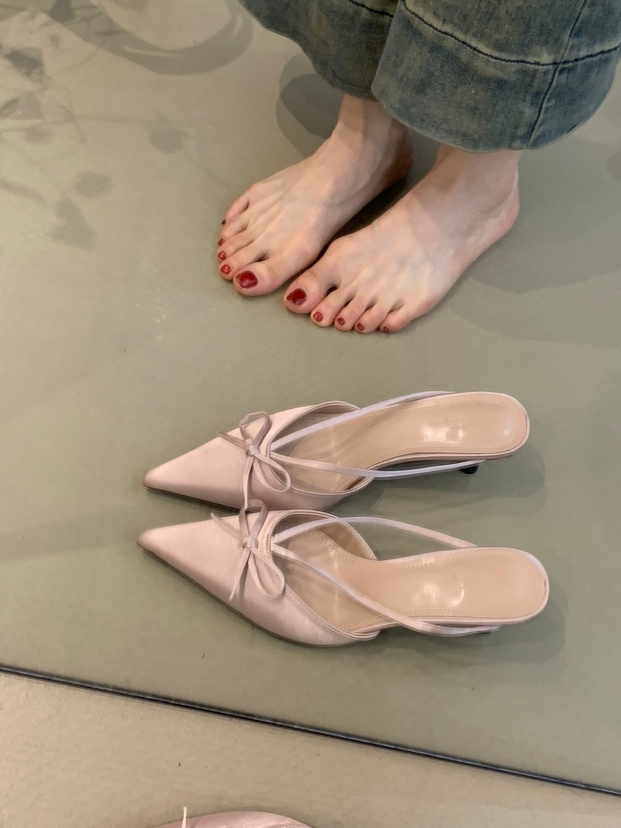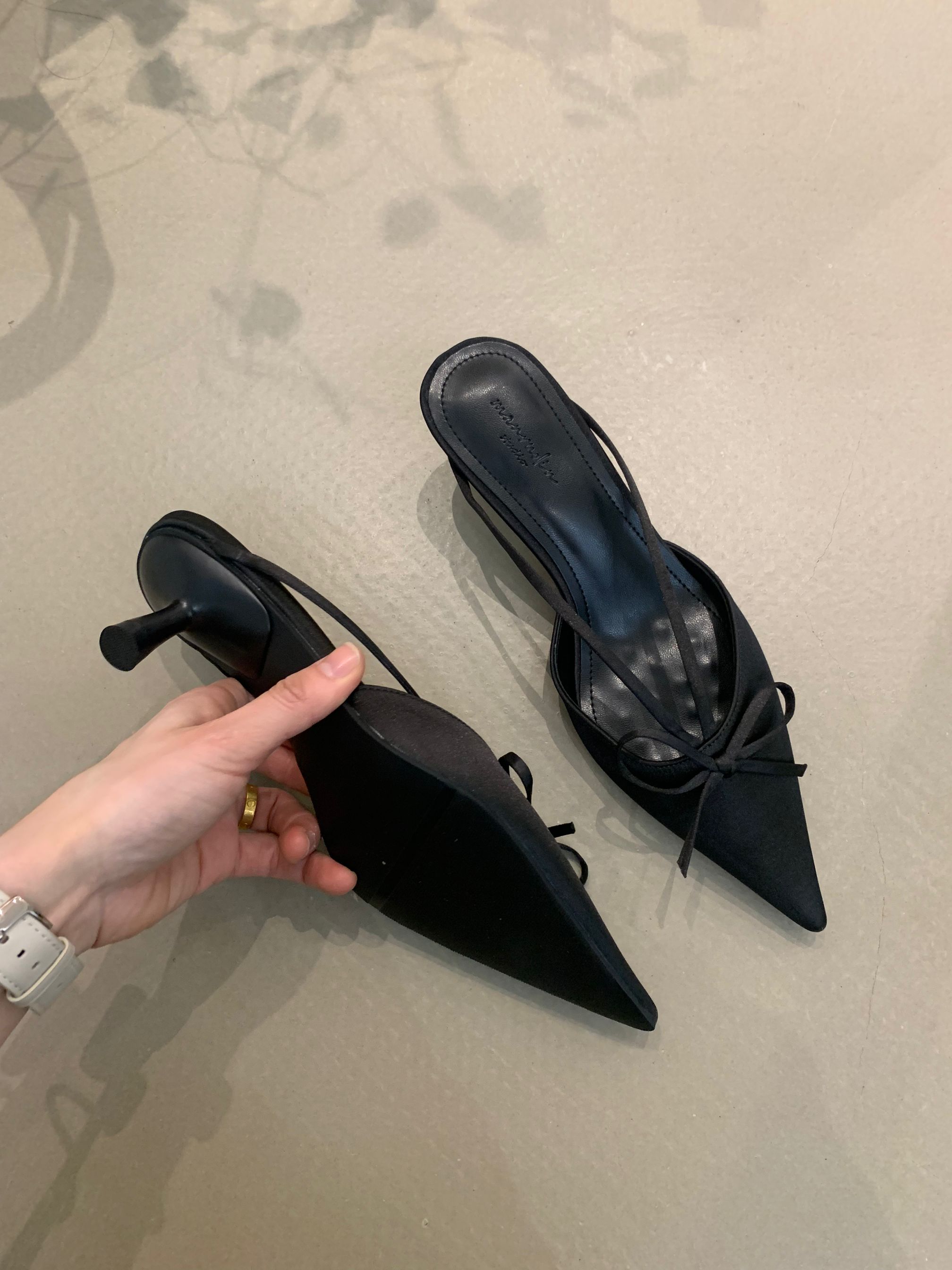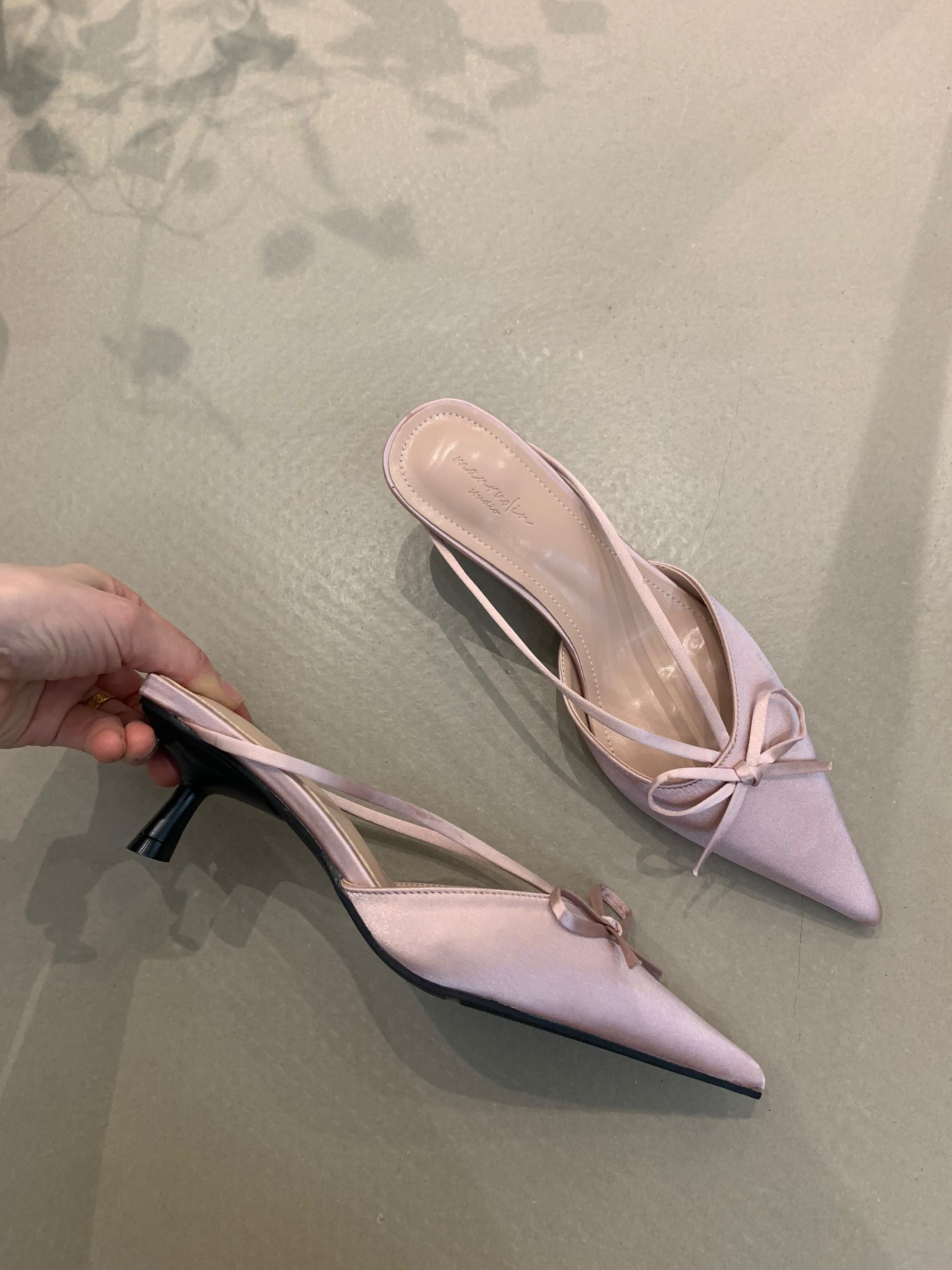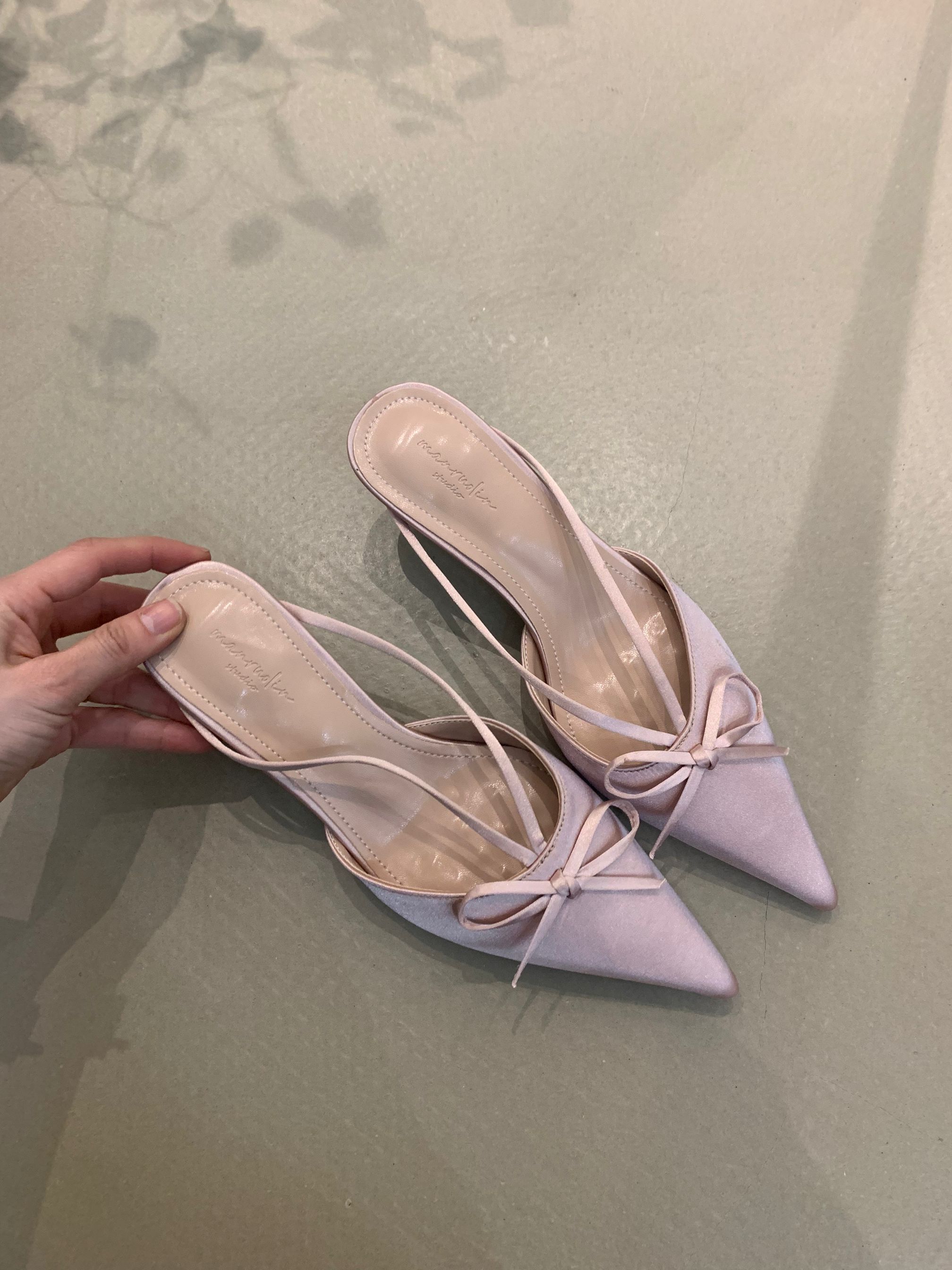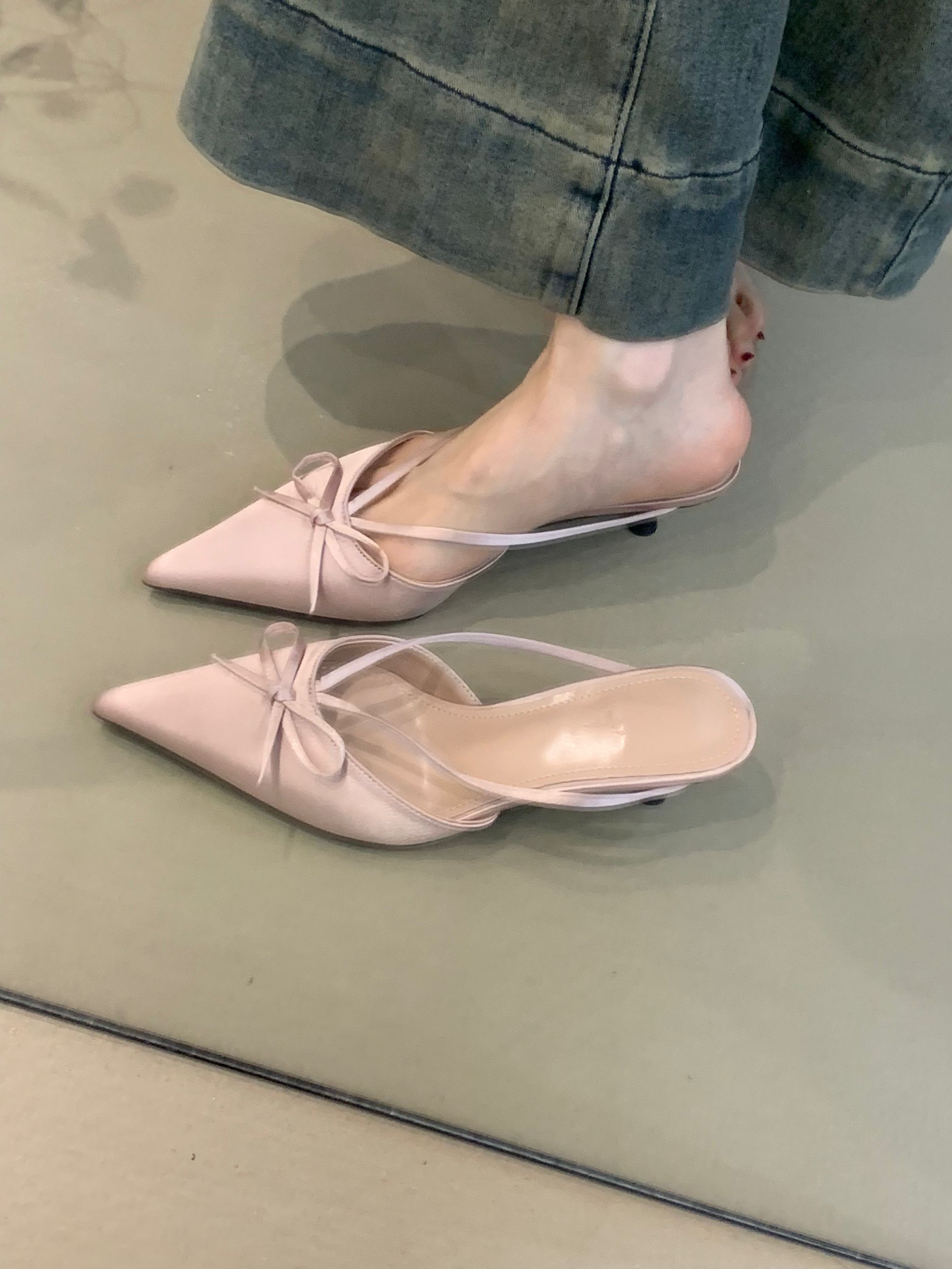 프랑스 스타일 우아한 활 발가락 슬리퍼 2025 봄 달콤한 부드러운 우아한 새틴 뾰족한 스틸레토 힐 하이힐 신발스토어 가기