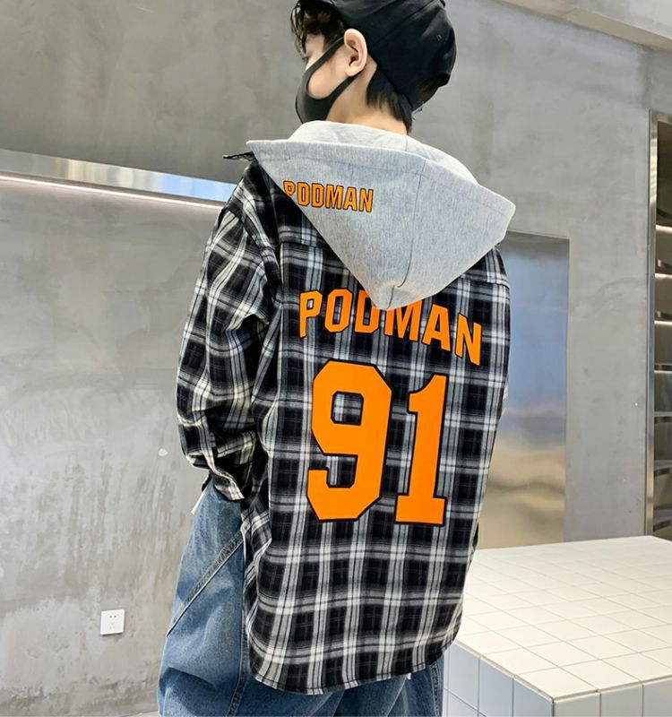 • 후드 탈착식 후드가 달린 프린트 블랙 체크 무늬 셔츠