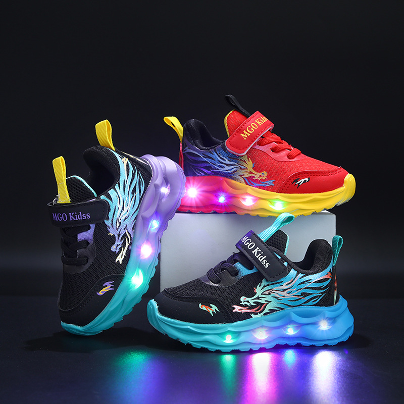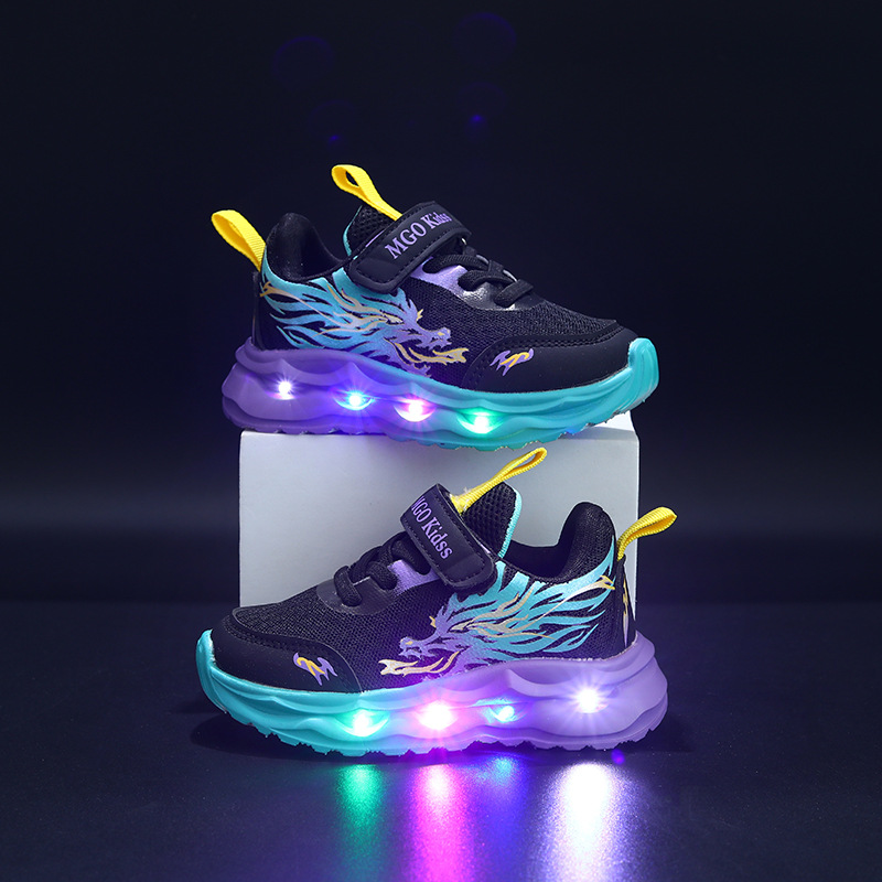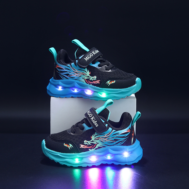 2025 봄과 가을 새로운 어린이 스포츠 신발 가죽 중국어 드래곤 ED 빛나는 어린이 신발 1-6 세 소년 스포츠 및 레저스토어 가기