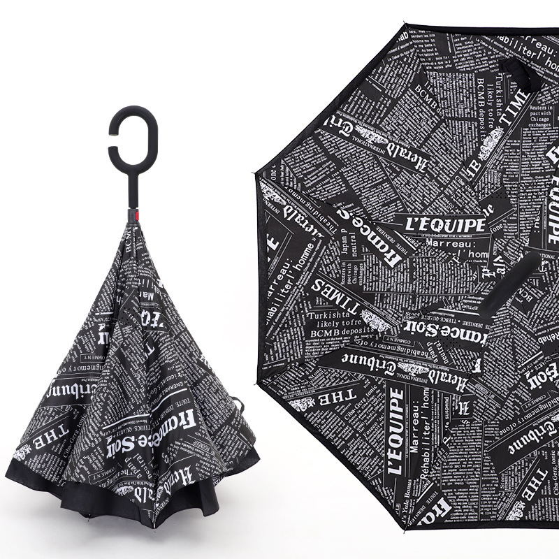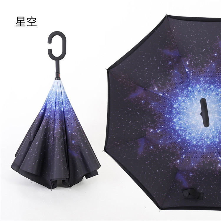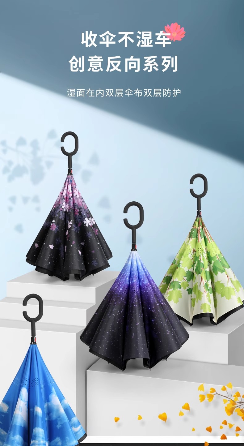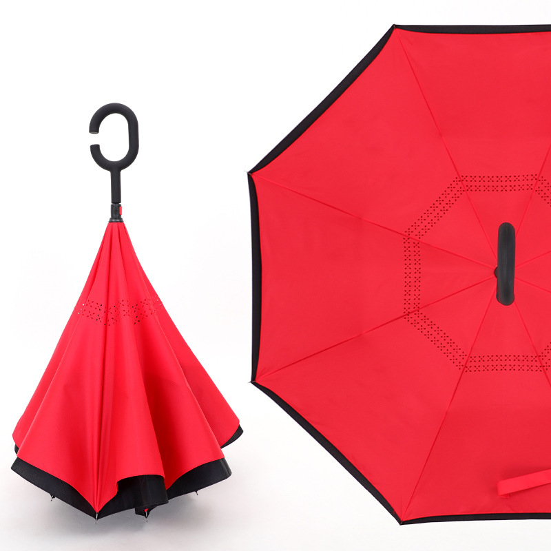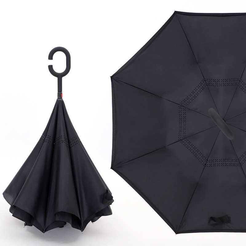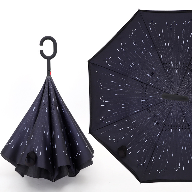 스트레이트 로드 더블 레이어 리버스 우산 자동차 선물 광고 우산 긴 핸들 우산 C 형 핸즈프리 리버스 우산 인쇄 로고스토어 가기
