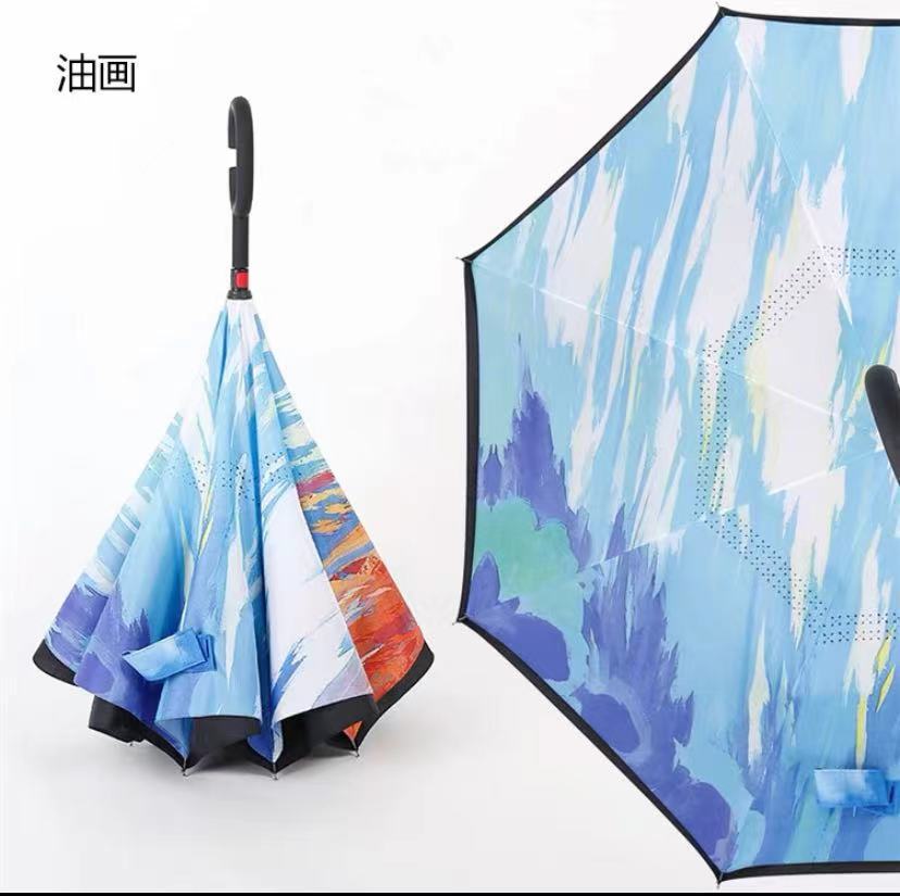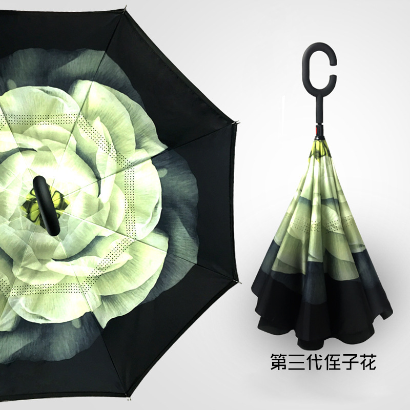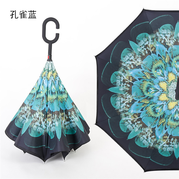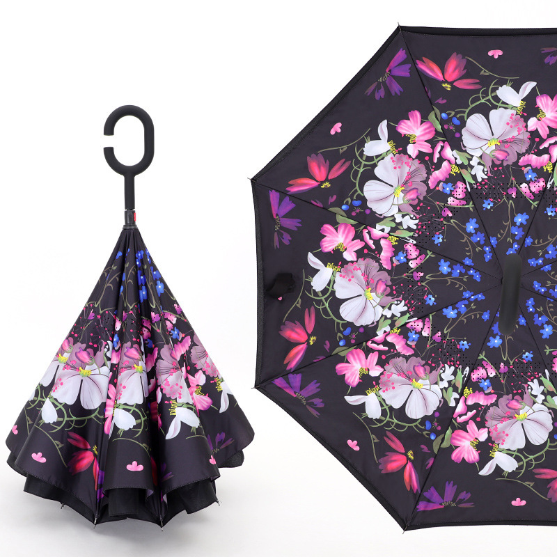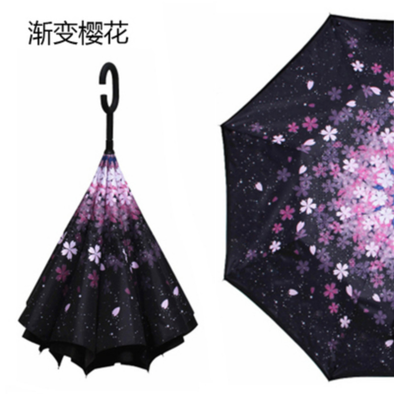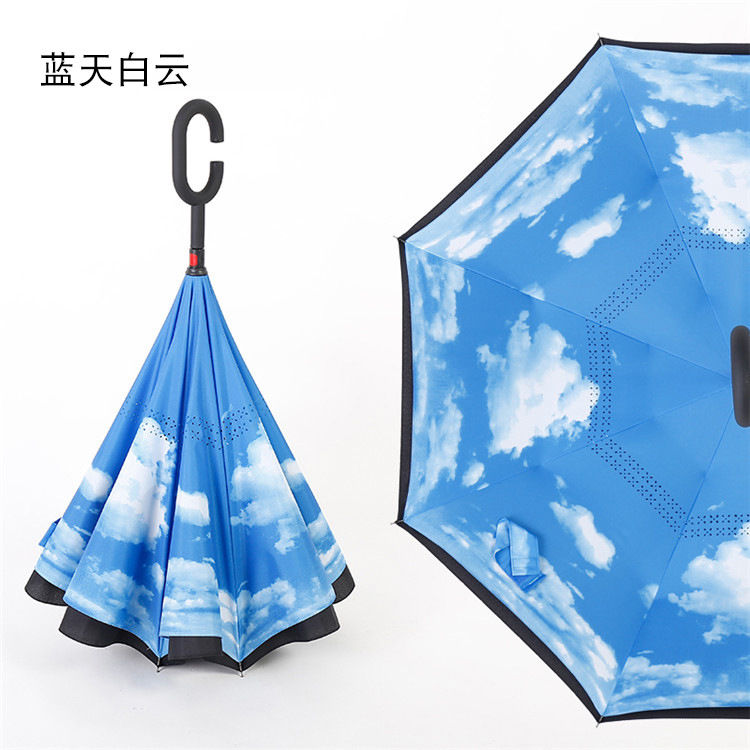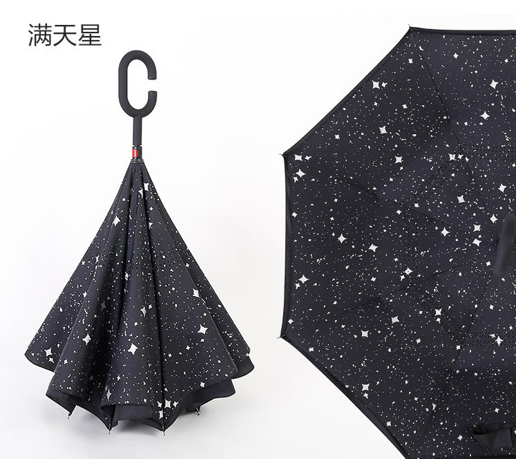 스트레이트 로드 더블 레이어 리버스 우산 자동차 선물 광고 우산 긴 핸들 우산 C 형 핸즈프리 리버스 우산 인쇄 로고스토어 가기