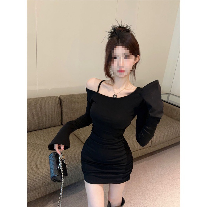 검은 어깨 긴팔 V 넥 원피스 여성 봄 섹시한 스파이스 소녀 불규칙한 치마 단단한 엉덩이 치마스토어 가기