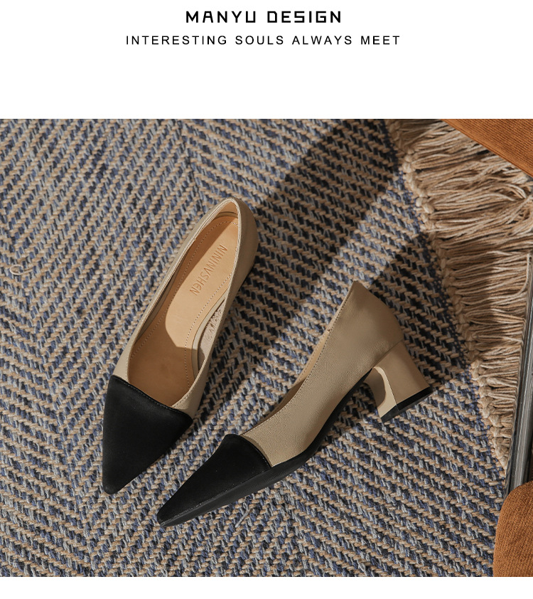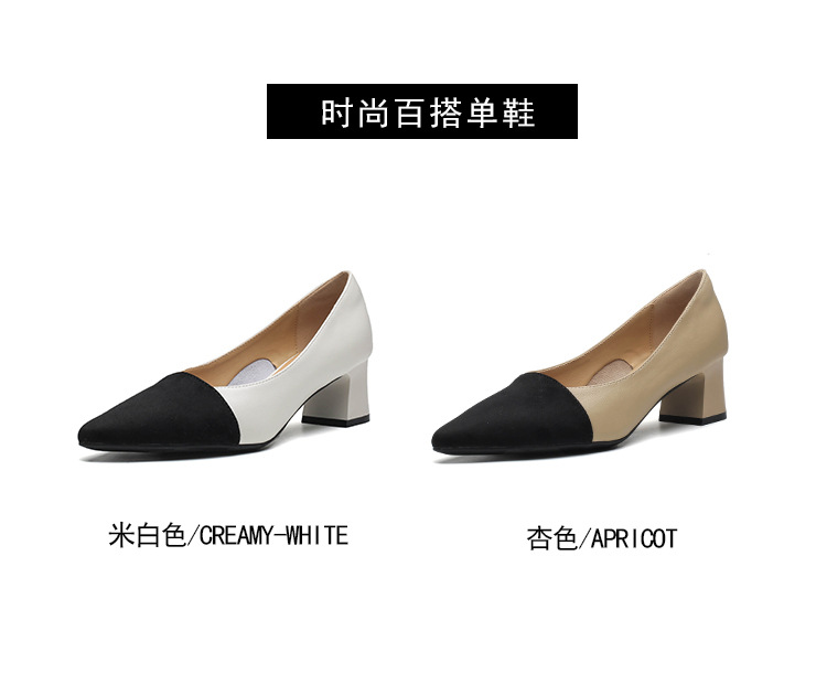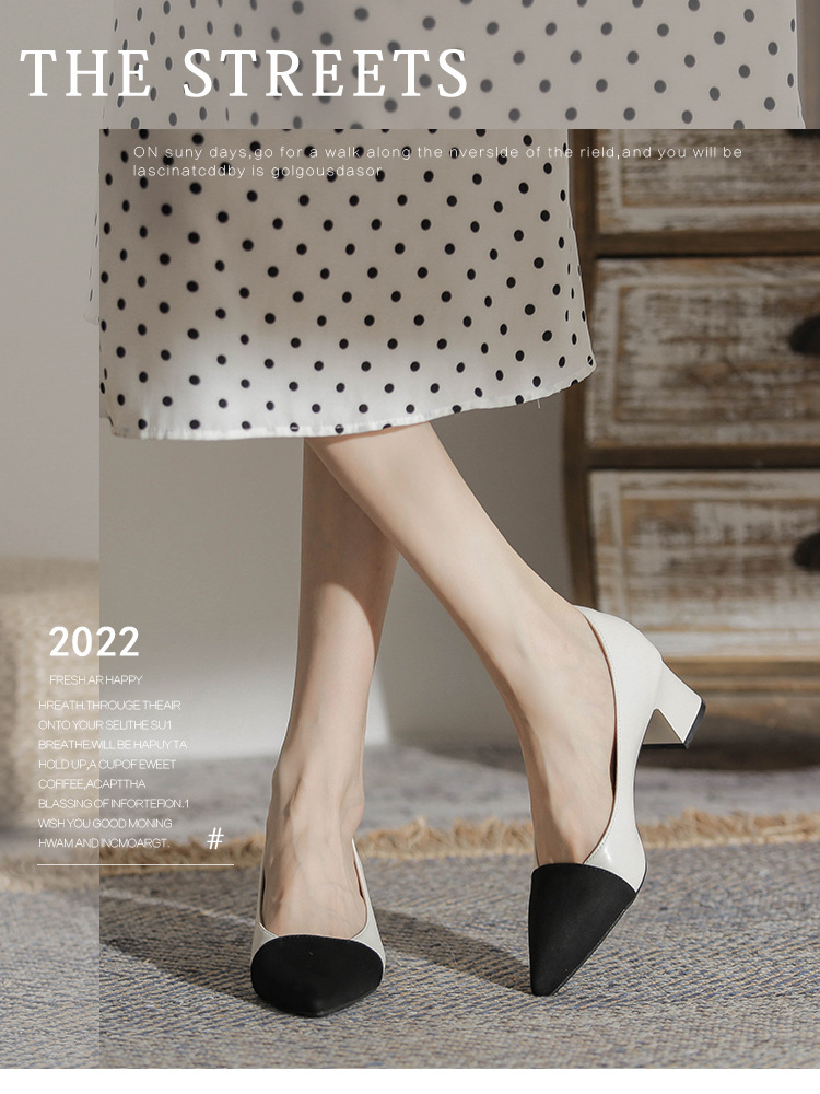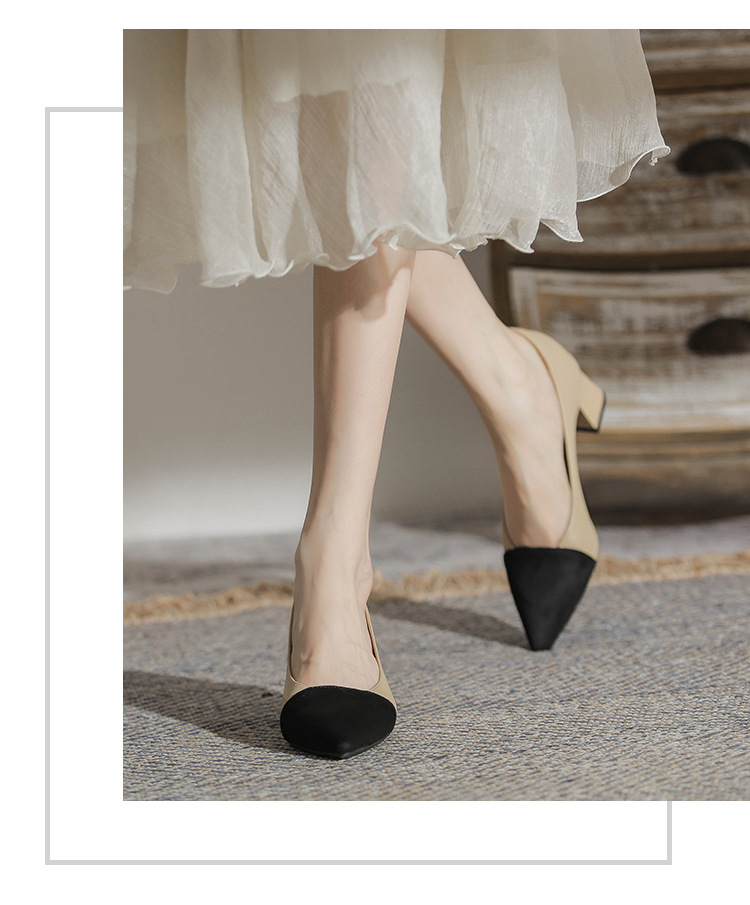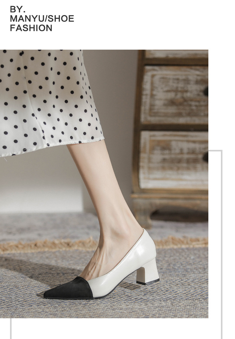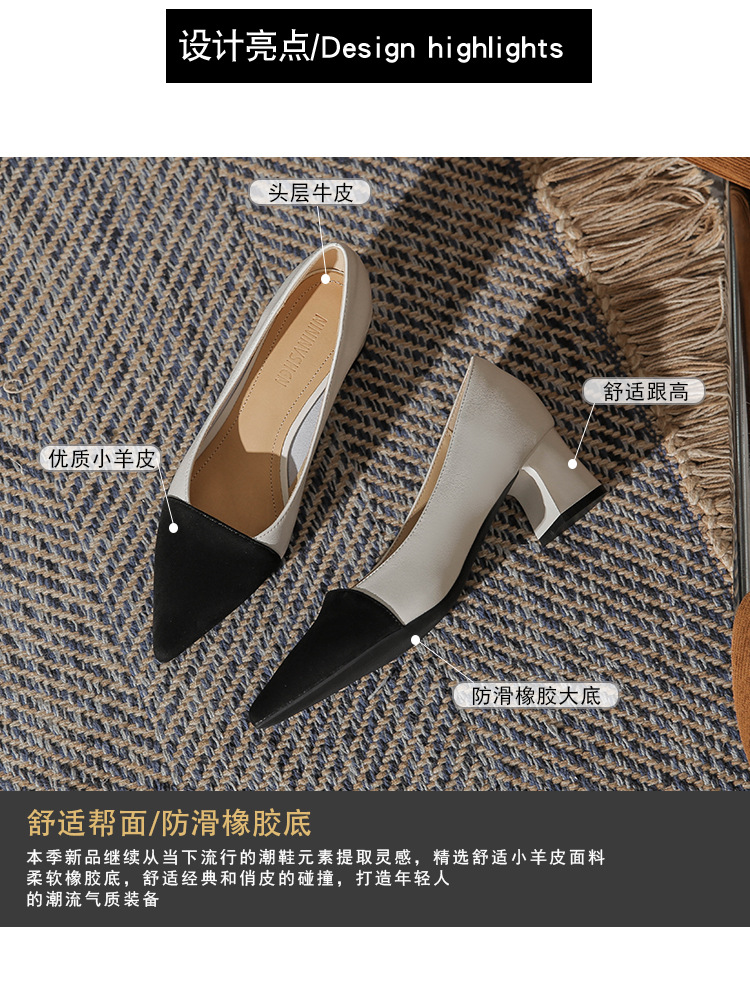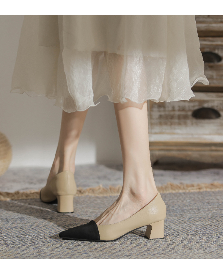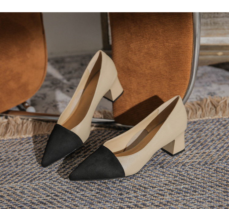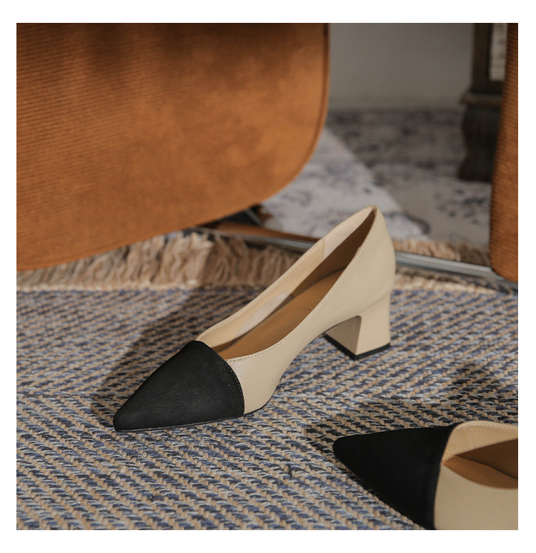 TT969-CG 양가죽 샤넬 스타일 싱글 레이어 신발 여성용 두꺼운 힐 프렌치 컬러 블록 새로운 얕은 입 포인팅 미드 힐 하이힐 신발스토어 가기