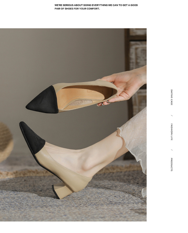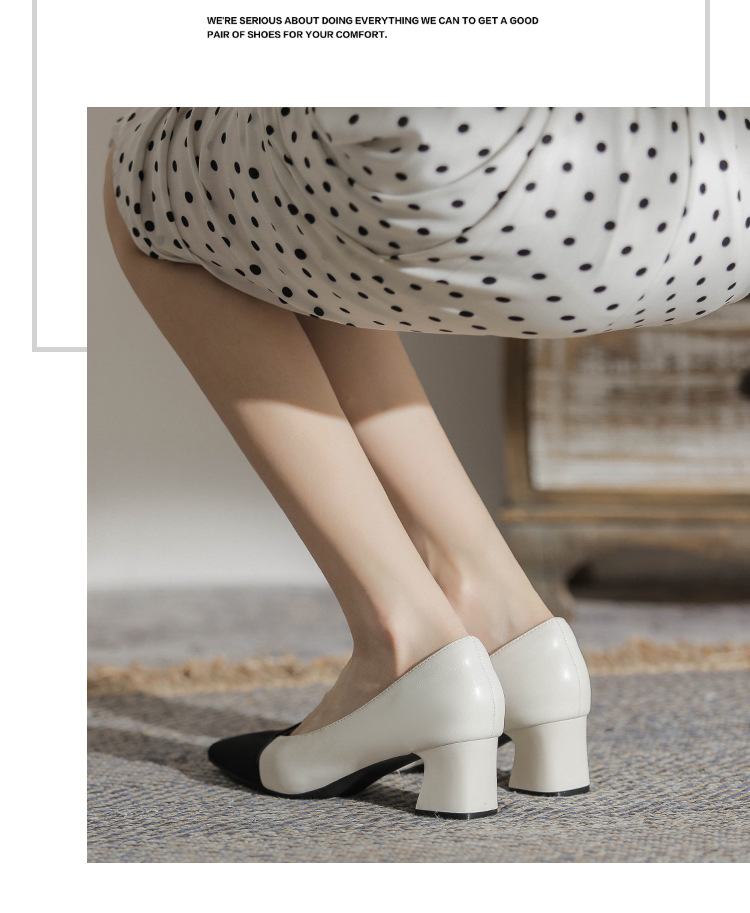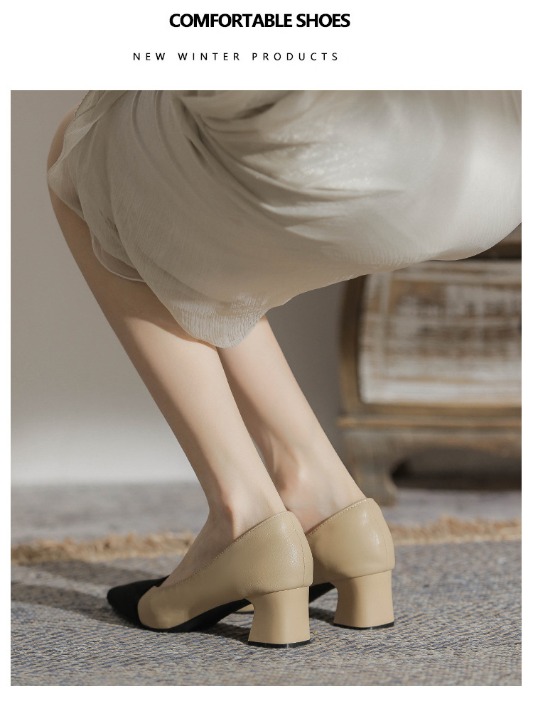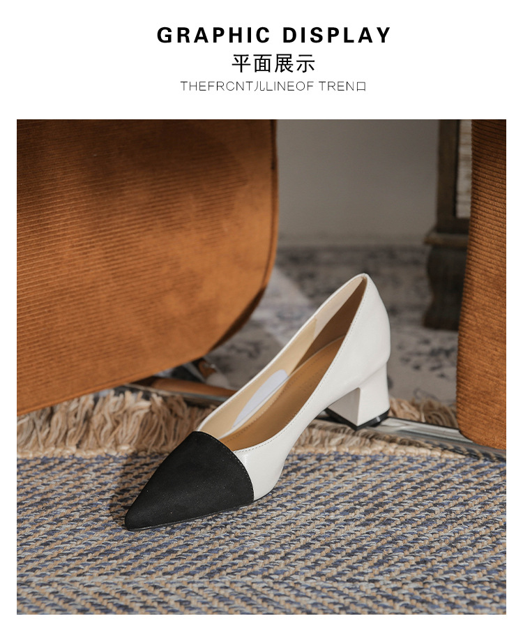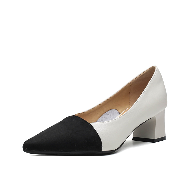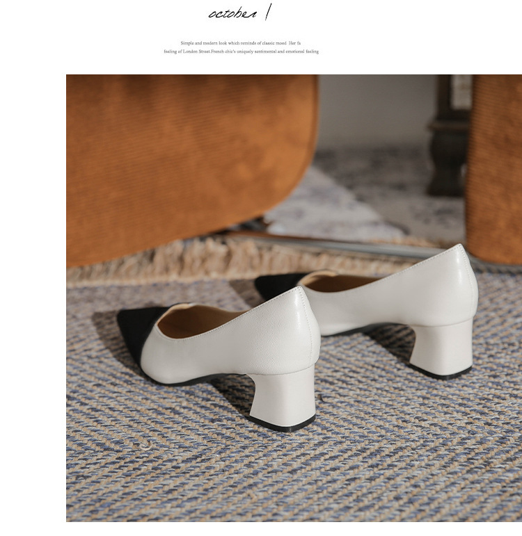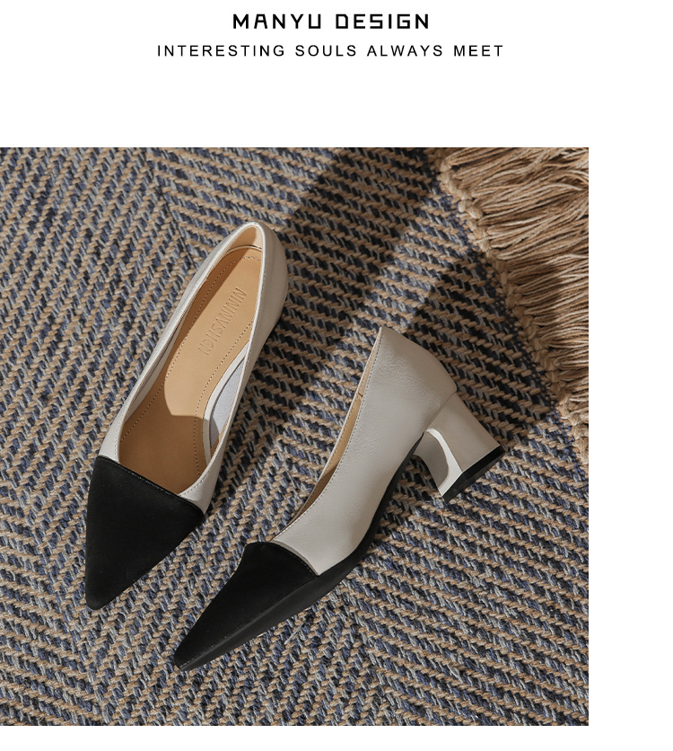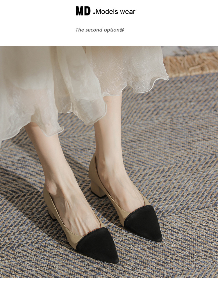 TT969-CG 양가죽 샤넬 스타일 싱글 레이어 신발 여성용 두꺼운 힐 프렌치 컬러 블록 새로운 얕은 입 포인팅 미드 힐 하이힐 신발스토어 가기