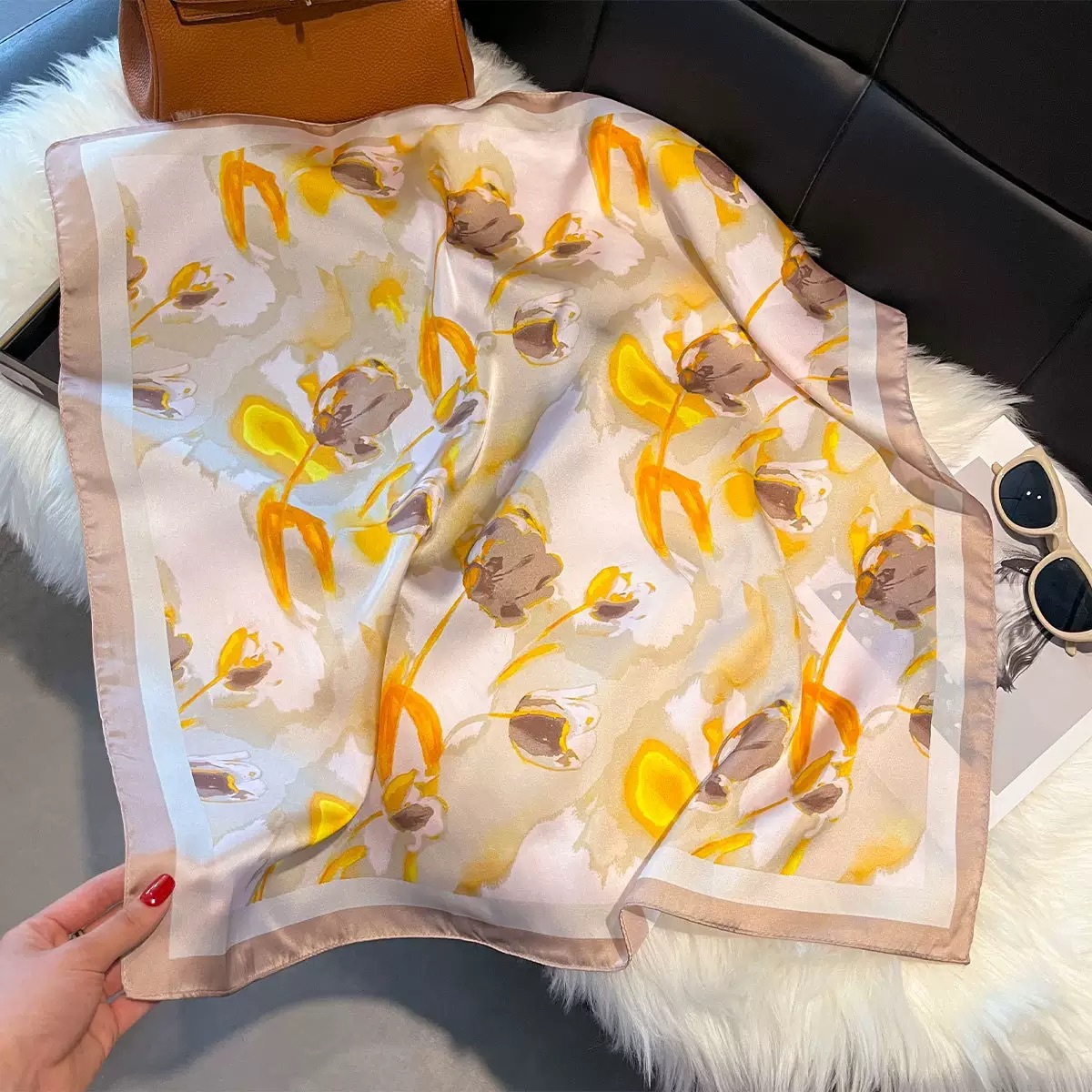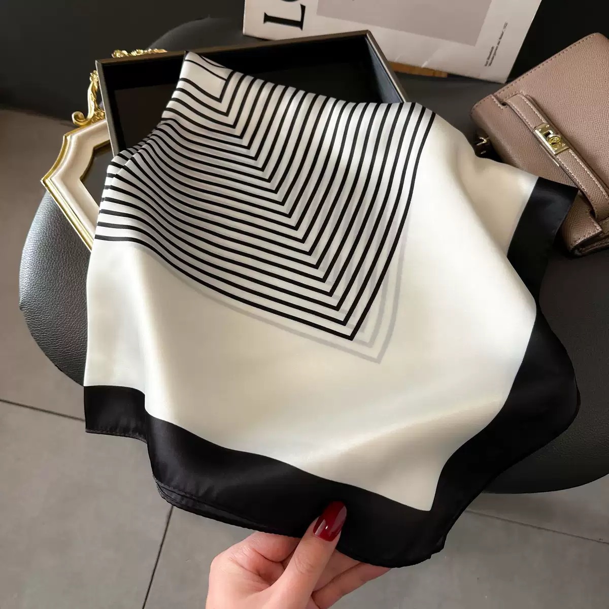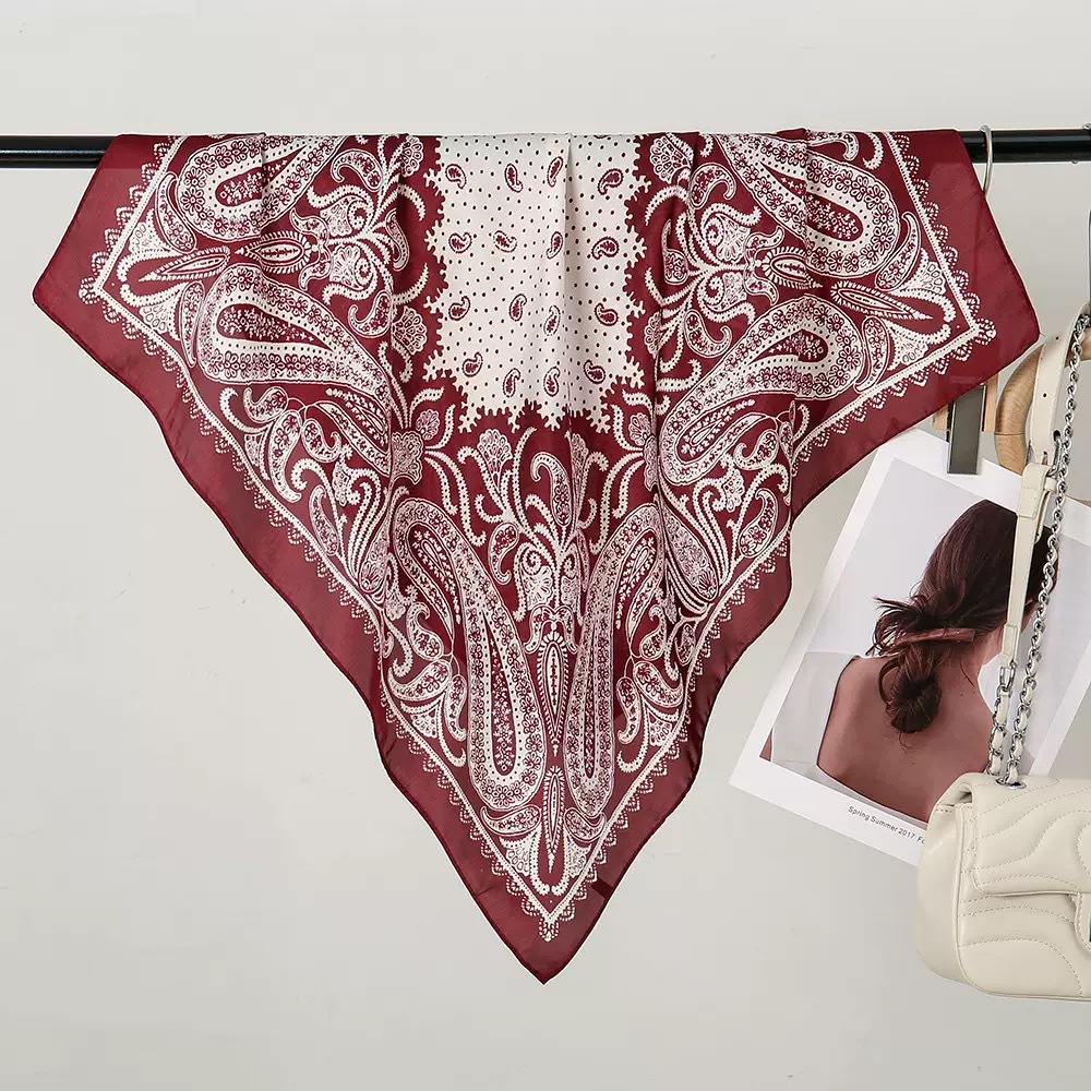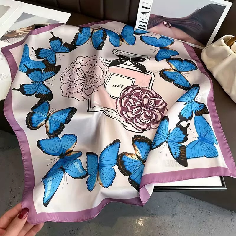 다용도로 매치 가능한 70cm 스카프, 실크 느낌의 스카프, 가벼운 럭셔리와 고급스러운 느낌, 한국 스타일 분위기, 브러버리 스타일 스카프