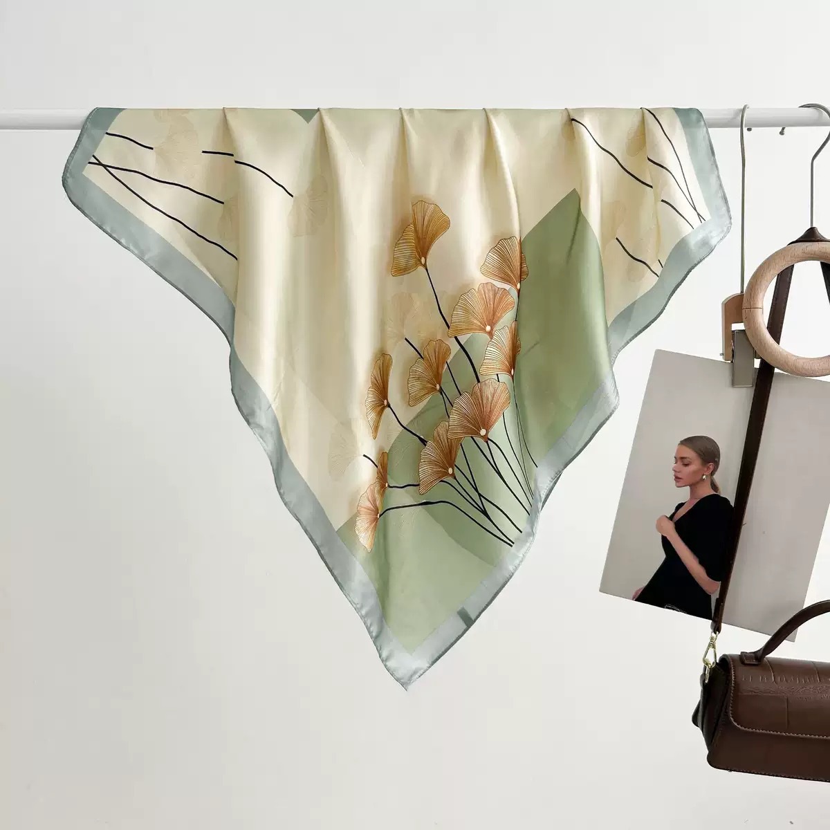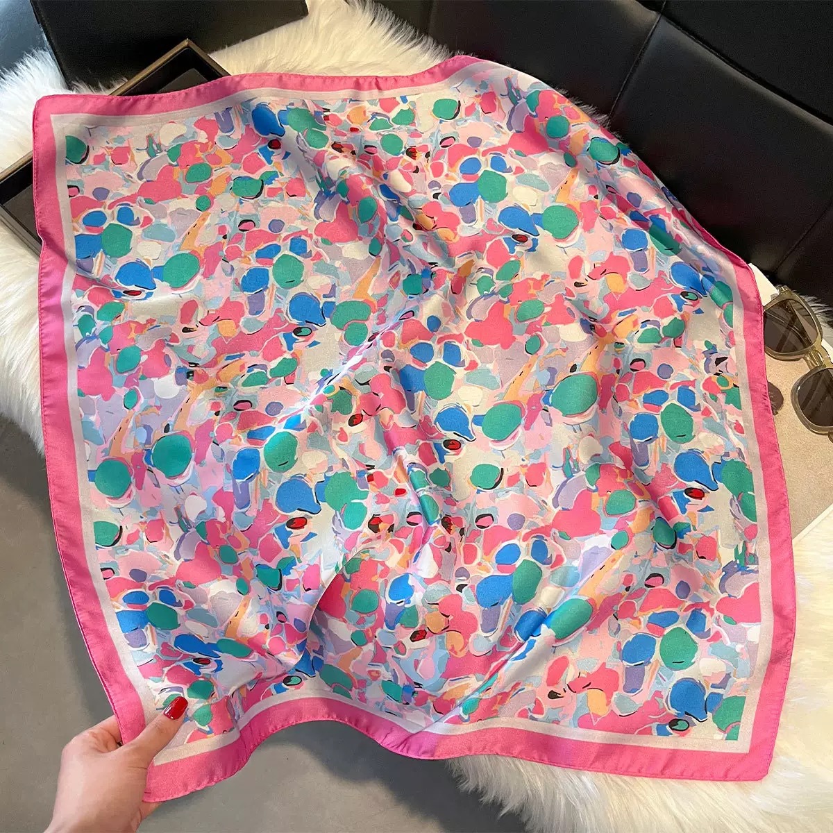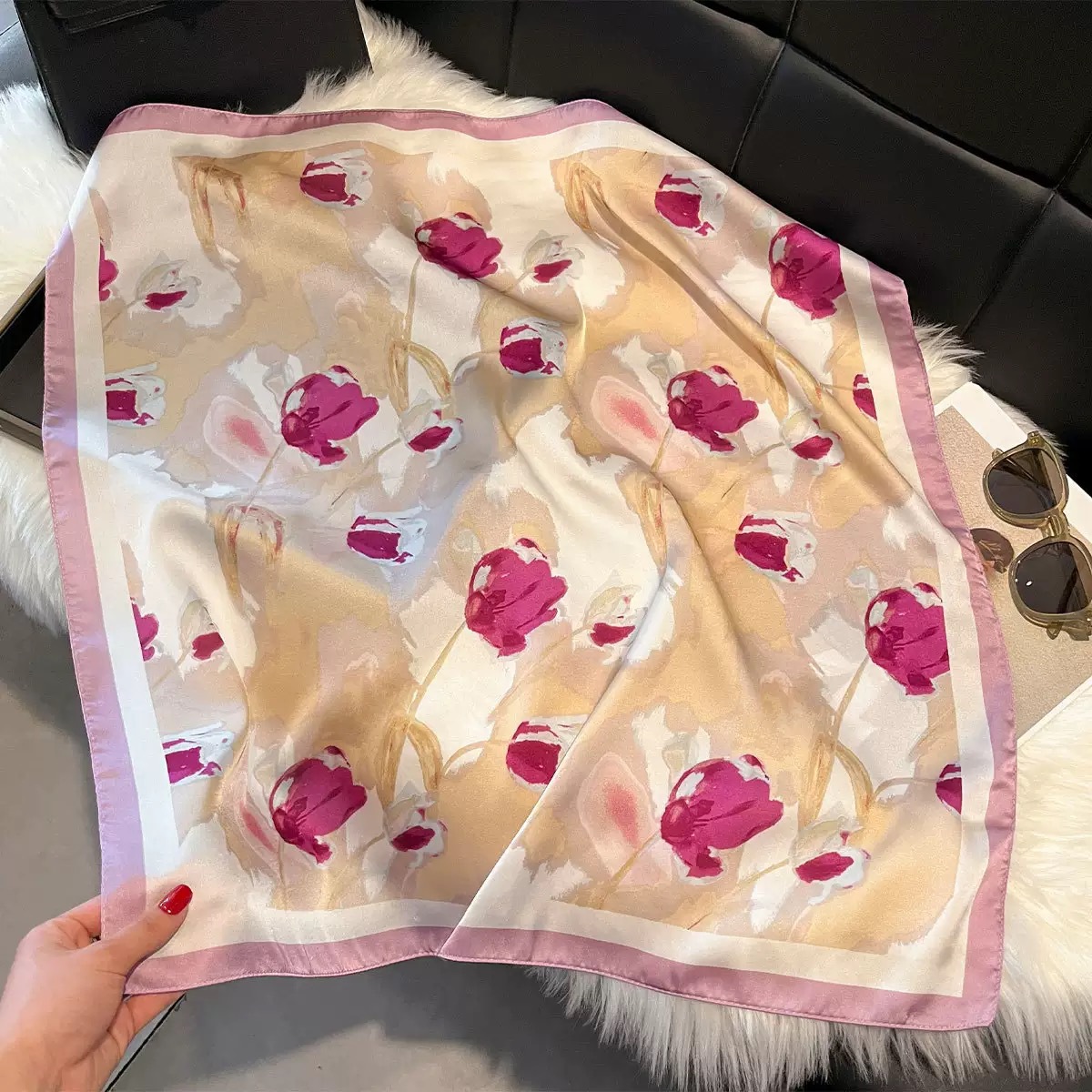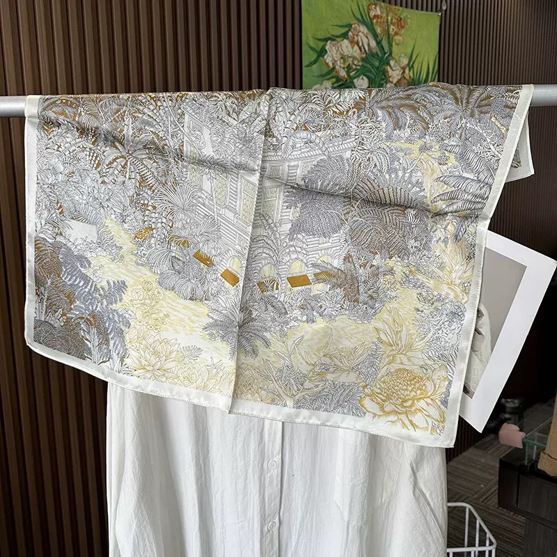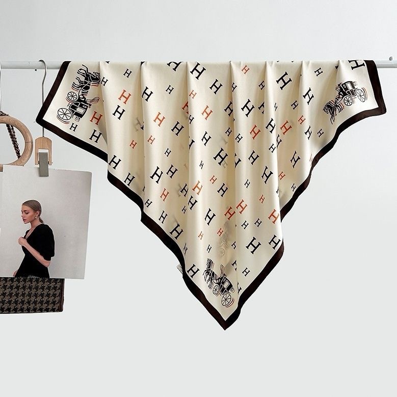 다용도로 매치 가능한 70cm 스카프, 실크 느낌의 스카프, 가벼운 럭셔리와 고급스러운 느낌, 한국 스타일 분위기, 브러버리 스타일 스카프스토어 가기