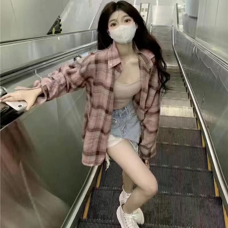 미국 스타일 격자 무늬 느슨한 셔츠 가을 새로운 게으른 캐주얼 느슨한 중간 길이 셔츠 긴팔 재킷 트렌디 탑스토어 가기