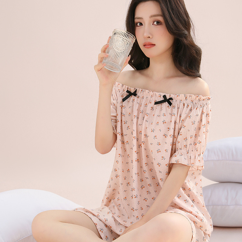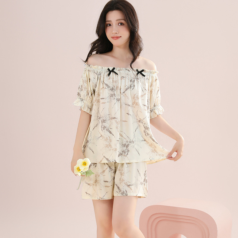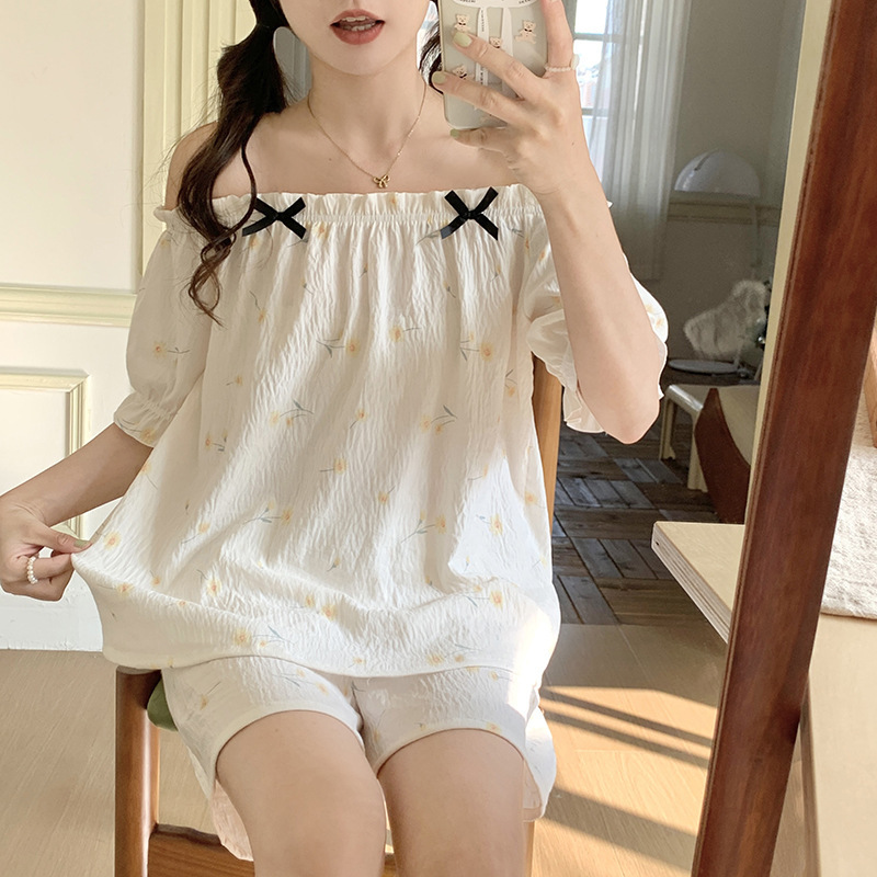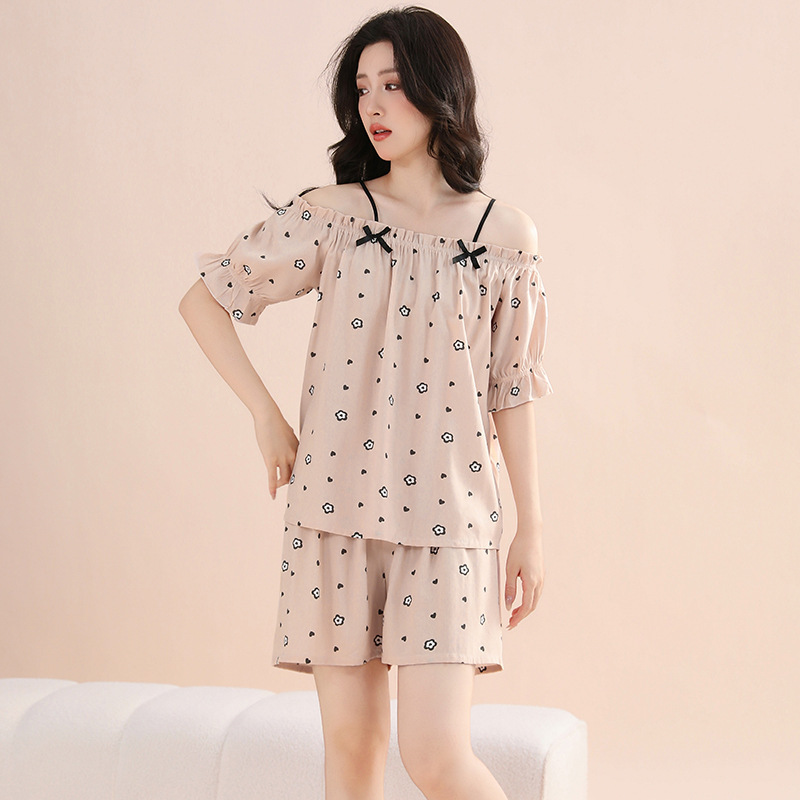 여성용 가짜 코튼 반팔 반바지 세트 잠옷 여름 느슨한 개성 다양한 착용 조절 가능한 어깨 끈스토어 가기