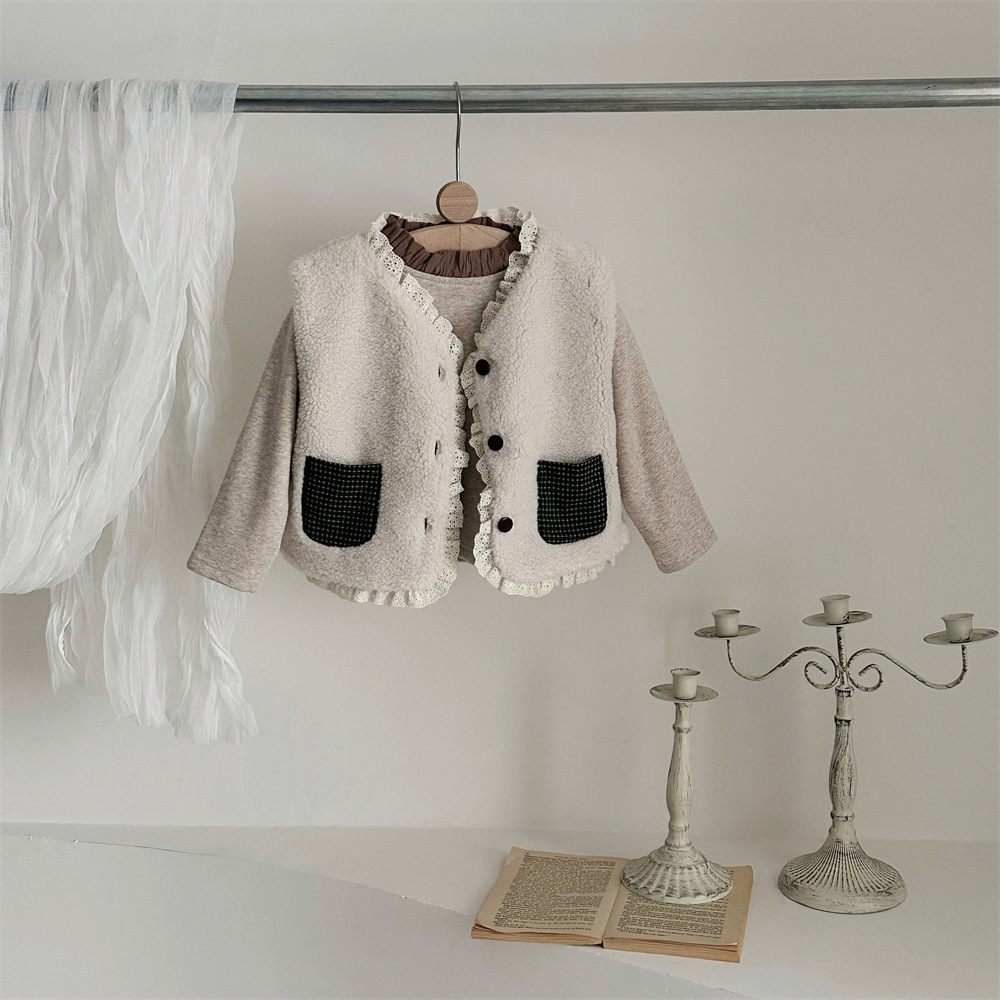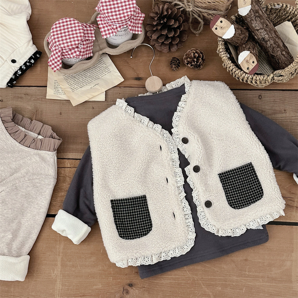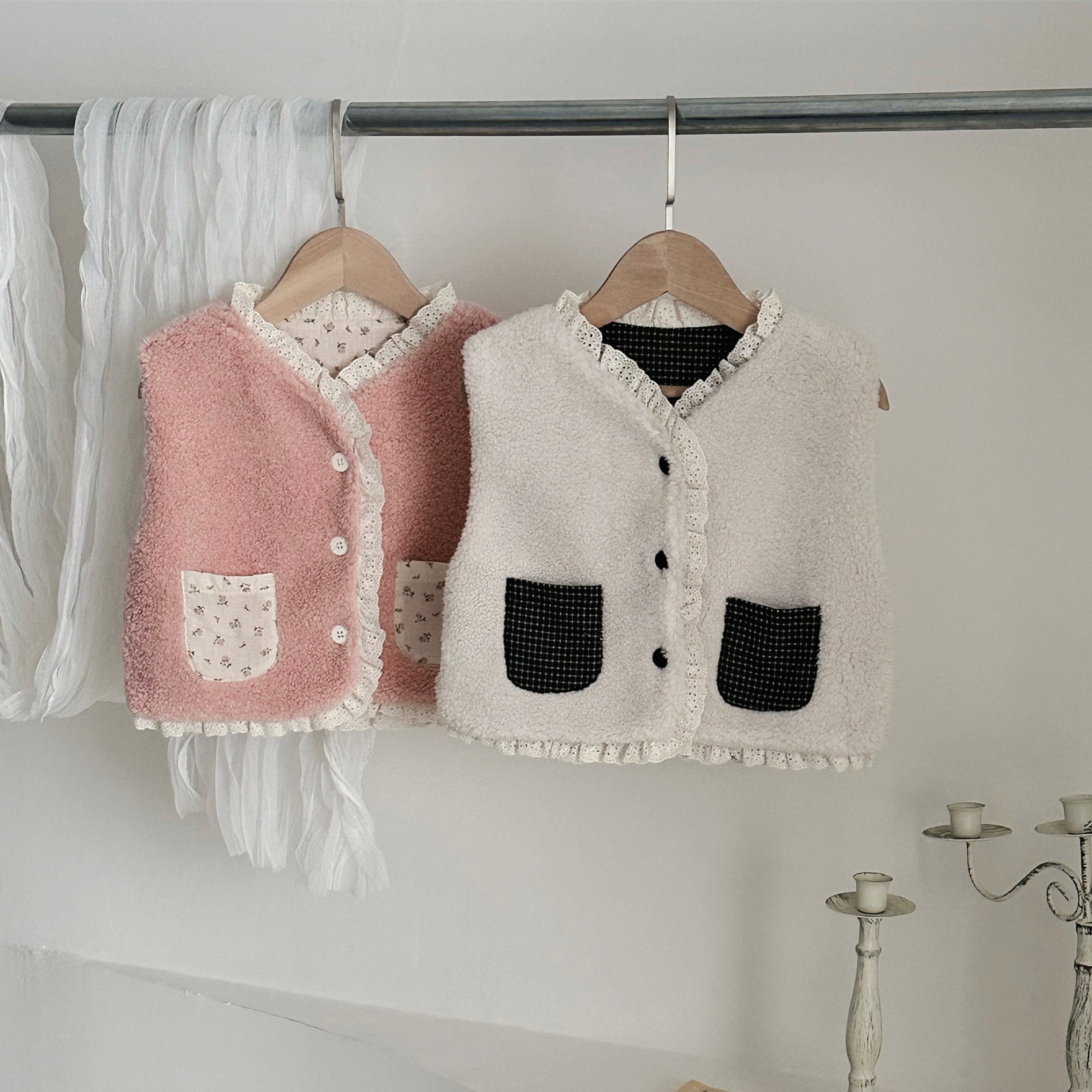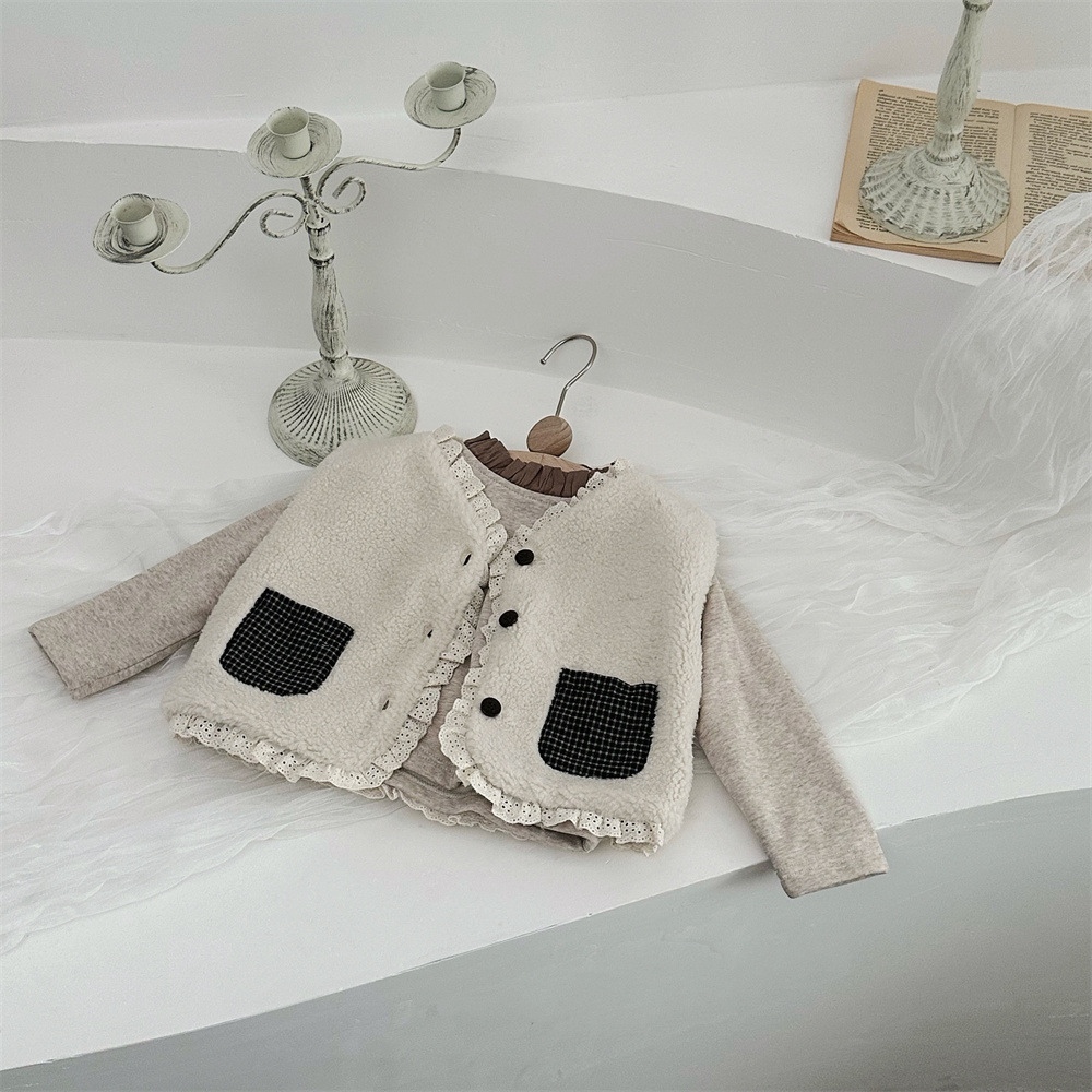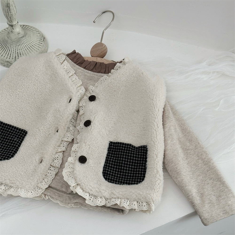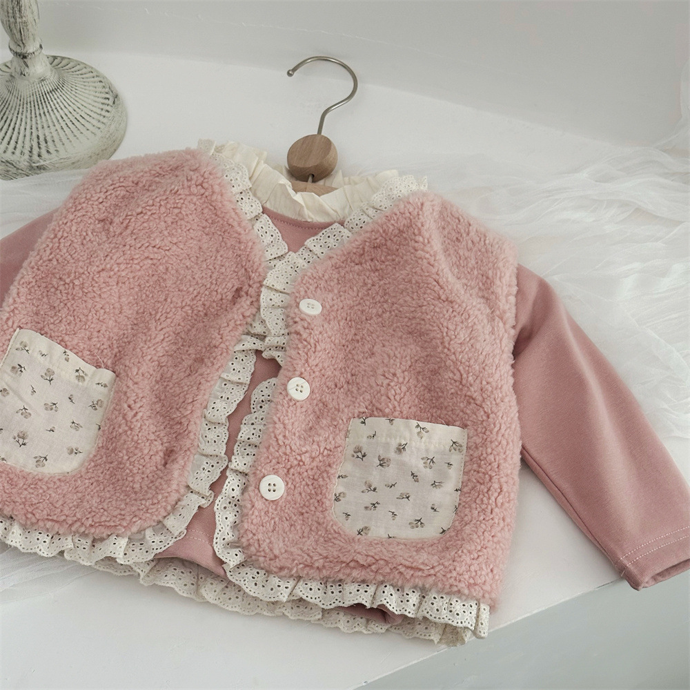가을과 겨울을위한 INS 아기 기모 조끼 아기 소녀의 레이스 포켓 따뜻한 양모 조끼