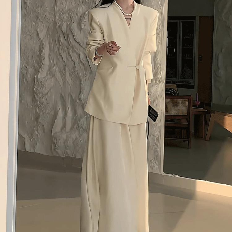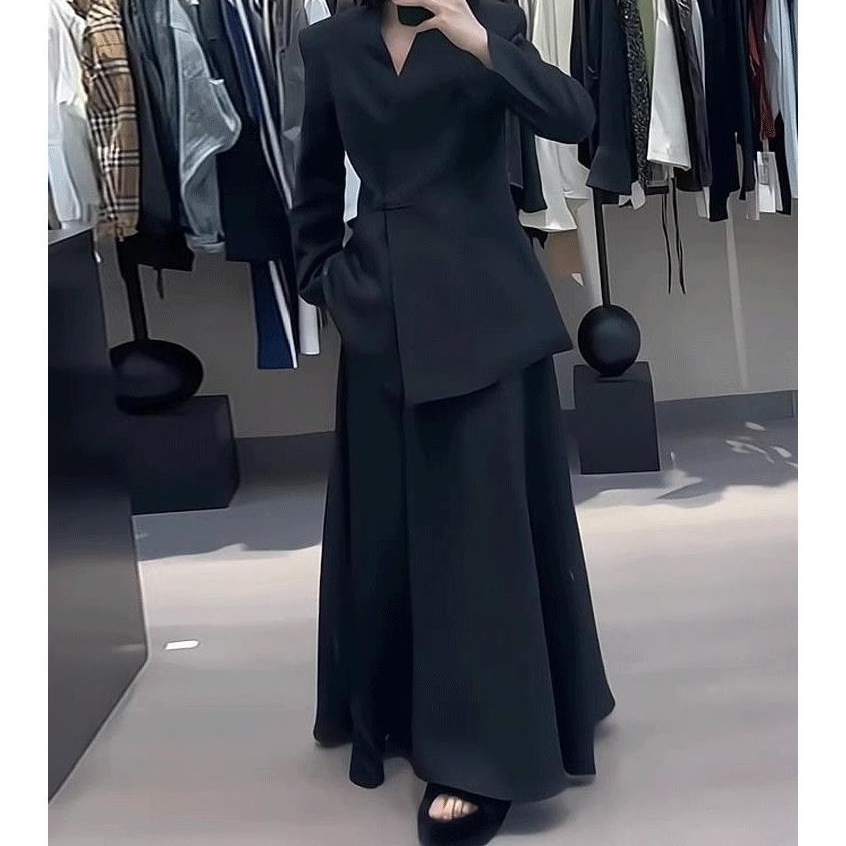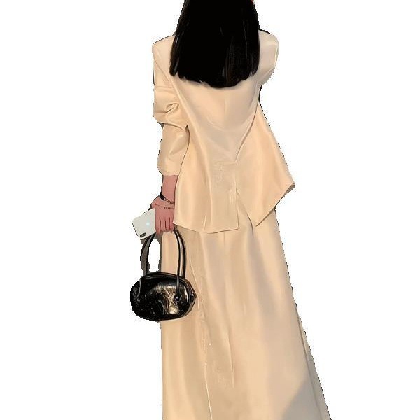 디자인 미니스트 스타일 중국 패션 세트 여성의 봄과 가을 우아한 V-넥 세트 재킷 높은 허리 A-라인 긴 원피스 투피스 세트스토어 가기