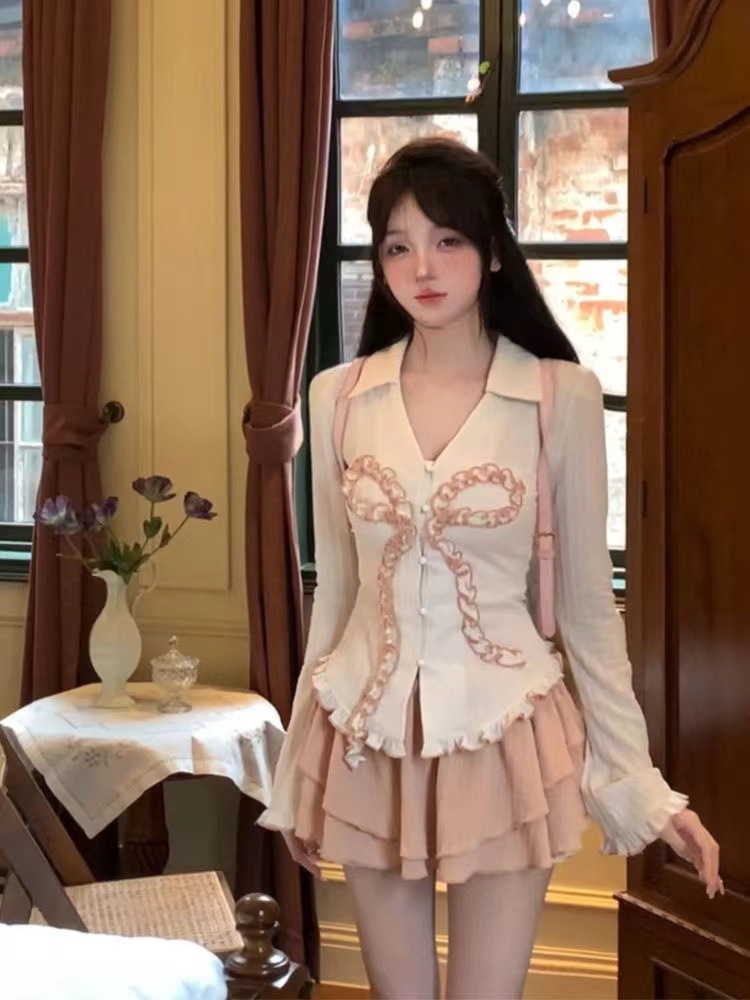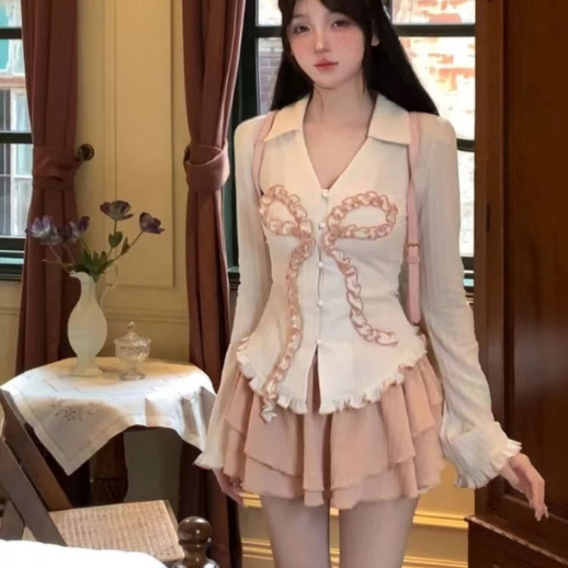 달콤하고 매운 세트 순수한 욕망 소녀 발레 하트 워터 달콤한 레이스 활 탑 슬림 핏 슬림 핏 스커트