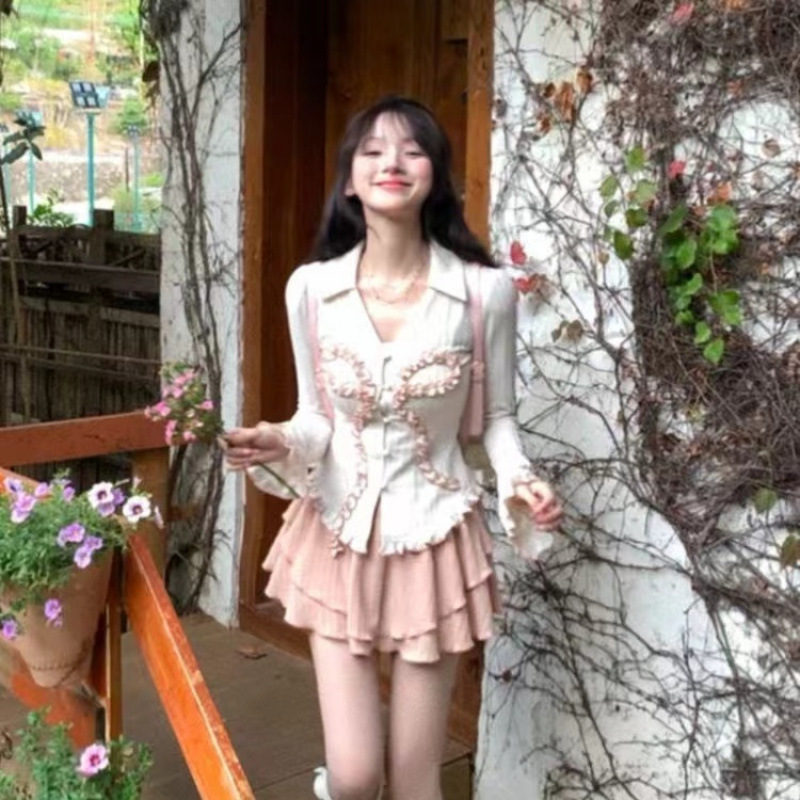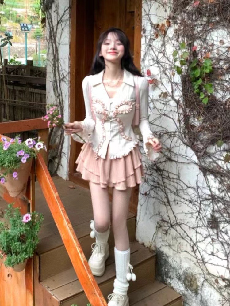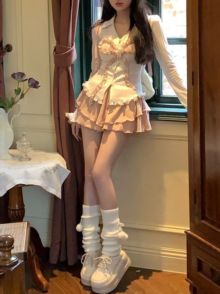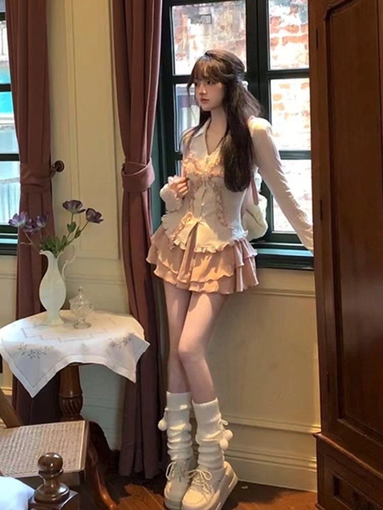 달콤하고 매운 세트 순수한 욕망 소녀 발레 하트 워터 달콤한 레이스 활 탑 슬림 핏 슬림 핏 스커트스토어 가기