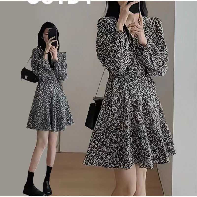 리얼 샷 2025 봄 플러스 사이즈 여성 슬림 핏 슬리밍 기질 작은 V 넥 꽃 긴 소매 원피스스토어 가기