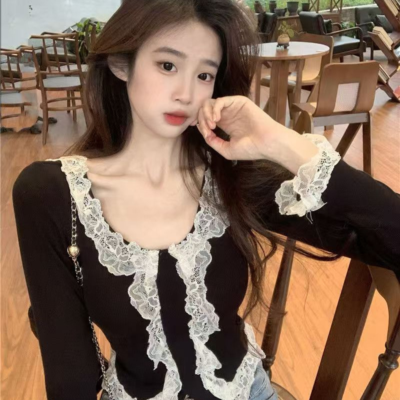 샤넬 스타일 레이스 기모 바느질 여성 가을과 겨울 새로운 슬림핏 올매치 슬리밍 우아한 짧은 트렌디 니치 탑