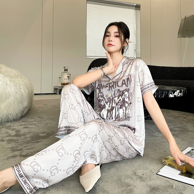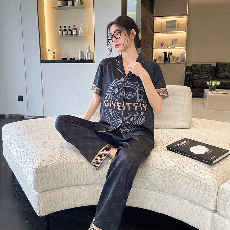 소스 공장 제품 2025 연인 아이스 실크 잠옷 여성 봄과 가을 짧은 소매 플러스 사이즈 옷깃 카디건 세트 그물 레드 라이브
