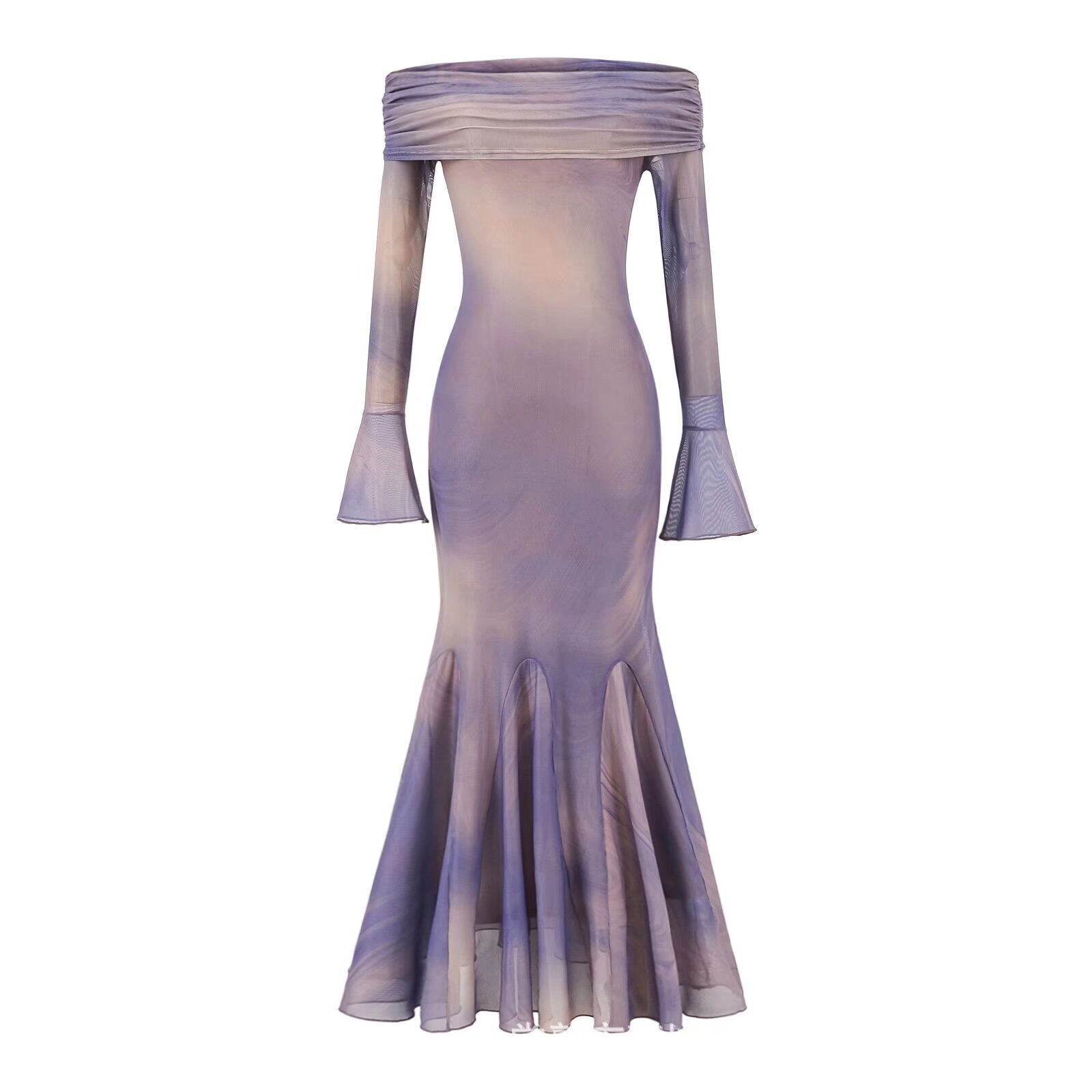 UC & ZA 국경 아마존 여성복 유럽과 미국 스타일의 섹시한 어깨 인쇄 가방 엉덩이 뿔 소매 피쉬 테일 원피스