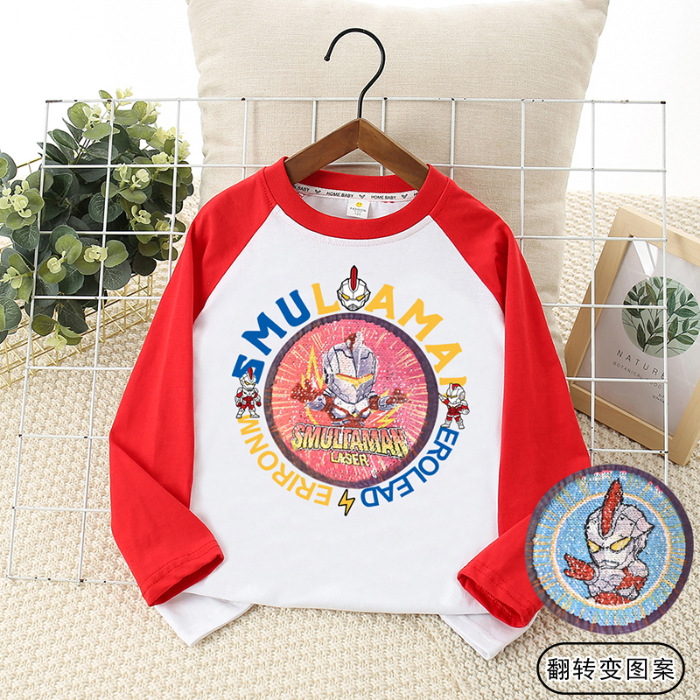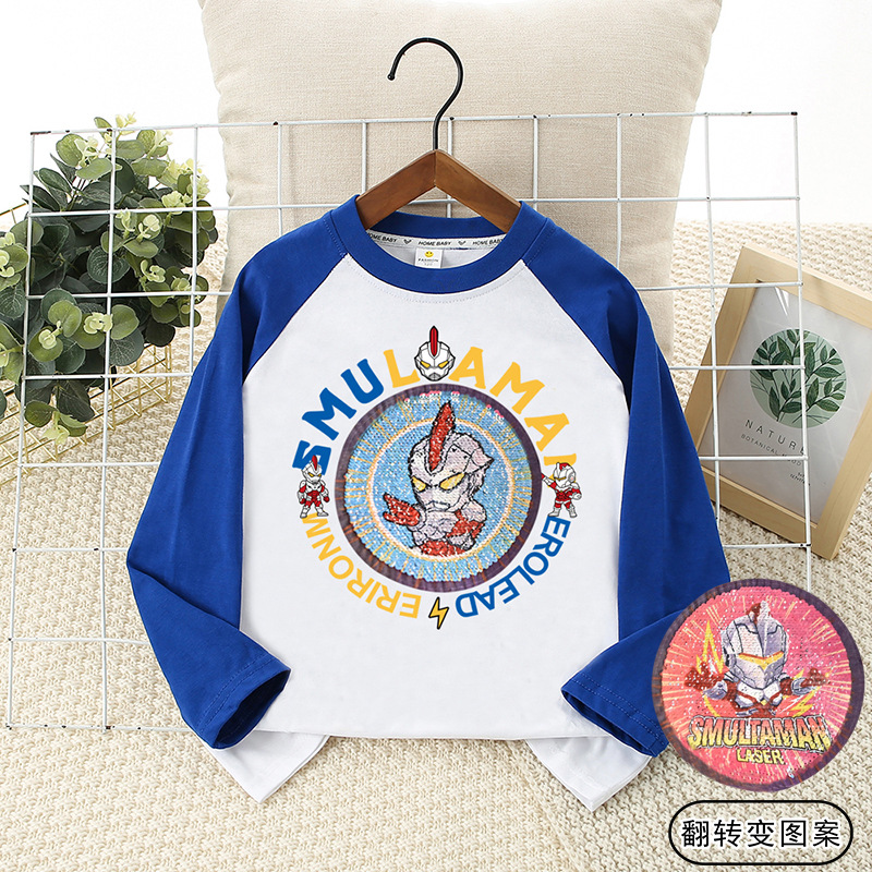 2025 년 봄과 가을 어린이 어깨 티셔츠 스팽글 턴 오버 얼굴 변화 트렌디 브랜드 소년의 둥근 목 퓨어 코튼 긴팔 탑스토어 가기