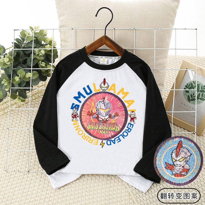 2025 년 봄과 가을 어린이 어깨 티셔츠 스팽글 턴 오버 얼굴 변화 트렌디 브랜드 소년의 둥근 목 퓨어 코튼 긴팔 탑