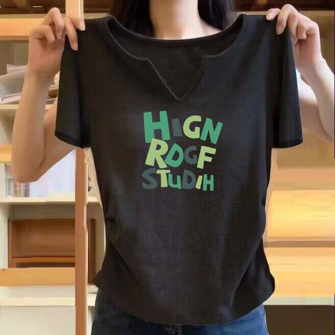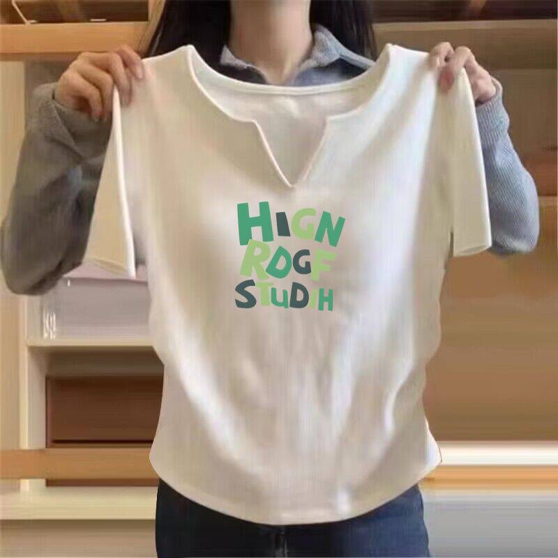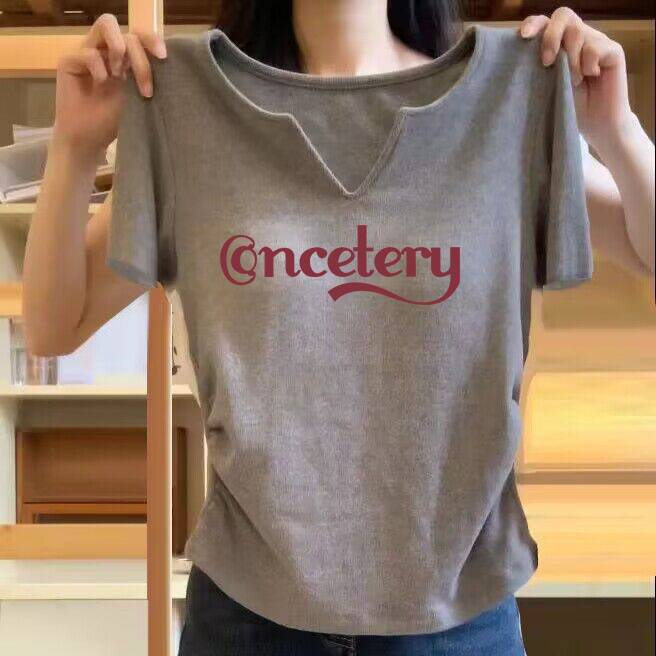 회색 V-넥 반팔 여성용 한국 스타일 봄과 여름 새로운 여성 스파이스 소녀 티셔츠 세련된 독특한 세련된 슬림 핏 프린트 탑스토어 가기