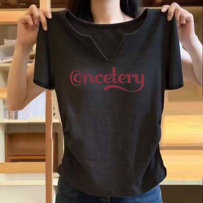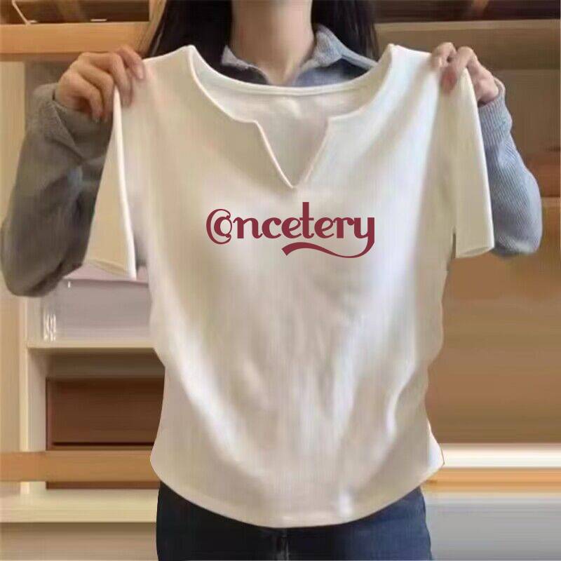 회색 V-넥 반팔 여성용 한국 스타일 봄과 여름 새로운 여성 스파이스 소녀 티셔츠 세련된 독특한 세련된 슬림 핏 프린트 탑