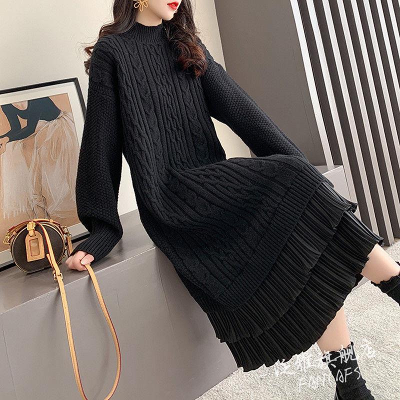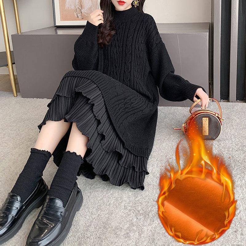기모/기모 플러스 사이즈 여성 스웨터 원피스 봄과 가을 중간 길이 무릎 루즈베이스 셔츠 스커트