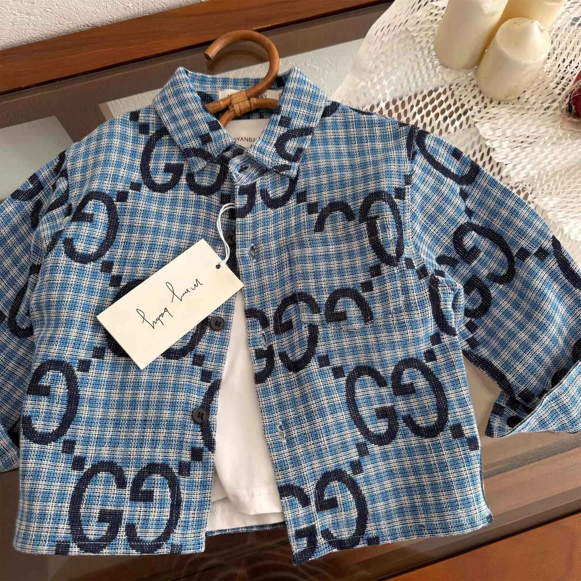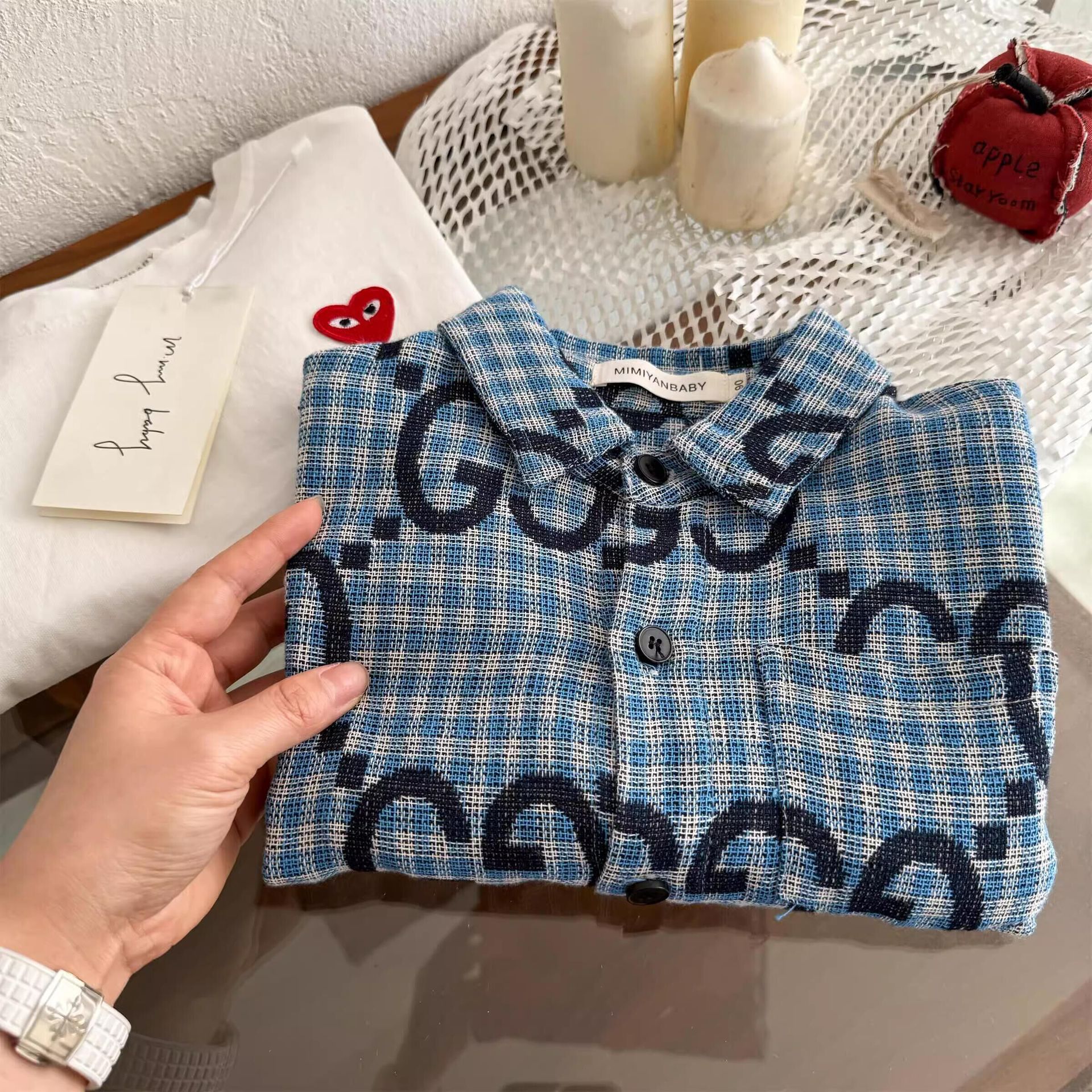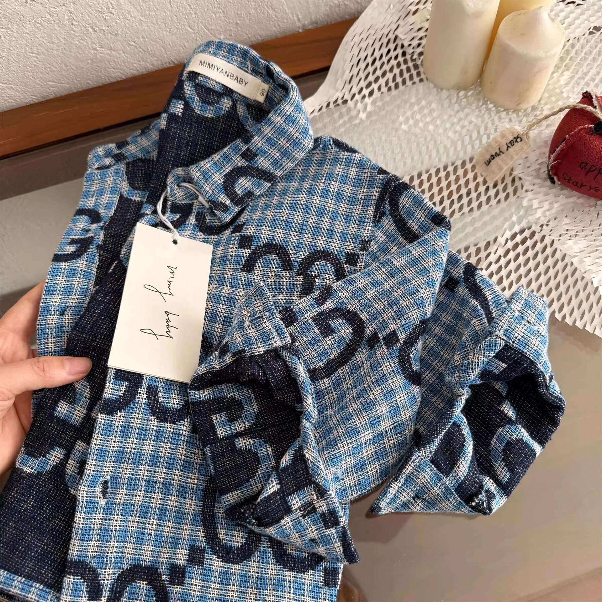 [한샤오샤오] 아동용 긴팔 셔츠, 봄 노안 트렌디 브랜드 셔츠, 베이비 풀 프린트 체크 무늬 재킷, 아동용 상의
