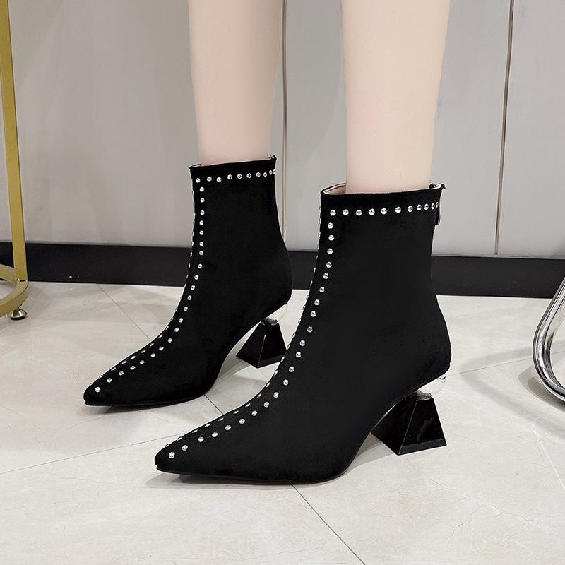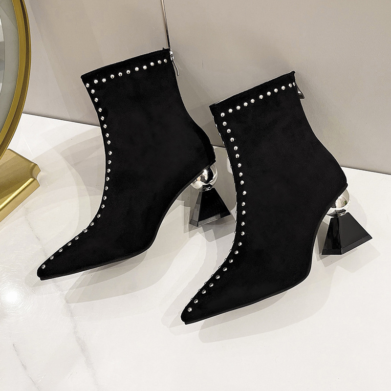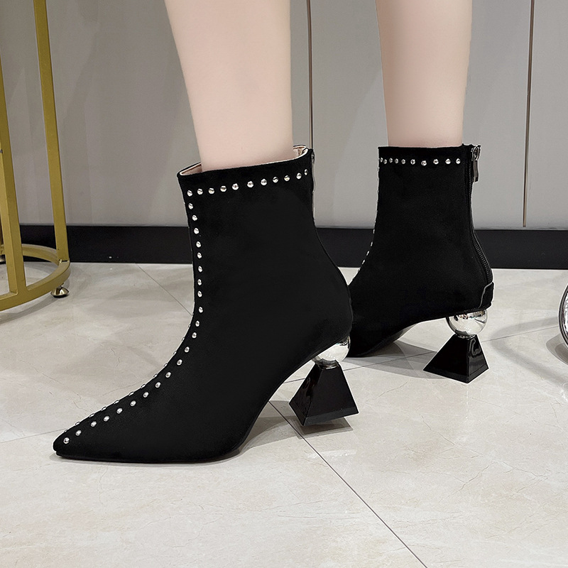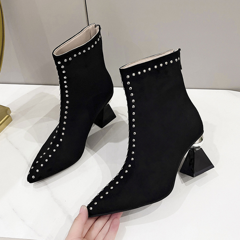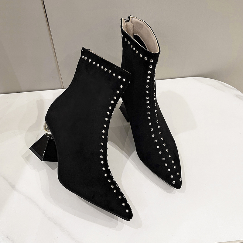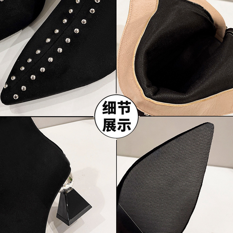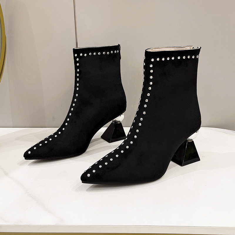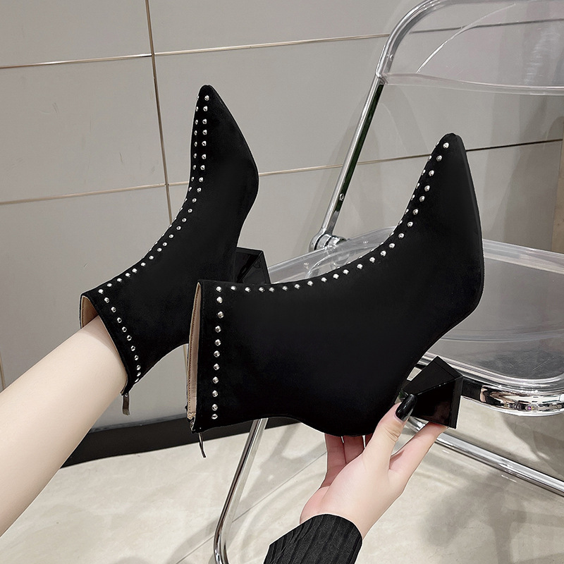 프랑스 플러스 사이즈 작은 짧은 부츠는 여전히 봄, 가을, 겨울 2025 새로운 스웨이드 뾰족한 하이힐에 여성을위한 세련되고 얇은 부츠입니다.스토어 가기